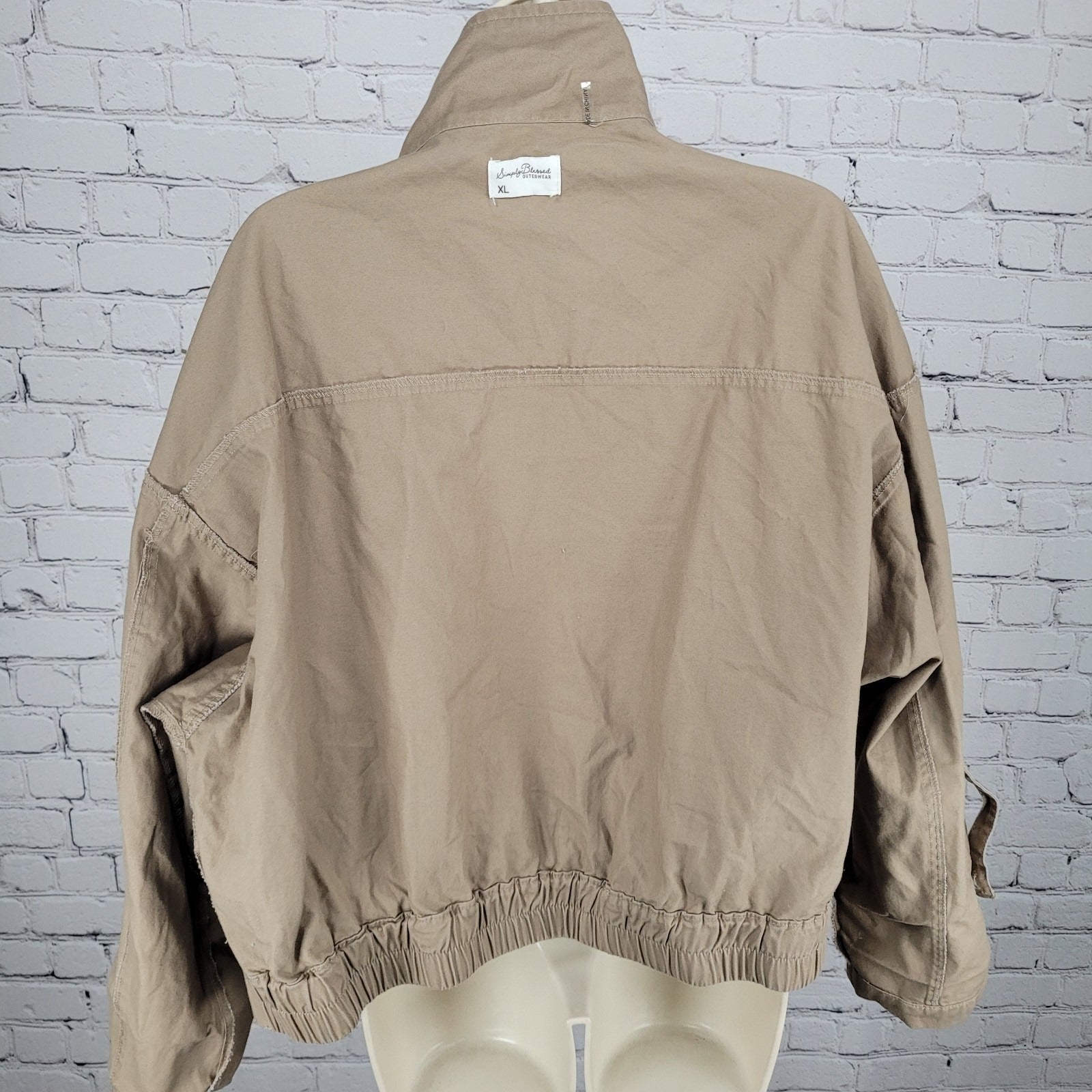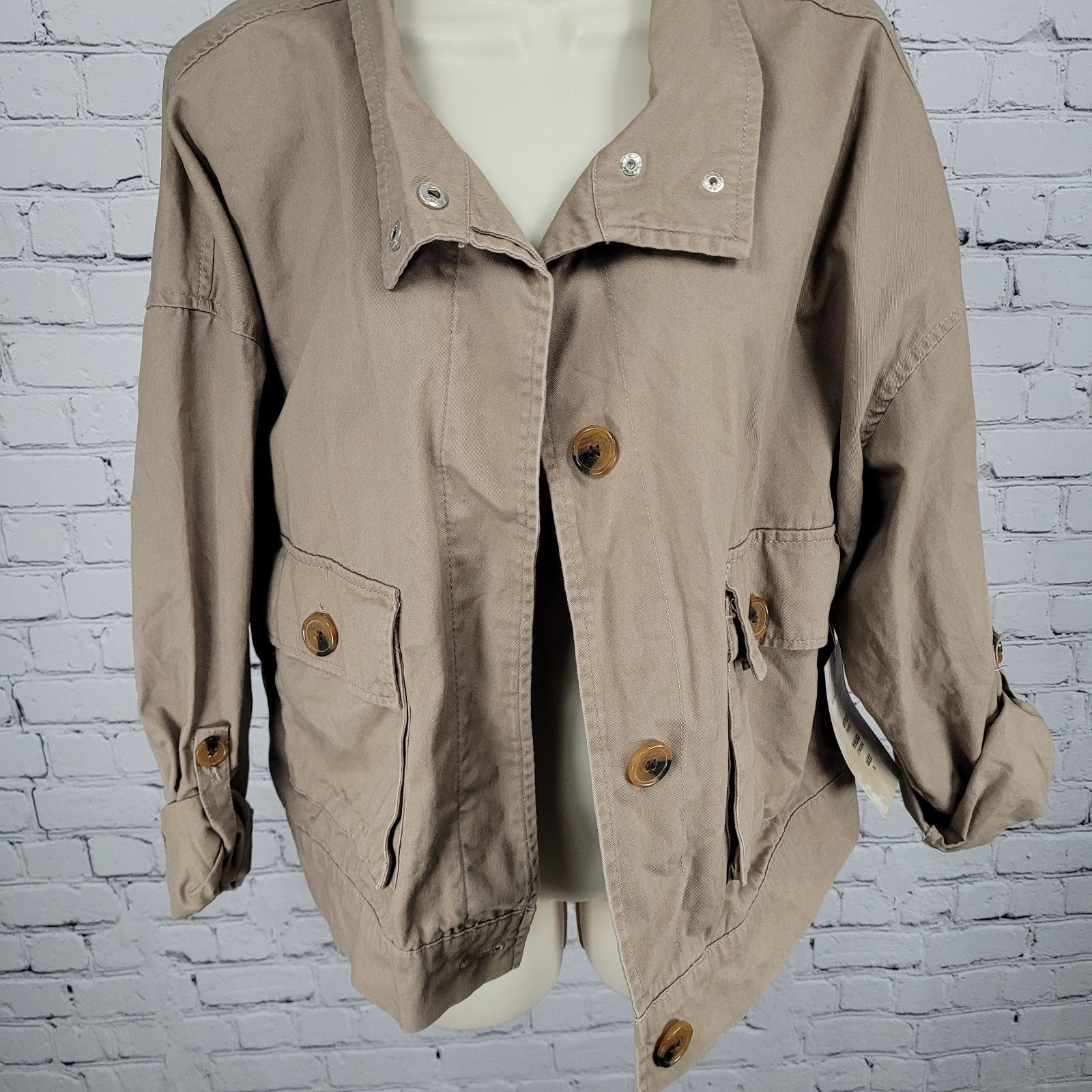 This NWT Simply Blessed light mocha brown 100% cotton twill unlined jacket in size XL is a versatile and stylish addition to any woman's wardrobe. The short length, long sleeves, button and snap closures, and collared neckline make it suitable for travel, casual outings, or workwear. With its military-style design, lightweight and packable feature, and pockets for added convenience, this jacket is perfect for the summer, fall, and spring seasons. Machine washable and easy to care for.