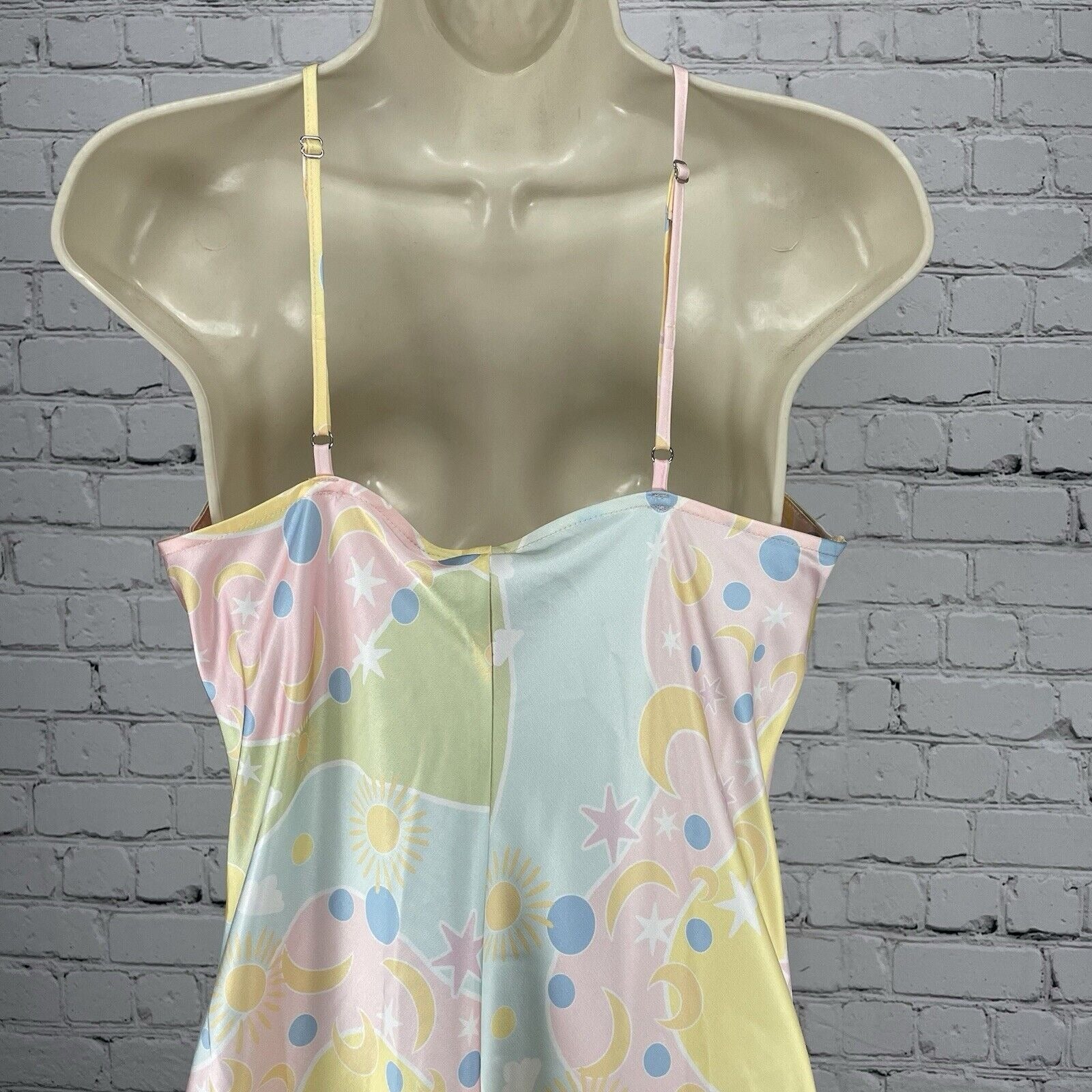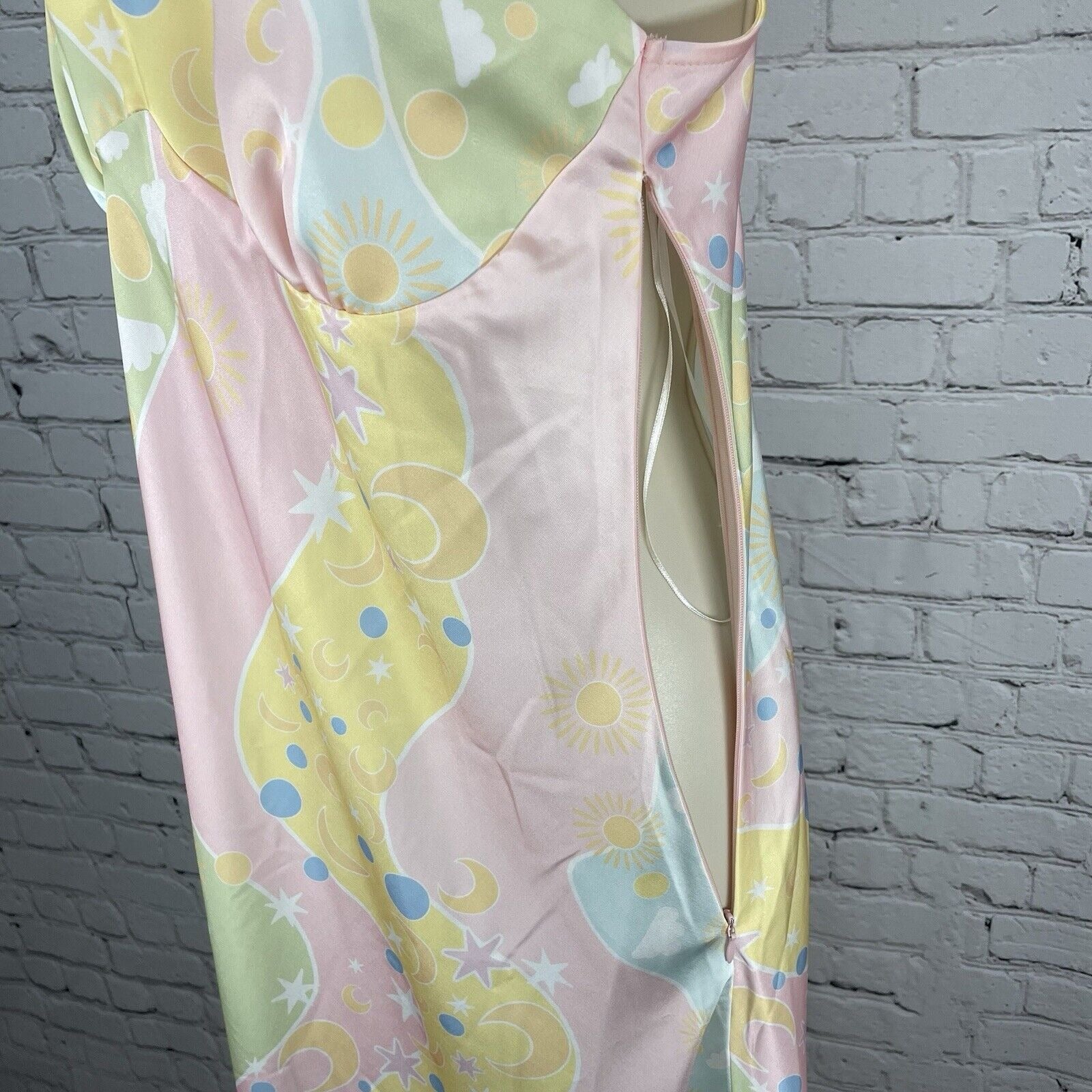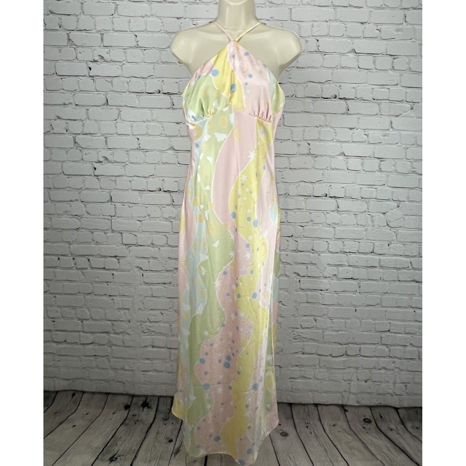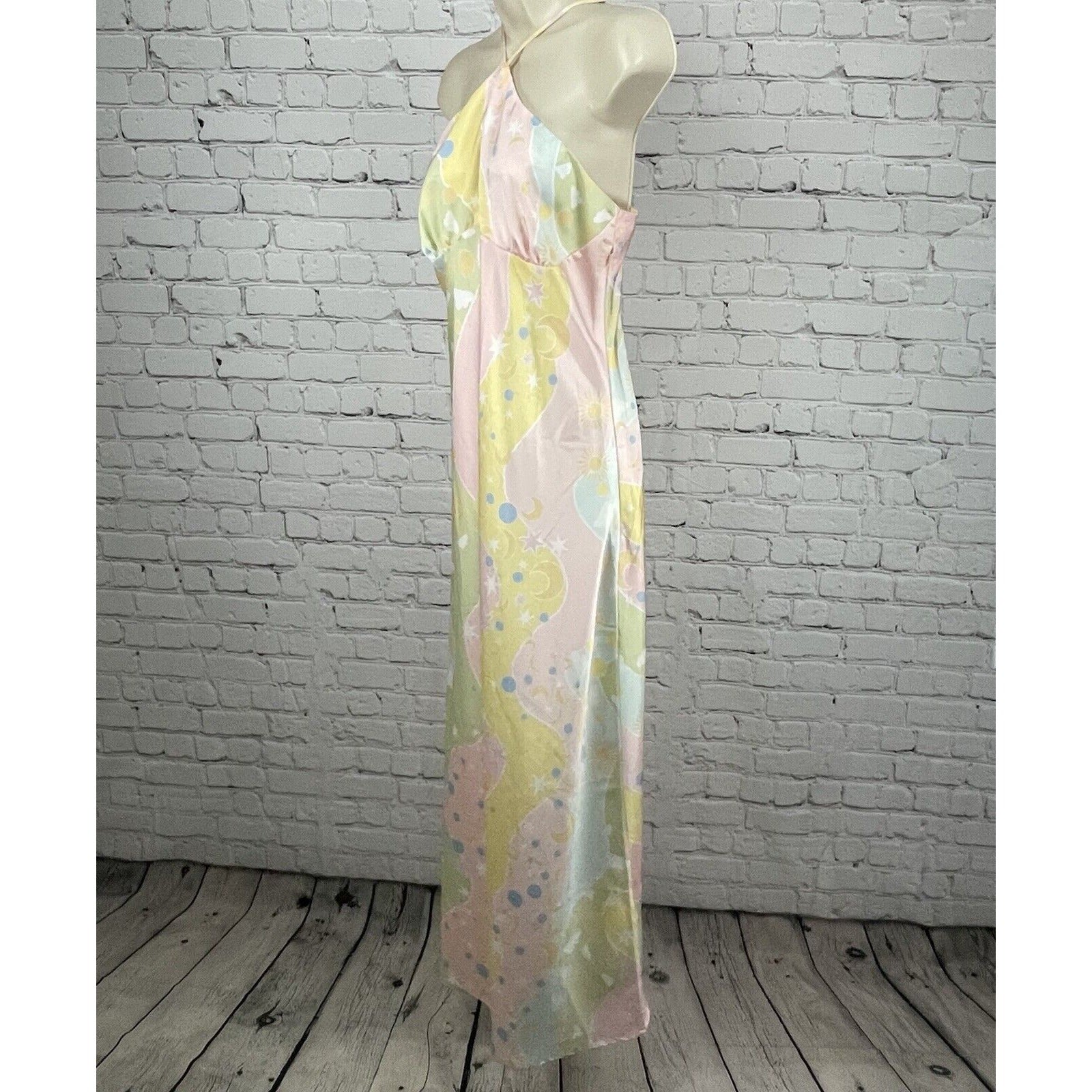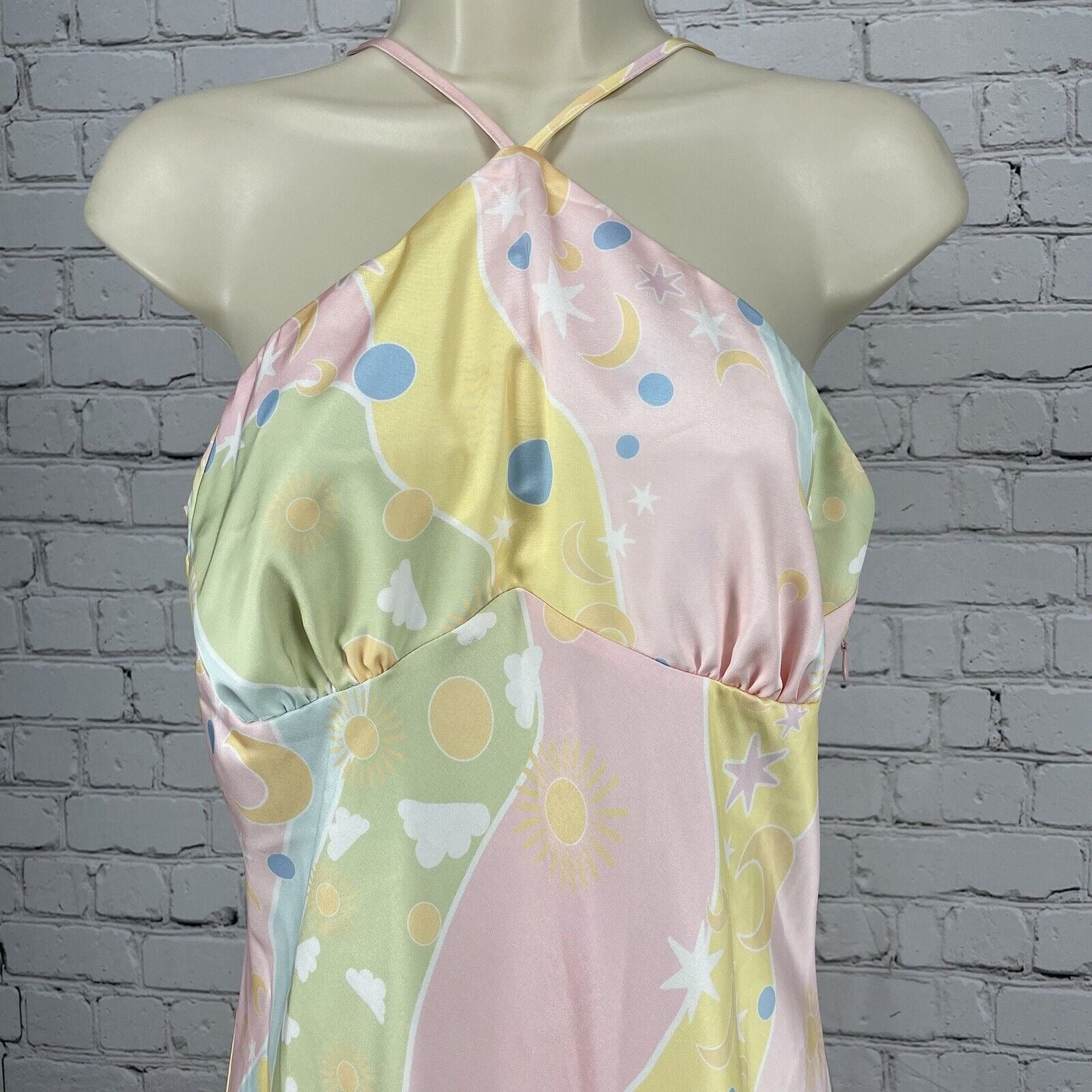 This is a new with tags (NWT) Something New Pastel Claudia Halter Ankle Maxi Dress in size Medium. The dress features a colorful Moon, Sun & Stars pattern on a sleeveless, halter neckline design with strappy sleeves. It has a zip closure for easy wear and is made of lightweight polyester material. The dress is ideal for parties, cocktails, or casual occasions during the summer or spring seasons. The adjustable fit and long dress length add to its stylish and princess-like appeal, perfect for those who appreciate a nature-themed, colorful look.