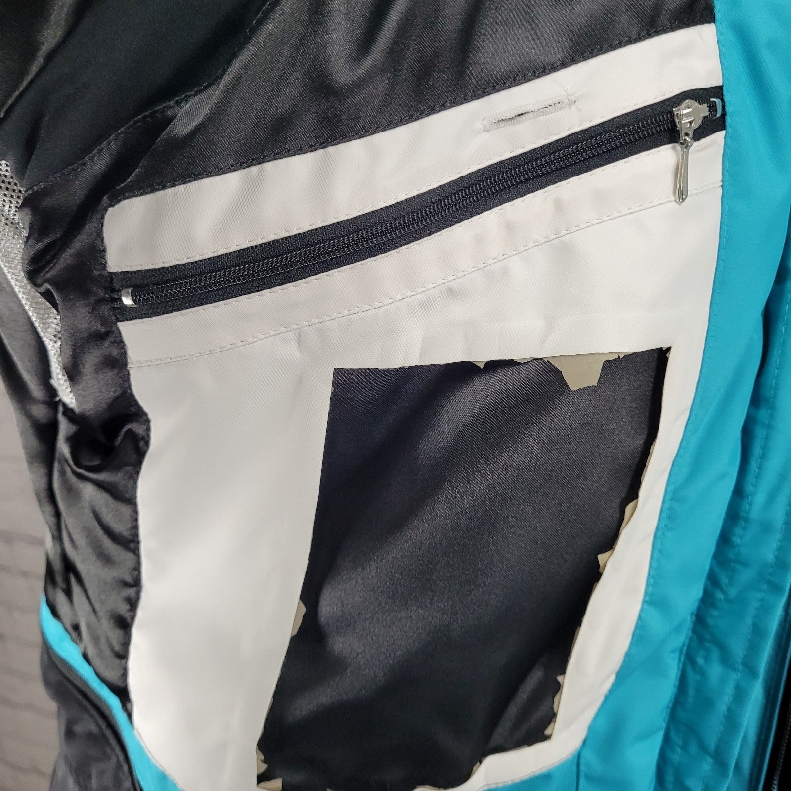 Broken zipper pull tab and inner pocket plastic sleeve removed, as pictured.