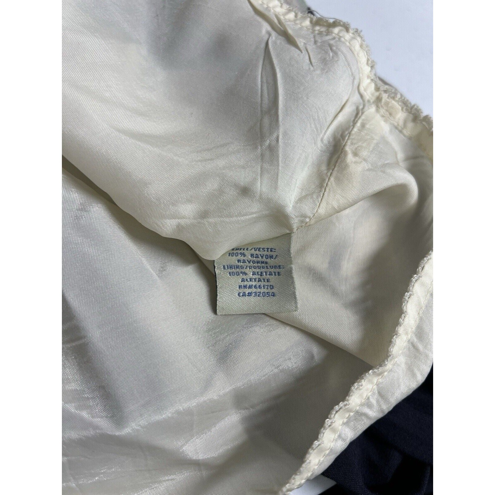 Featuring a round neckline, pullover closure, and a blouson style, this dress is both comfortable and stylish. The belted waist accentuates the figure, while the lined interior ensures a smooth and comfortable fit. This dress is a size M and is made of rayon and acetate materials. It is dry clean only and was manufactured in Indonesia.
