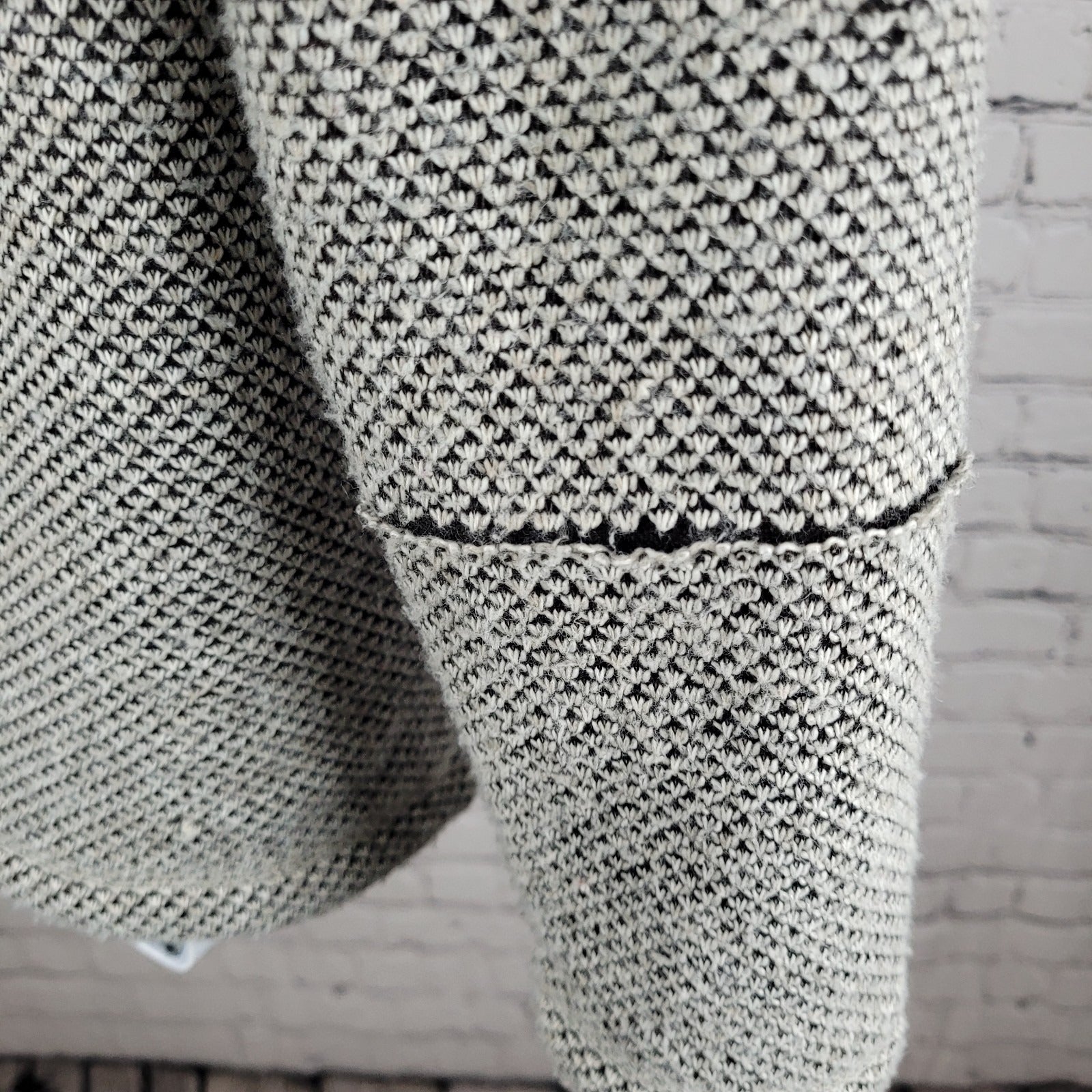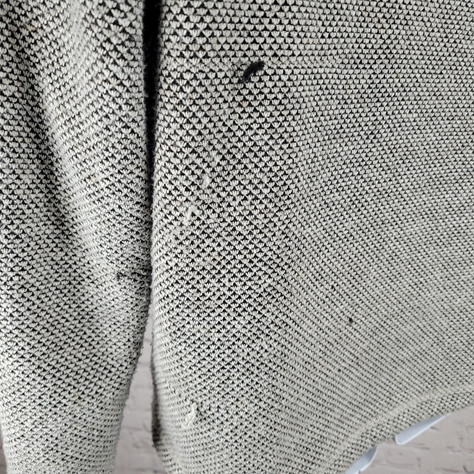 Damage to exterior knit fabric mid front & sleeve, & snags on lower backside, as pictured.