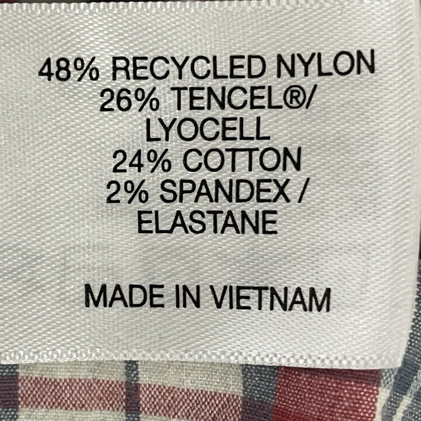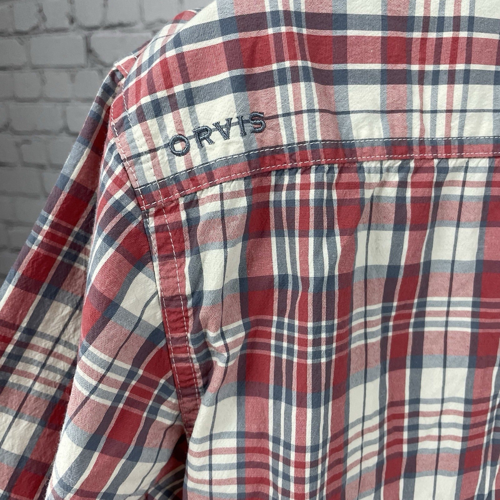 This Orvis button-down shirt in size Large features a plaid pattern in red with embroidered accents, perfect for a casual or workwear look. Made with a blend of nylon, spandex, lyocell, and cotton, this lightweight shirt has a collared neckline and short sleeves, ideal for outdoor activities or everyday wear. With a regular fit and chest size of 44 inches, this shirt also includes a button-down collar and pockets for added functionality, making it a versatile and stylish addition to any wardrobe.