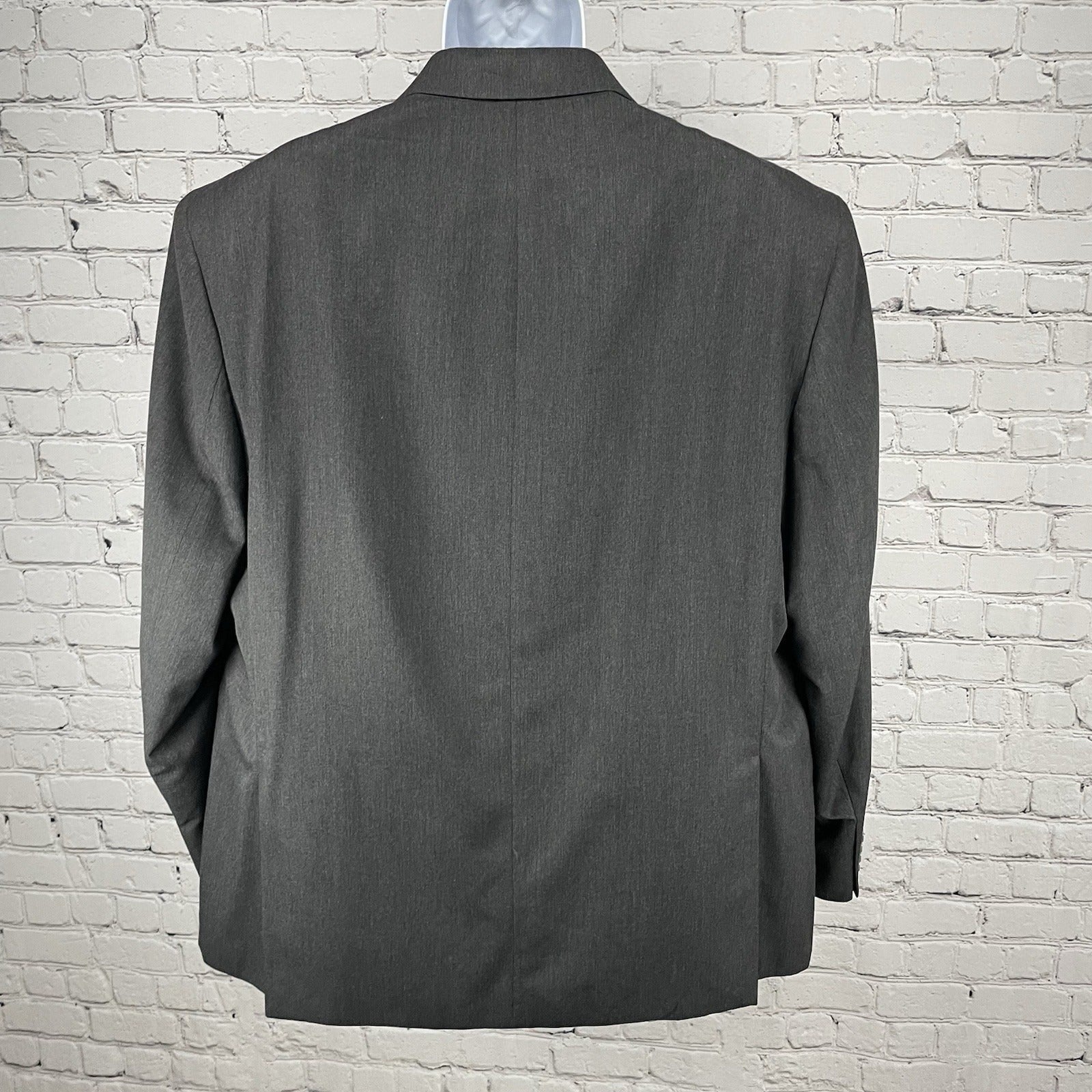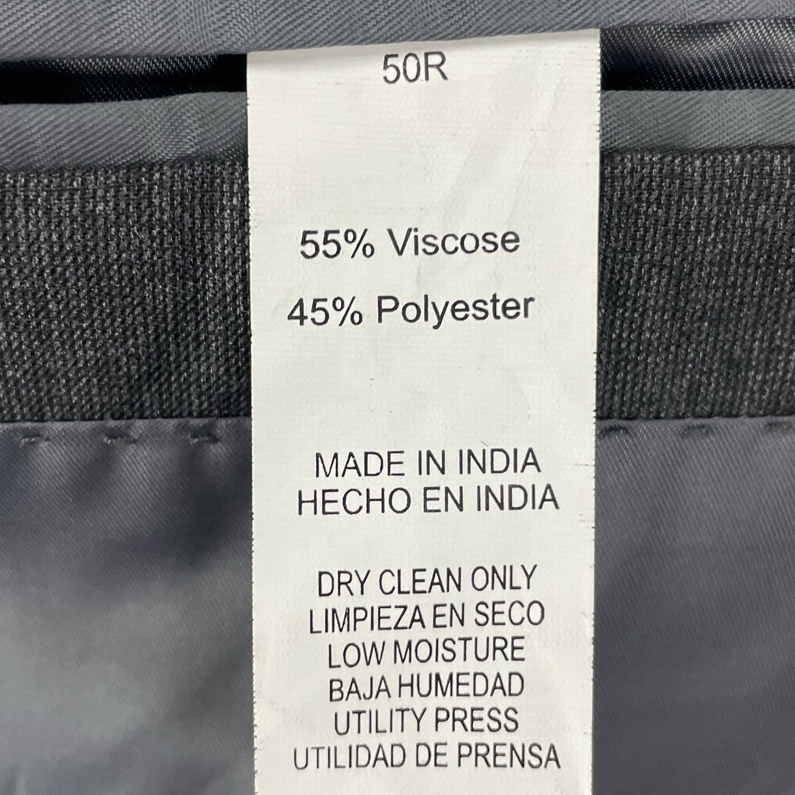 The size 50R blazer is designed to impress with its solid pattern and subtle texture that emerges from the blend of polyester and viscose. Attention to detail is evident in the four-button sleeve styling and the practicality of inner pockets. For longevity and sustained appearance, this garment requires dry cleaning.
