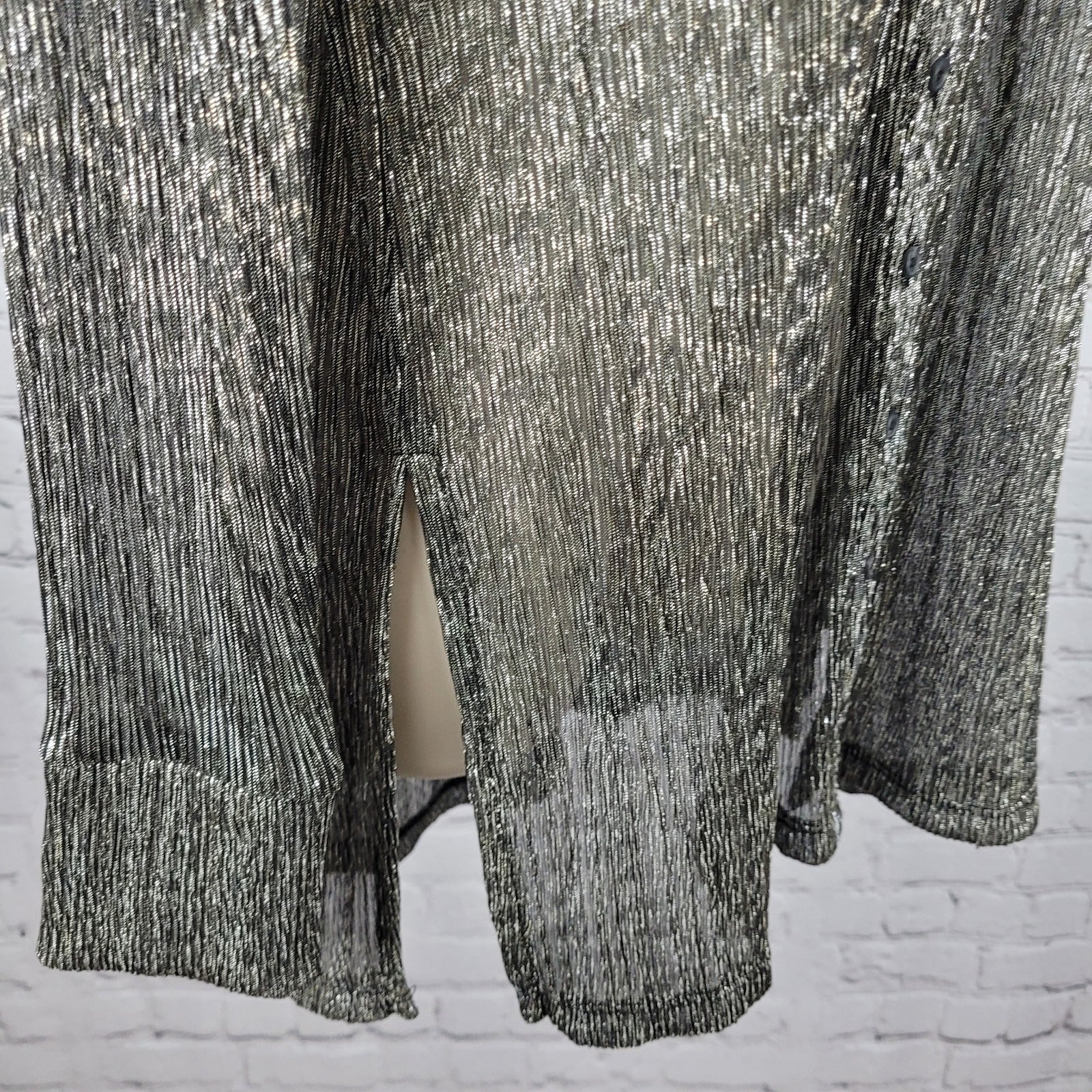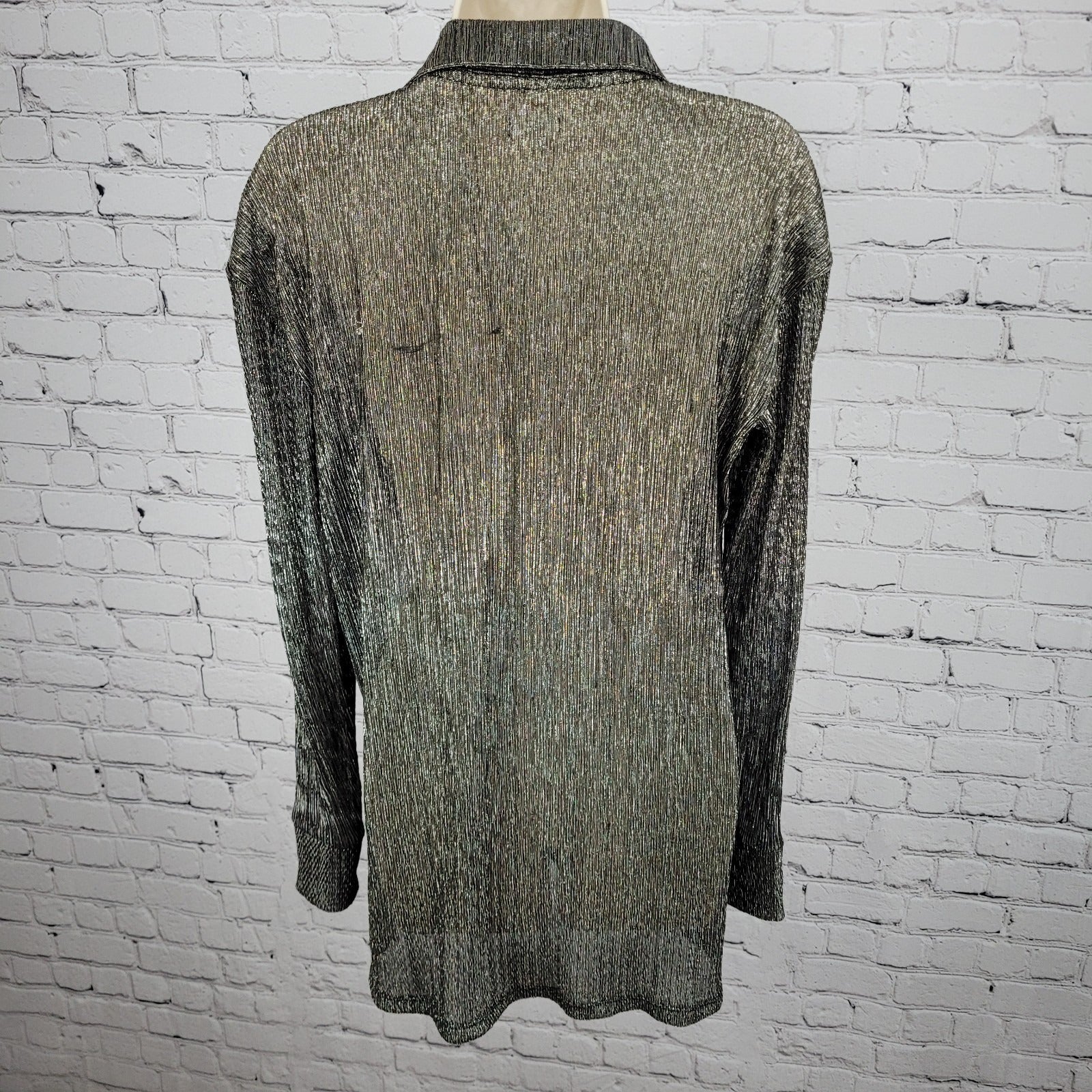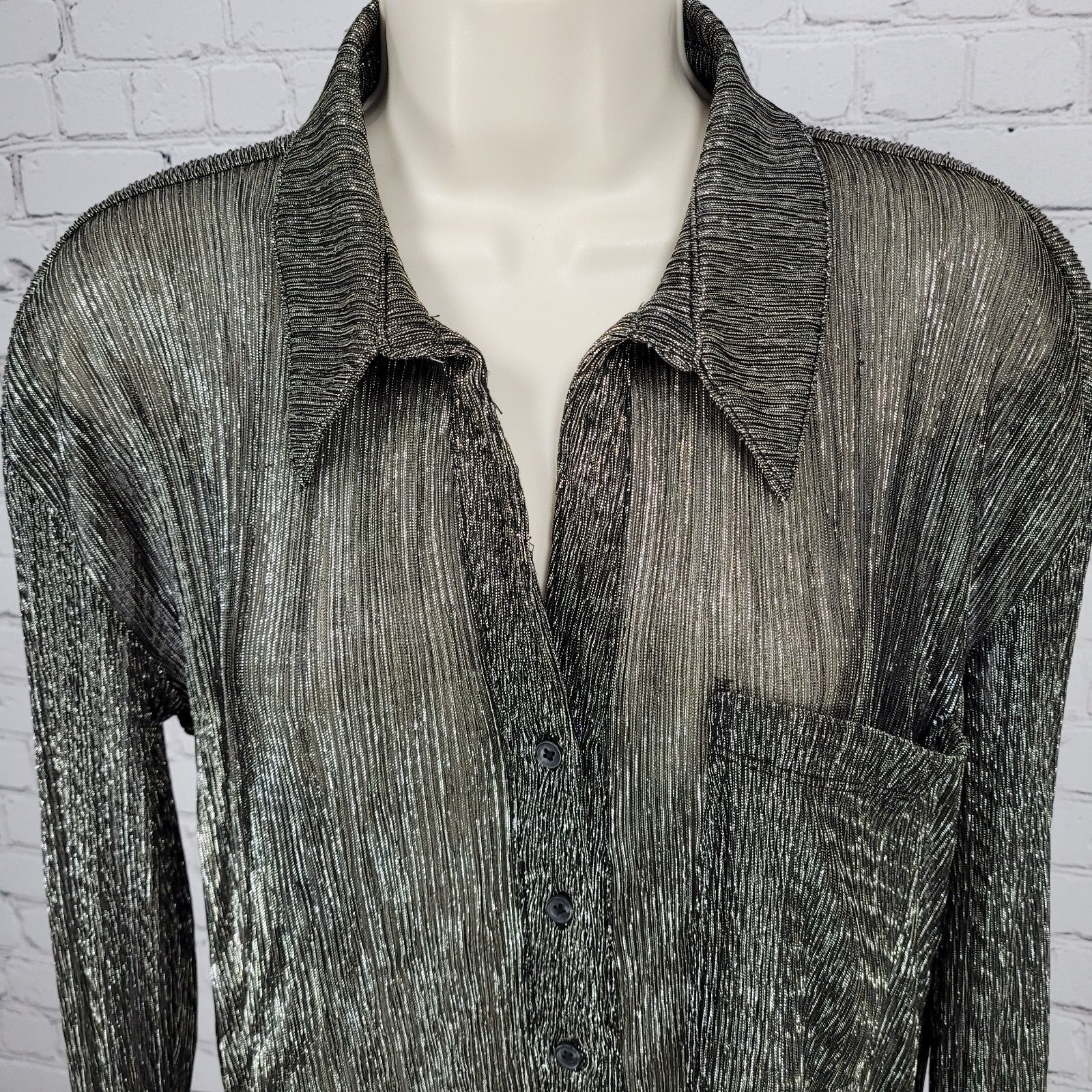 The Pilcro Anthropologie Black Silver Metallic Sheer Long Sleeve Top in Size Small is a versatile and stylish addition to any wardrobe. Made from a lightweight polyester and metallic fabric, this top features a collared neckline, button closure, and relaxed fit. Perfect for both casual and party occasions, it is easy to care for with machine washable instructions. The black color adds a classic touch, while the silver metallic detail adds a touch of sparkle.