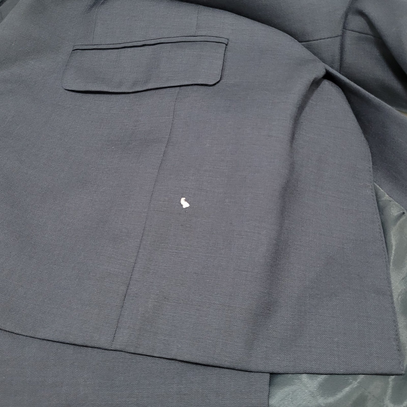 Undone stitching near closure (cannot see when buttoned) hole in lower side, and light staining front bottom hem, as pictured.