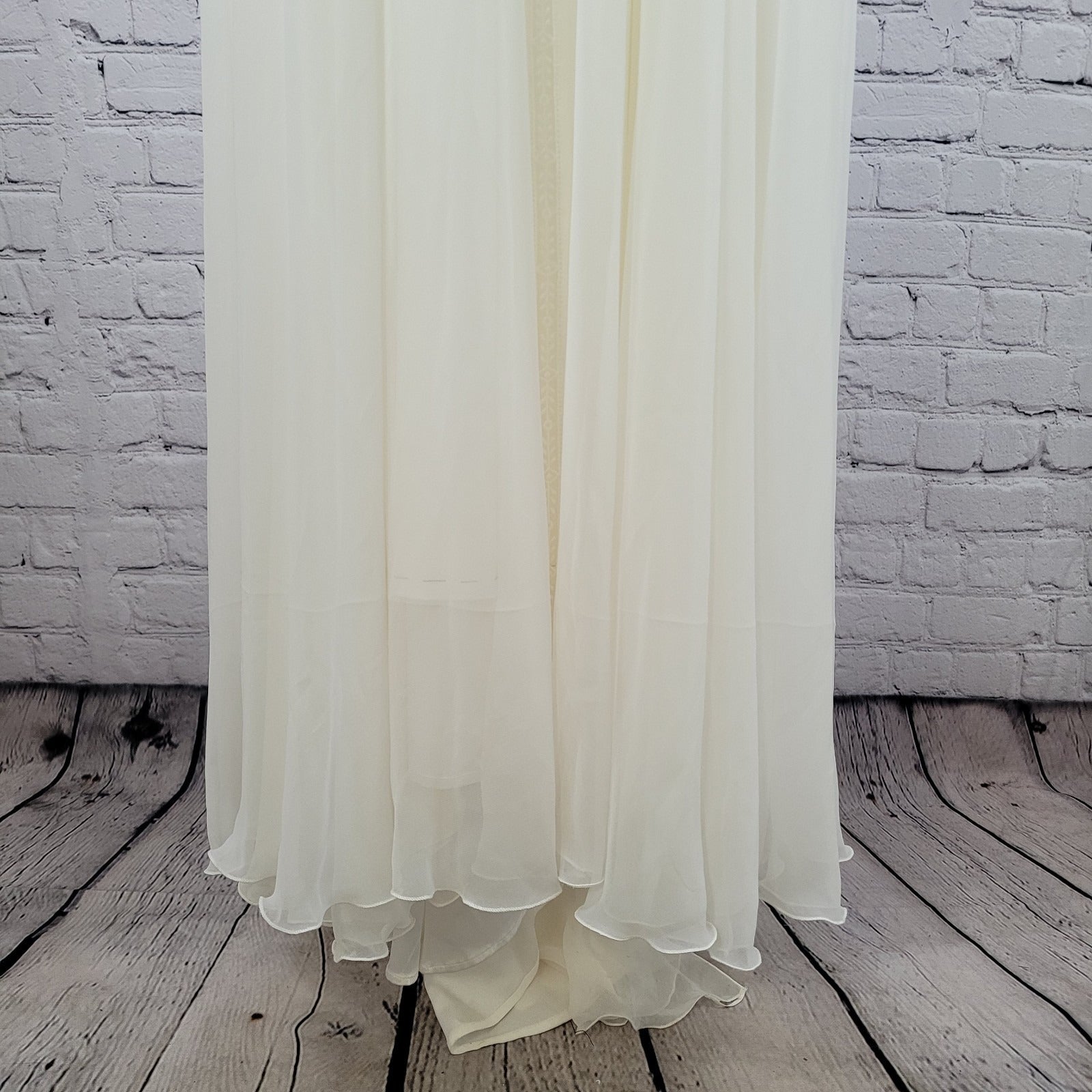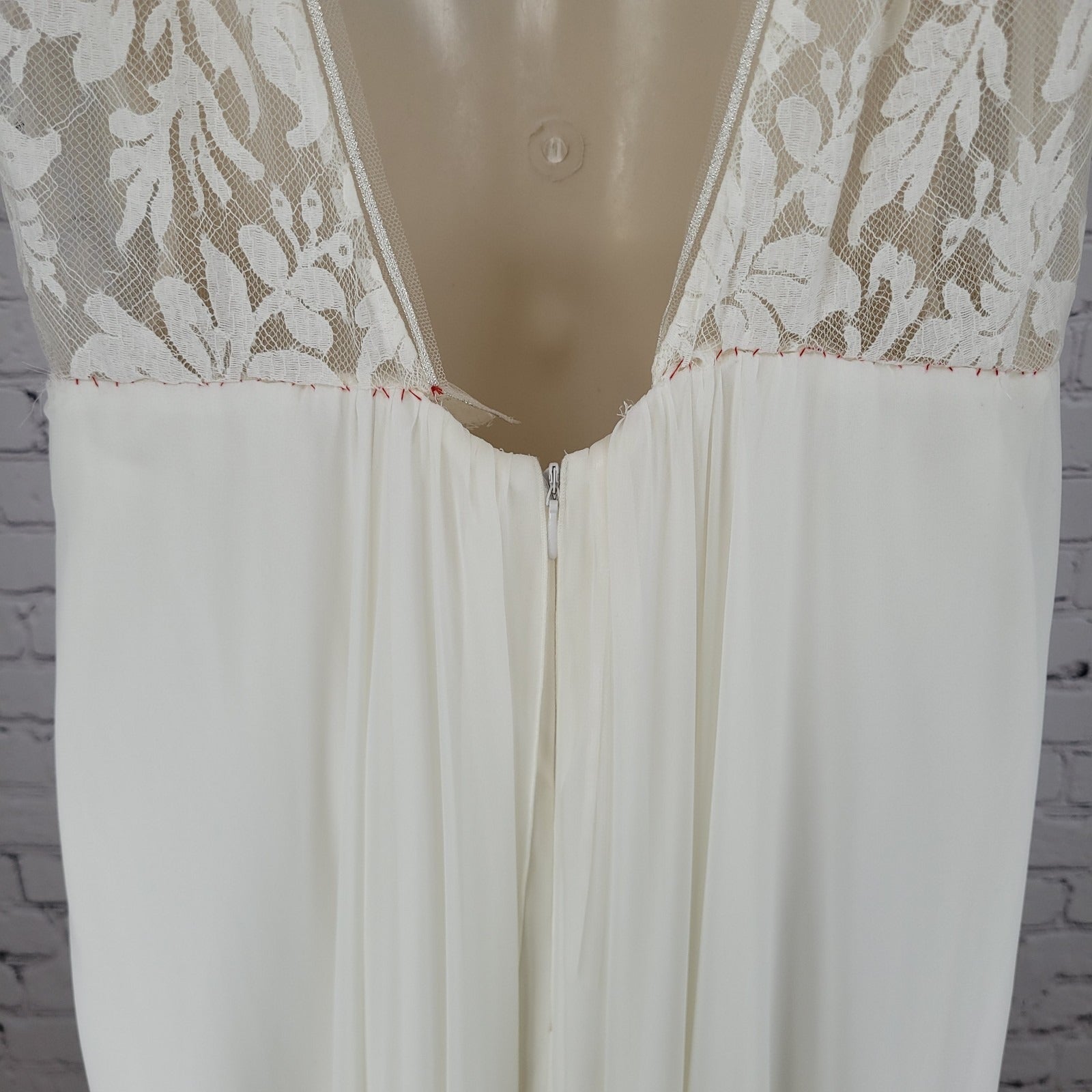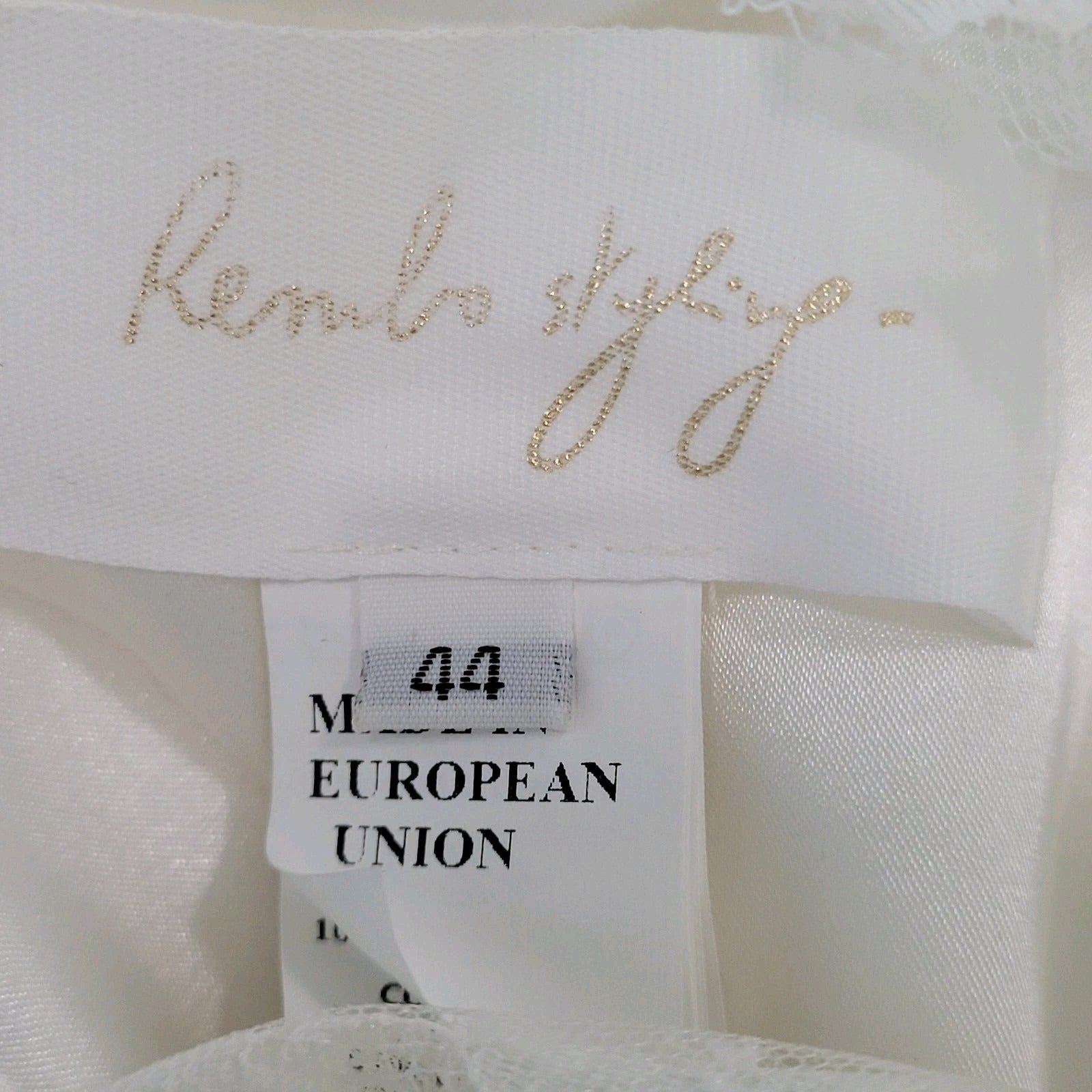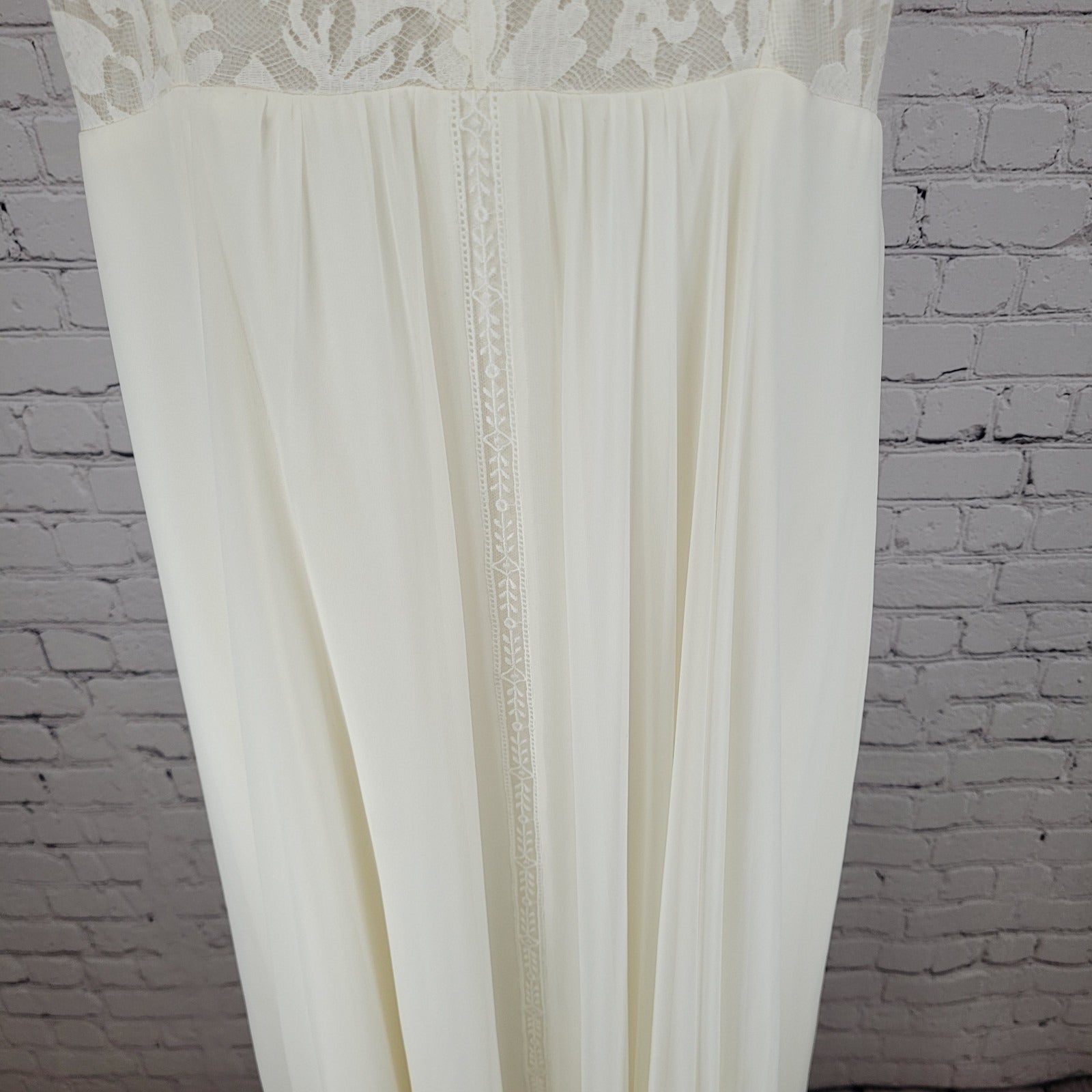 The Rembo Styling Ivory Lace Padded Top Wedding Dress is a stunning formal gown perfect for a bride or special occasion. Made in Europe, this size US XL dress features a feminine style with a delicate ivory lace top and padded design. With a chest size of 34 inches and a shoulder to hem length of 62 inches, this dress is sure to make a timeless statement.