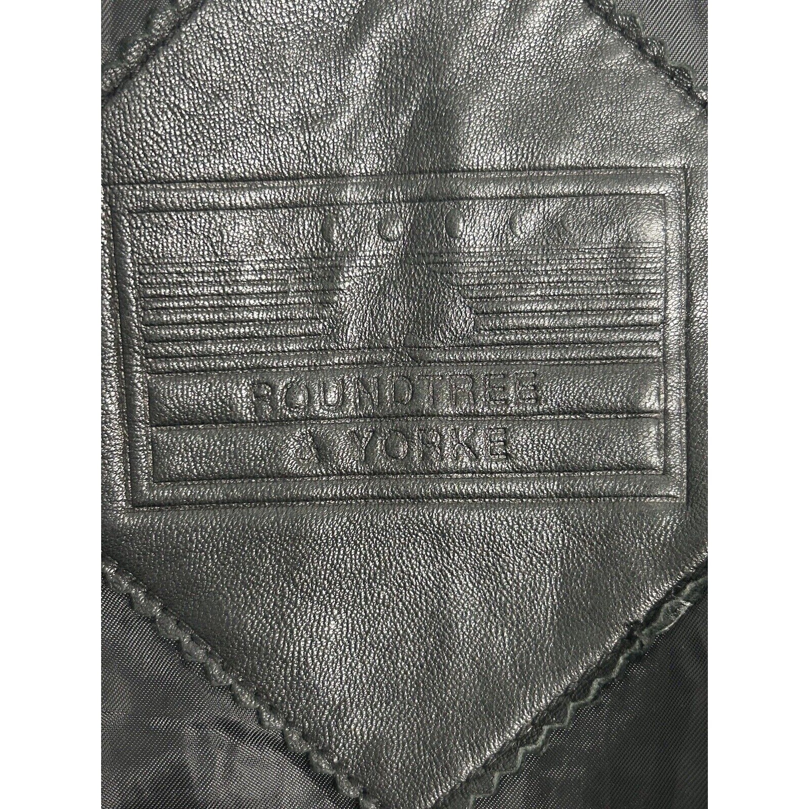 This black lambskin leather jacket from Roundtree & Yorke is a classic addition to any wardrobe. The long-sleeved jacket features a spread collar and button closure, with accents that include buttons and the brand's logo. The jacket is fully lined with polyester and has inner and outer pockets. It is available in size L and fits regular size types. The jacket is ideal for various occasions, including travel, business, and casual wear. It is recommended that the jacket be dry cleaned only.