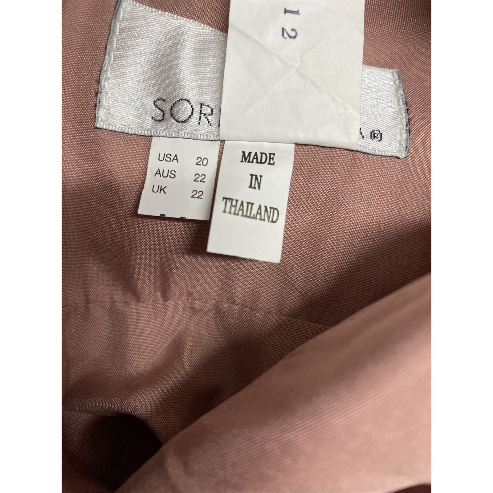 This stunning Sorella Vita bridesmaid dress in blush pink is a must-have for any special occasion. The dress features a flattering V-neckline, a built in bra, bones, a sleeveless design, and a long flowing skirt for a graceful look. Made with high-quality polyester material, this dress is both comfortable and durable, perfect for a night of dancing and celebrating. The dress is a size 20, and the back zip ensures a secure and comfortable fit. Personalization is not available for this item. Designed and manufactured in Thailand, this dress is perfect for any formal occasion.