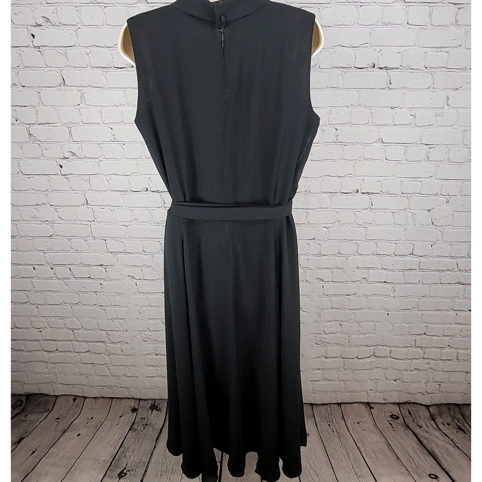 The Spencer Jeremy 100% Silk Chiffon Belted Shawl Collar Midi Dress in size 10 is a elegant and versatile piece perfect for various occasions. Made of luxurious silk chiffon, this sleeveless dress features a collared neckline and a belted waist for a flattering silhouette. The A-line style and classic black color make it a timeless wardrobe staple suitable for both casual and formal events. With a zip closure and dry clean only care instruction, this dress is a sophisticated choice.