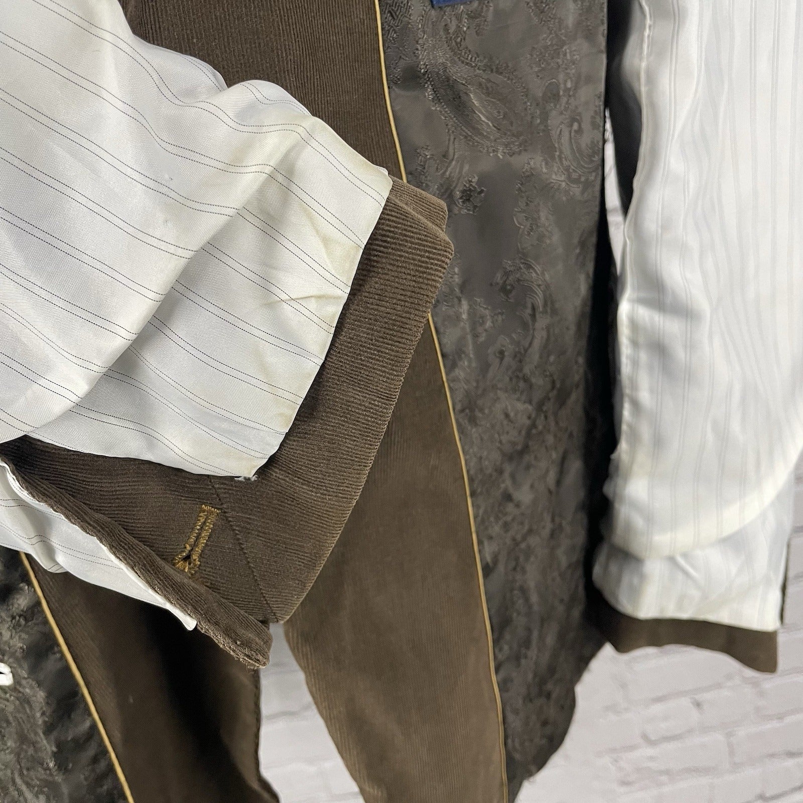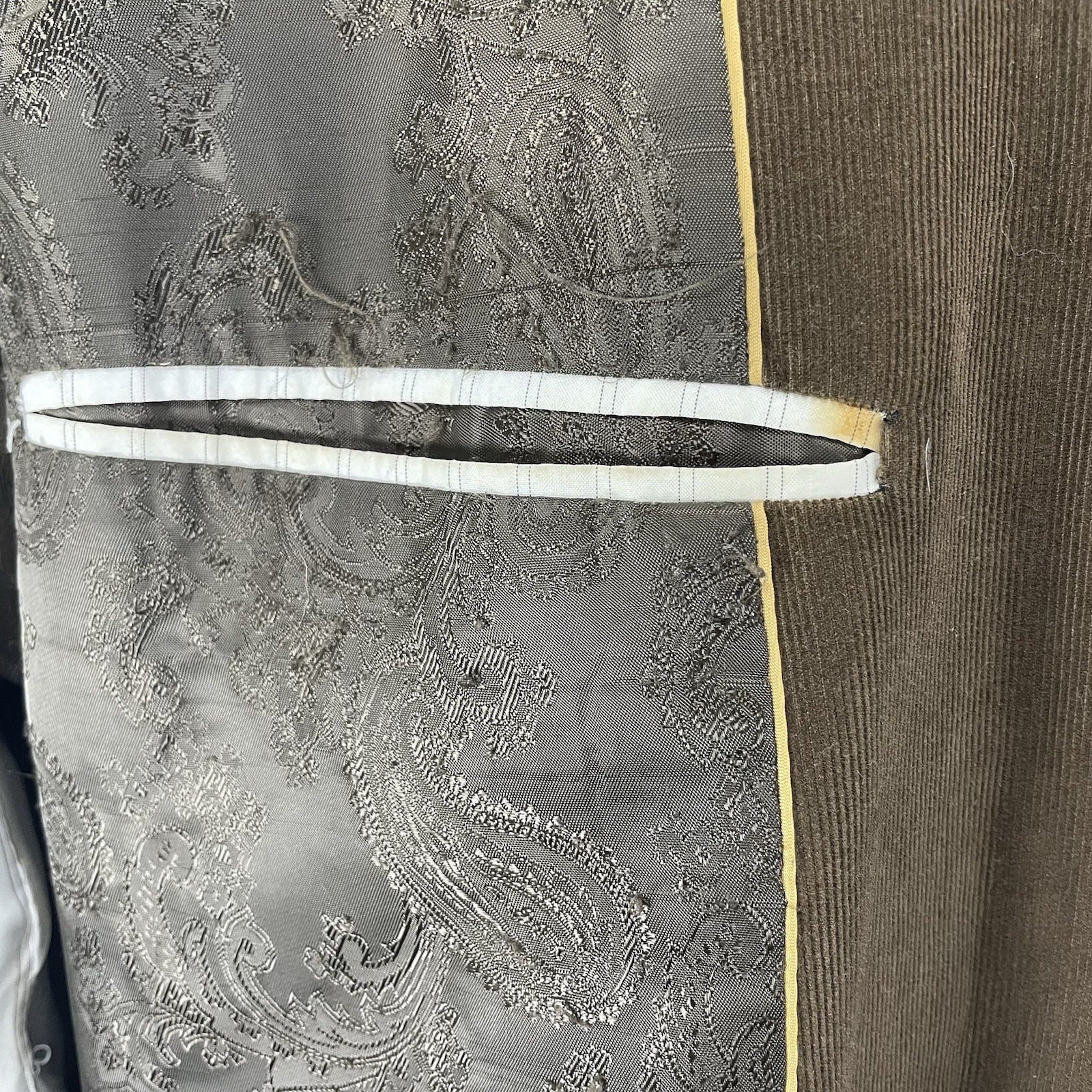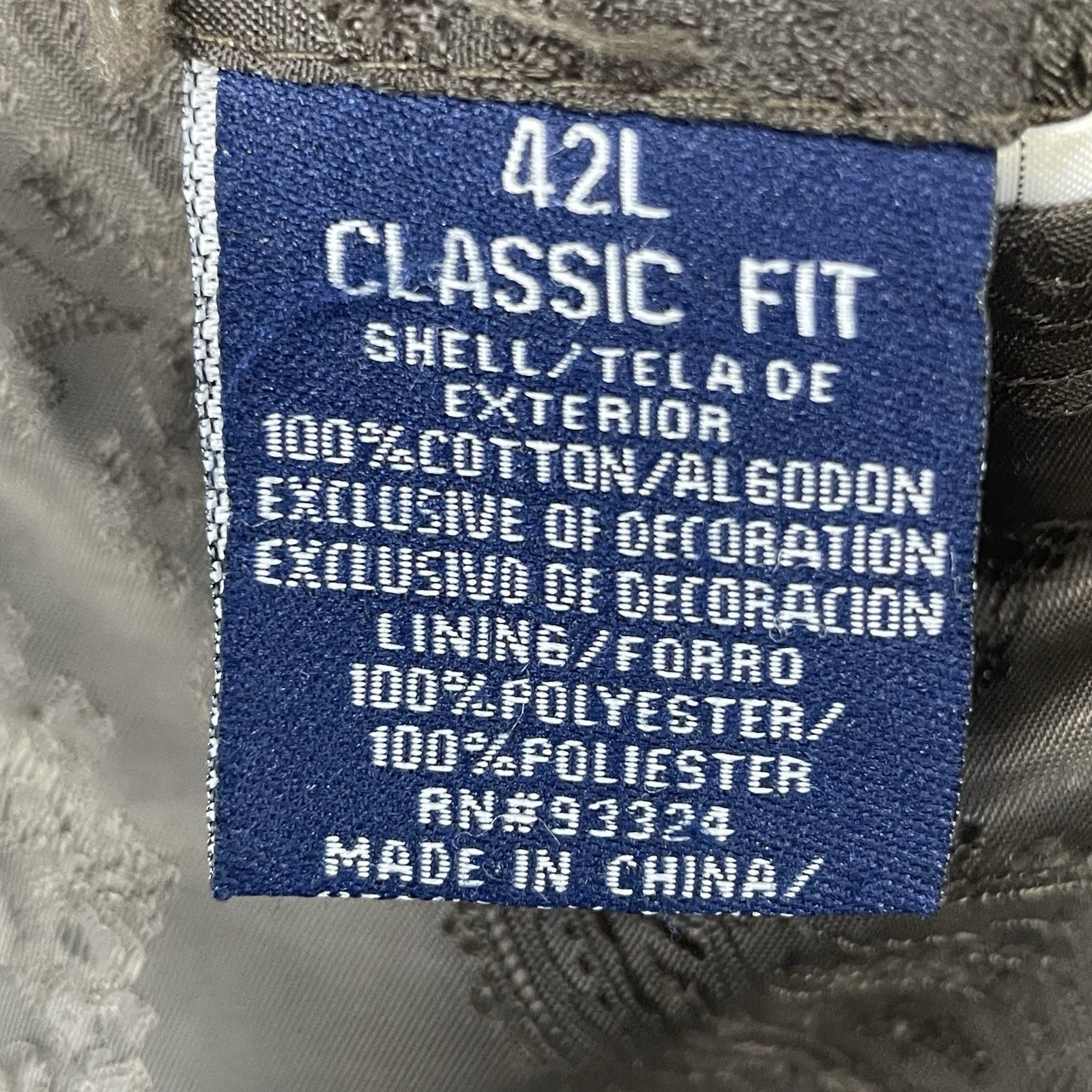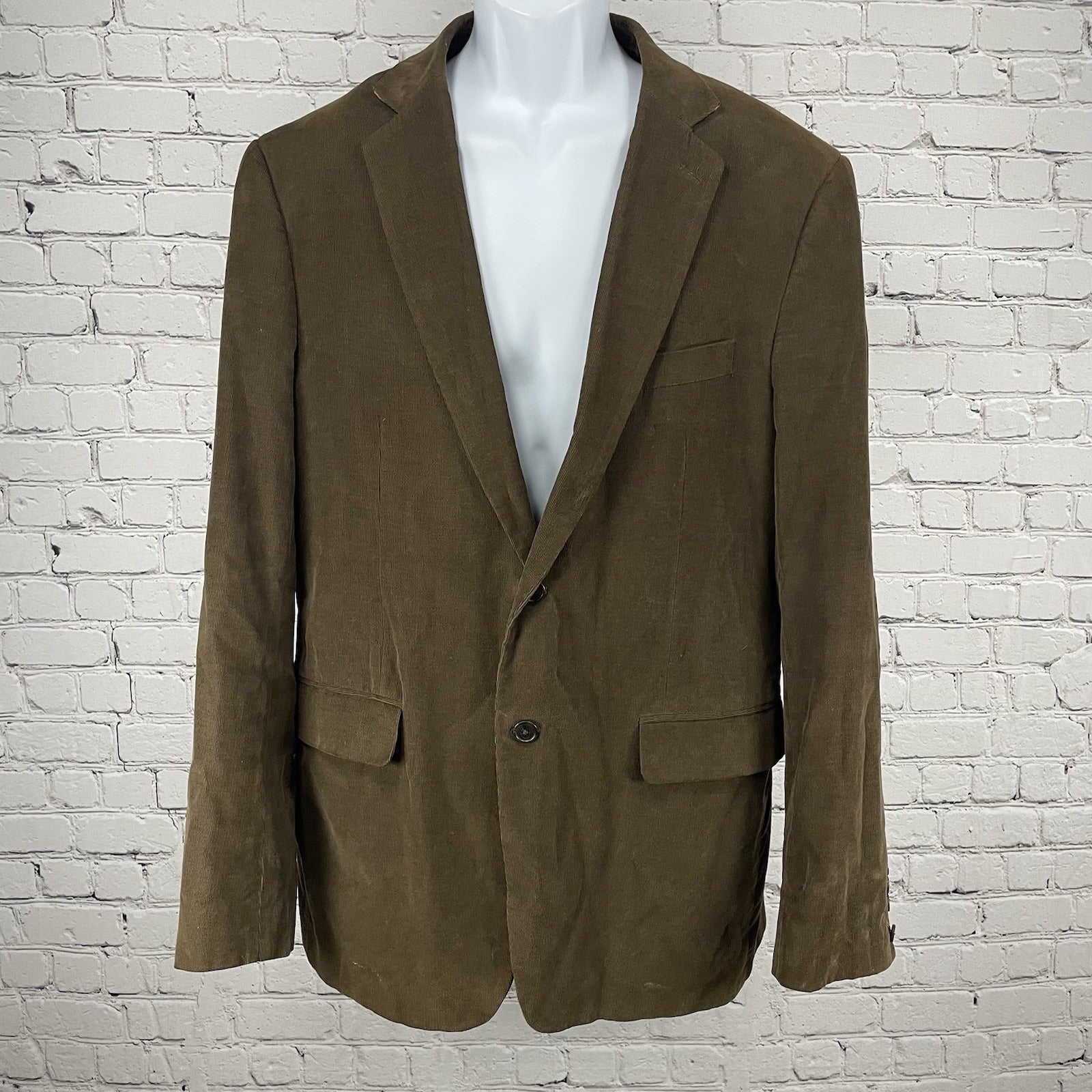 This is a classic fit Stafford blazer in size 42L, featuring a brown corduroy fabric with a two-button front closure and a single-vented back. The blazer has a notch lapel style and four-button sleeve cuffs. It is lined with polyester and includes inner pockets for added convenience. The design exudes a classic and timeless appeal, making it a versatile piece for various occasions. Perfect for men looking for a sophisticated and stylish addition to their wardrobe, this blazer combines classic elements with a touch of 90s sports-inspired theme.