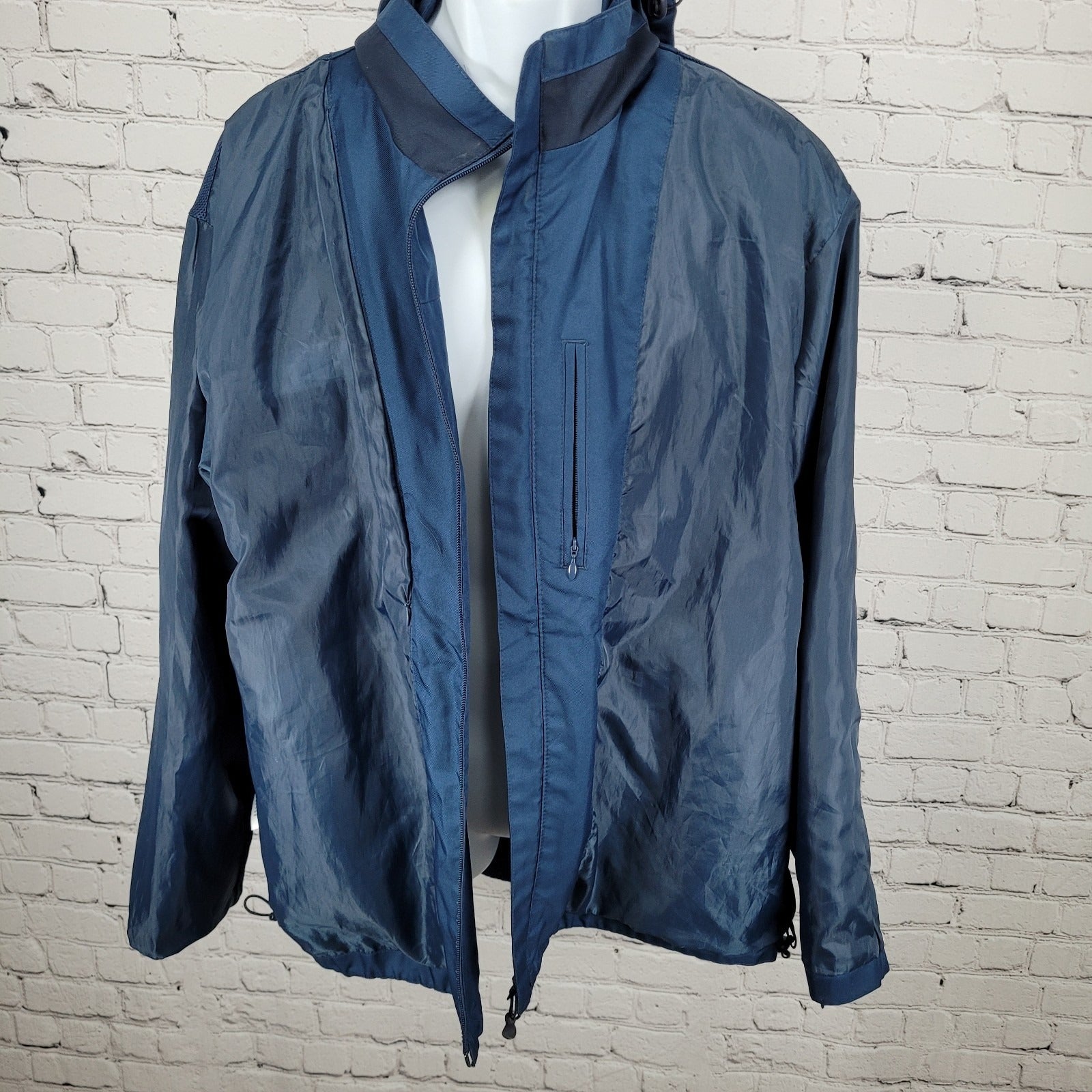 The Subaru Port Authority Blue Full Zip Hooded Windbreaker Jacket in size XL is a versatile and practical outerwear option for men. Made of durable polyester material, this short-length jacket features a solid blue color with a logo accent, perfect for casual, work, or travel occasions. The jacket includes a full zip closure, zipped pockets, a hood, and a lightweight design, making it suitable for all seasons. With its windbreaker style and lined interior, this jacket provides both comfort and protection in various outdoor settings.