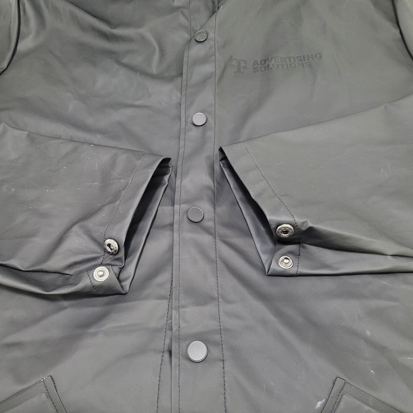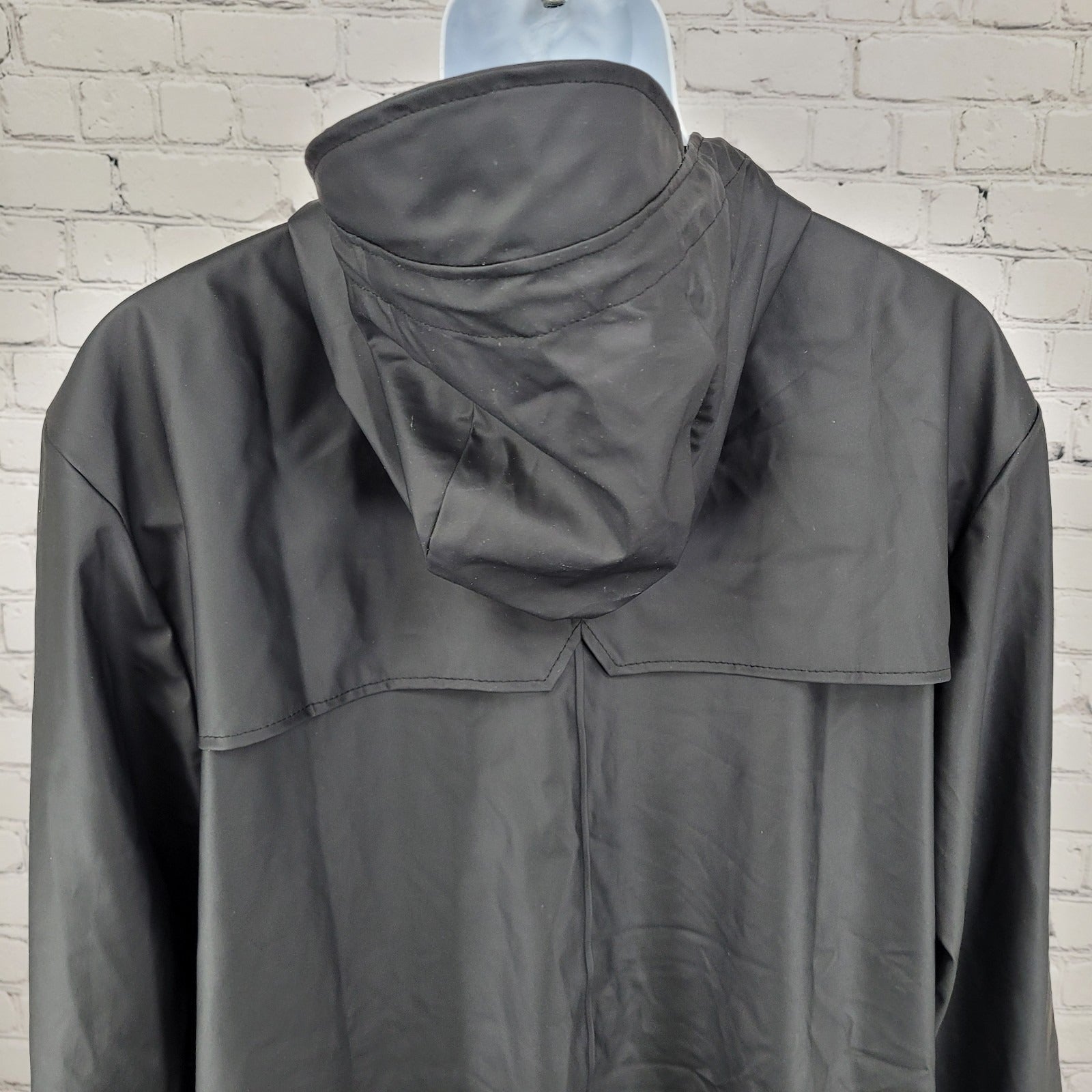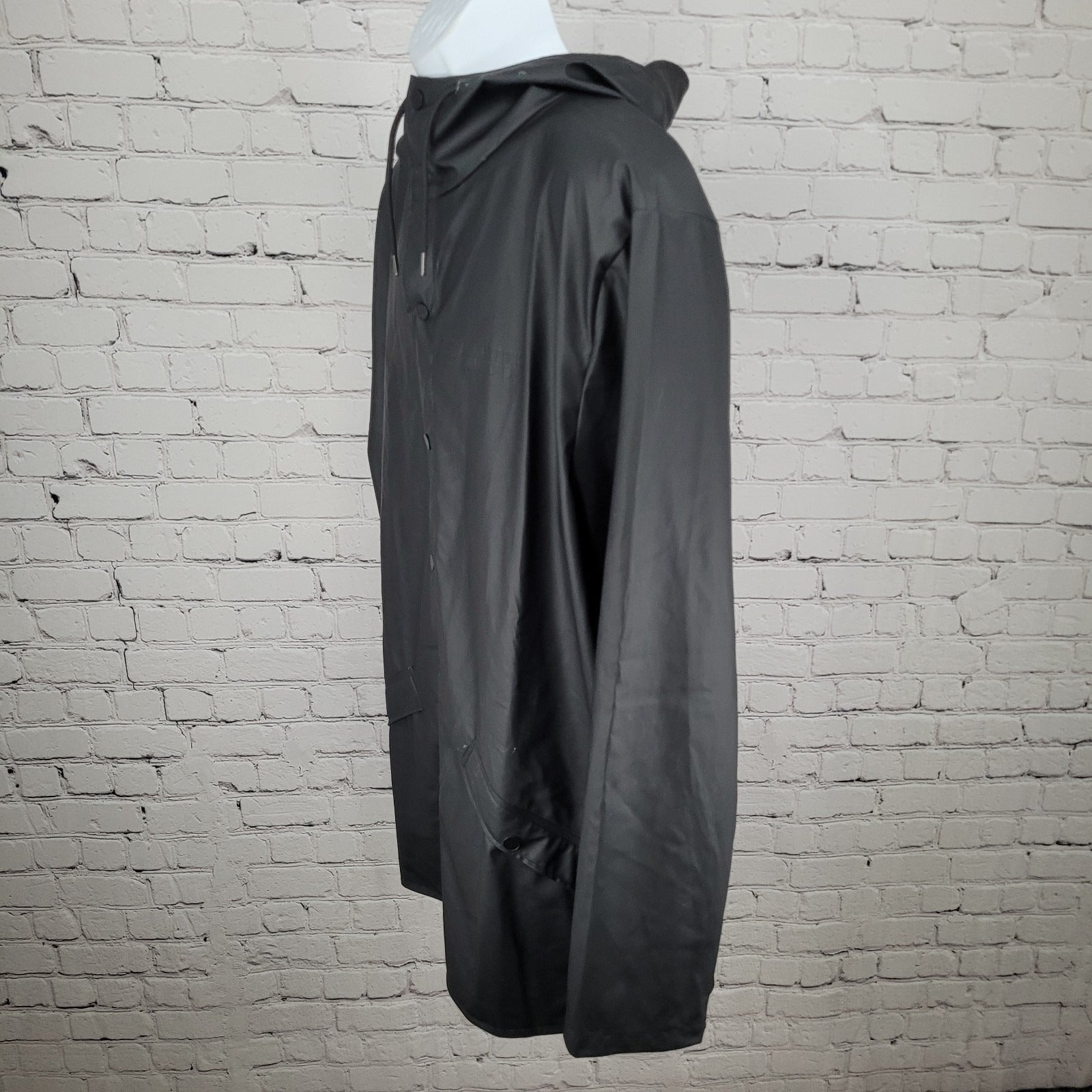 The T Mobile Advertising Black RAINS Hooded Lightweight Rain Jacket Coat in size XL is a stylish and practical choice for men looking for a durable and versatile outerwear option. This rain coat by RAINS features a snap closure, making it easy to put on and take off. The black color and sleek design make it a versatile piece that can be worn in various settings, while the lightweight construction ensures comfort and ease of movement. Perfect for staying dry on rainy days, this coat is a must-have for any man's wardrobe.
