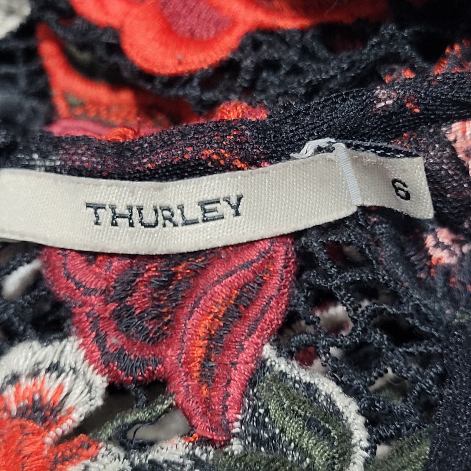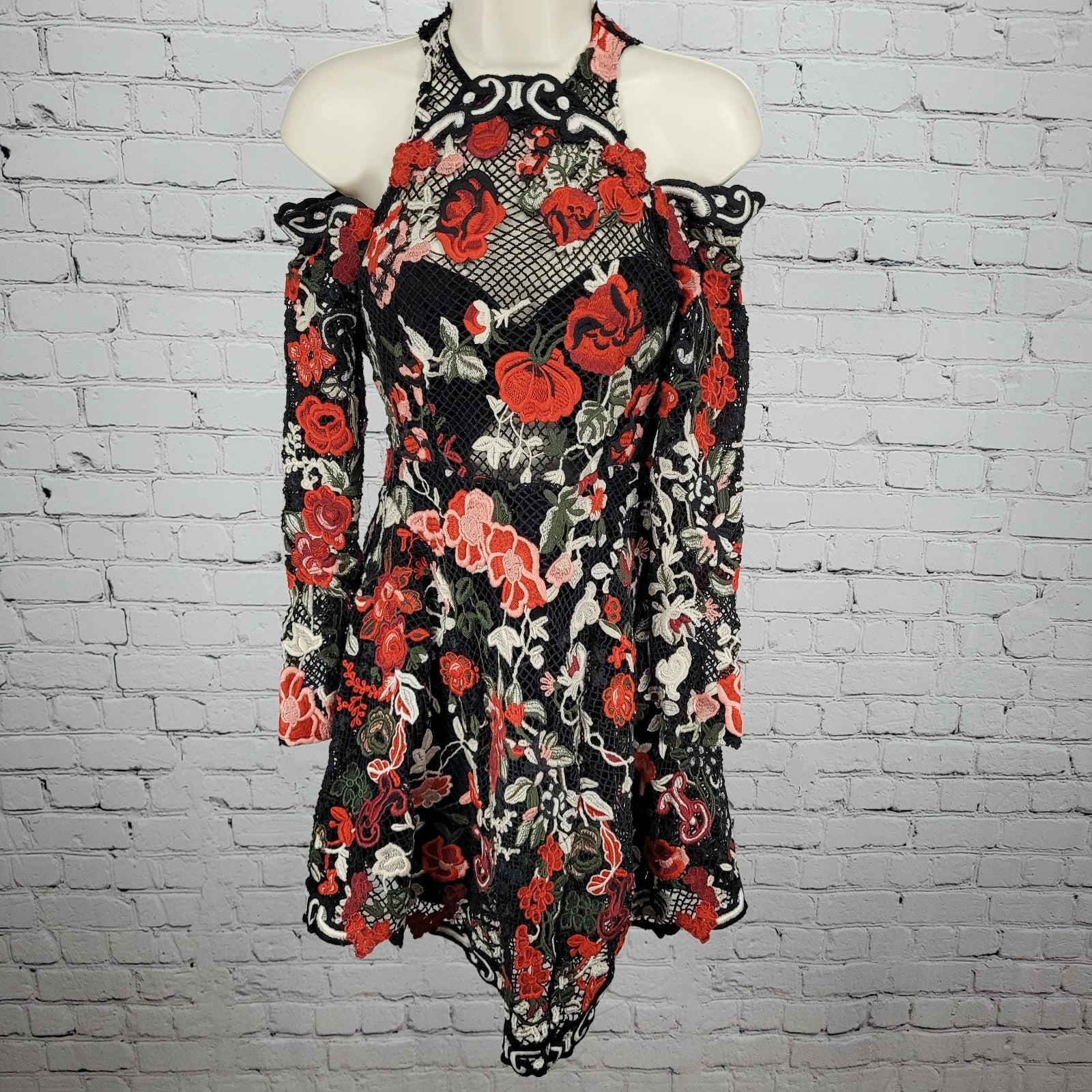 Thurley Black Red Fishnet Embroidered Floral Long Sleeve A Line Dress Size 6