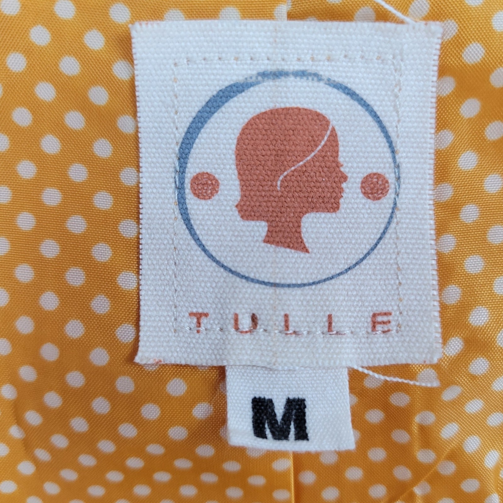 This Tulle Anthropologie yellow cotton jacket in size medium features a double-breasted design with a vented back, making it perfect for summer, fall, and spring seasons. The mid-length jacket has 3/4 sleeves and a button closure, suitable for various occasions including travel, parties, casual outings, workwear, and business meetings. With a retro and colorful theme, this lightweight and lined jacket offers a classic style with a solid pattern and soft shell construction, making it a versatile and stylish addition to any woman's wardrobe.