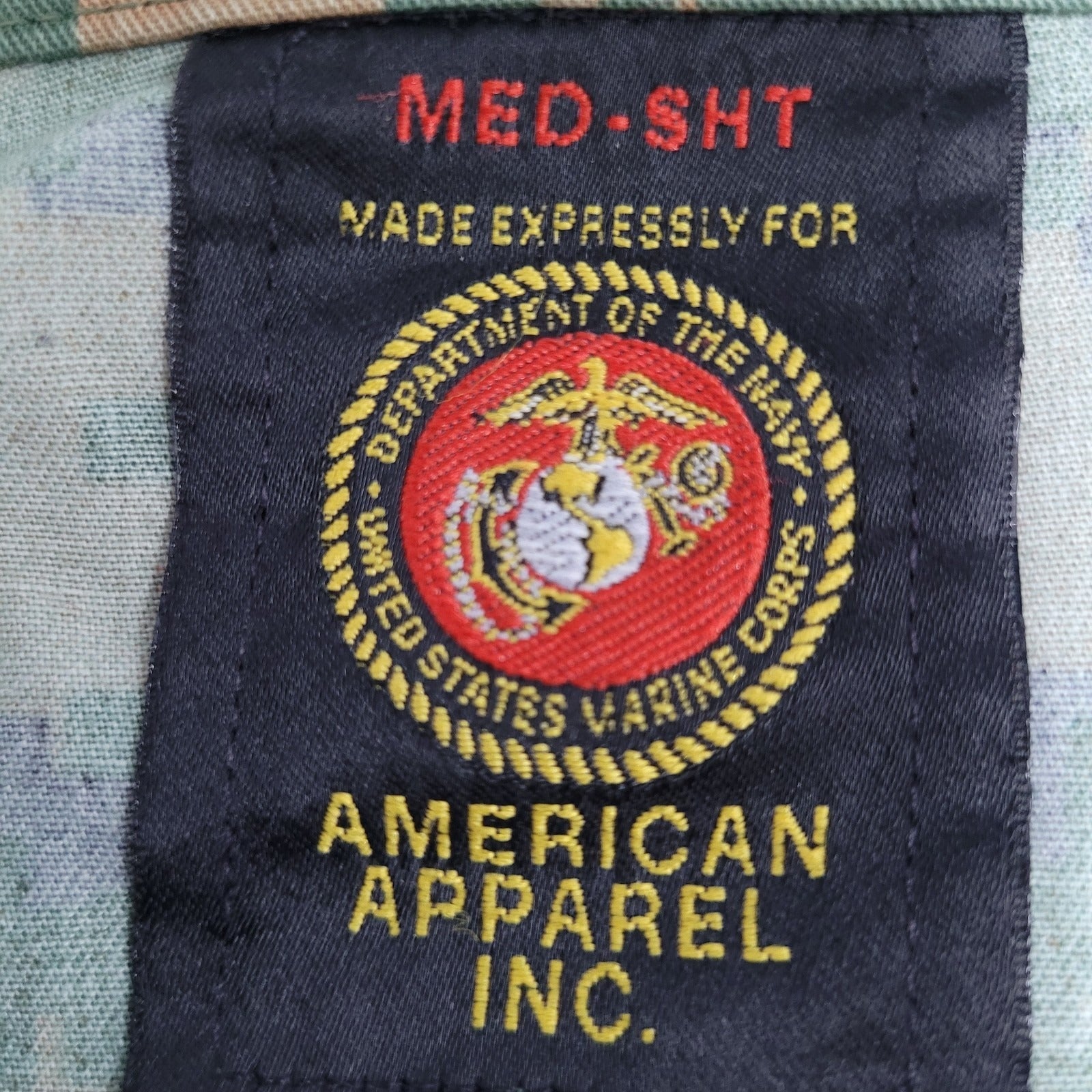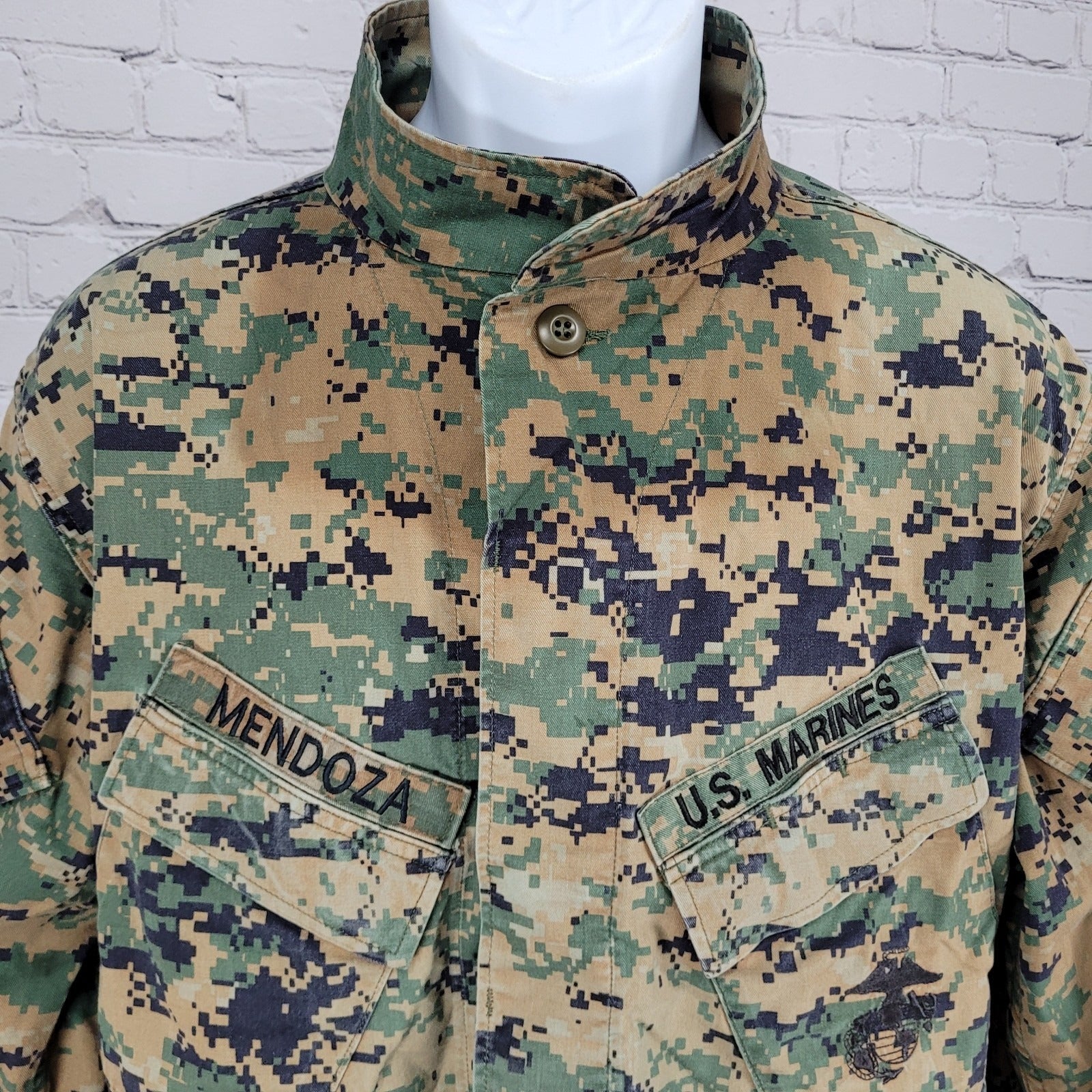 The product is an original U.S. Marines digital camo uniform buttoned long sleeve shirt in size medium. This shirt falls under the theme of militaria, making it a collectible item for enthusiasts of military history and memorabilia. Perfect for both display and wearing, this authentic piece of military clothing is a great addition to any collection of current militaria items.