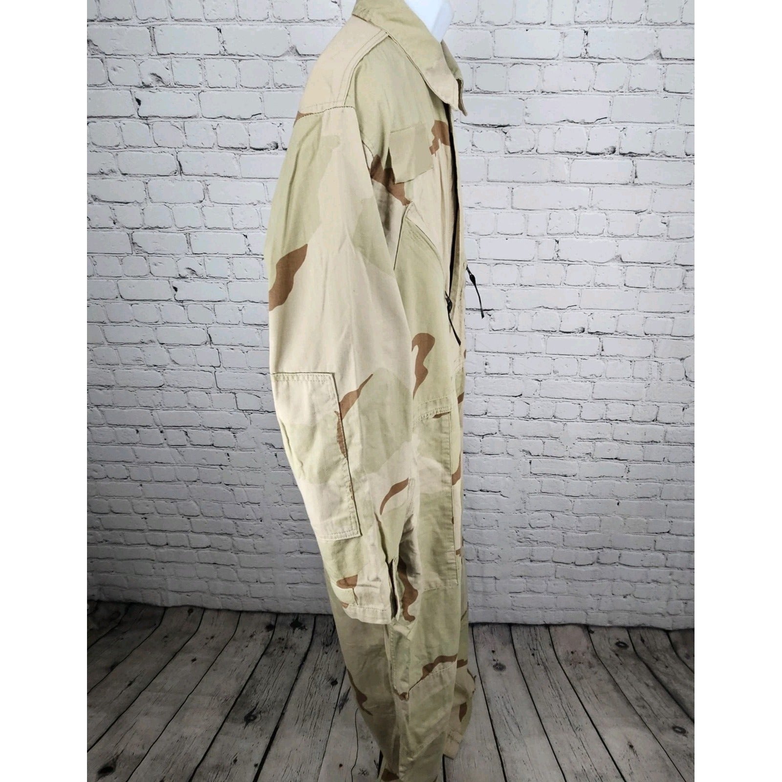 The US Military Desert Camouflage Mechanics Cold Weather Uniform Coveralls in size Large are designed for military personnel. These coveralls are equipped with a camouflage pattern designed for desert environments, making them ideal for mechanics and personnel working in cold weather conditions. The coveralls are genuine military issue items, perfect for collectors of militaria or those interested in current military gear.