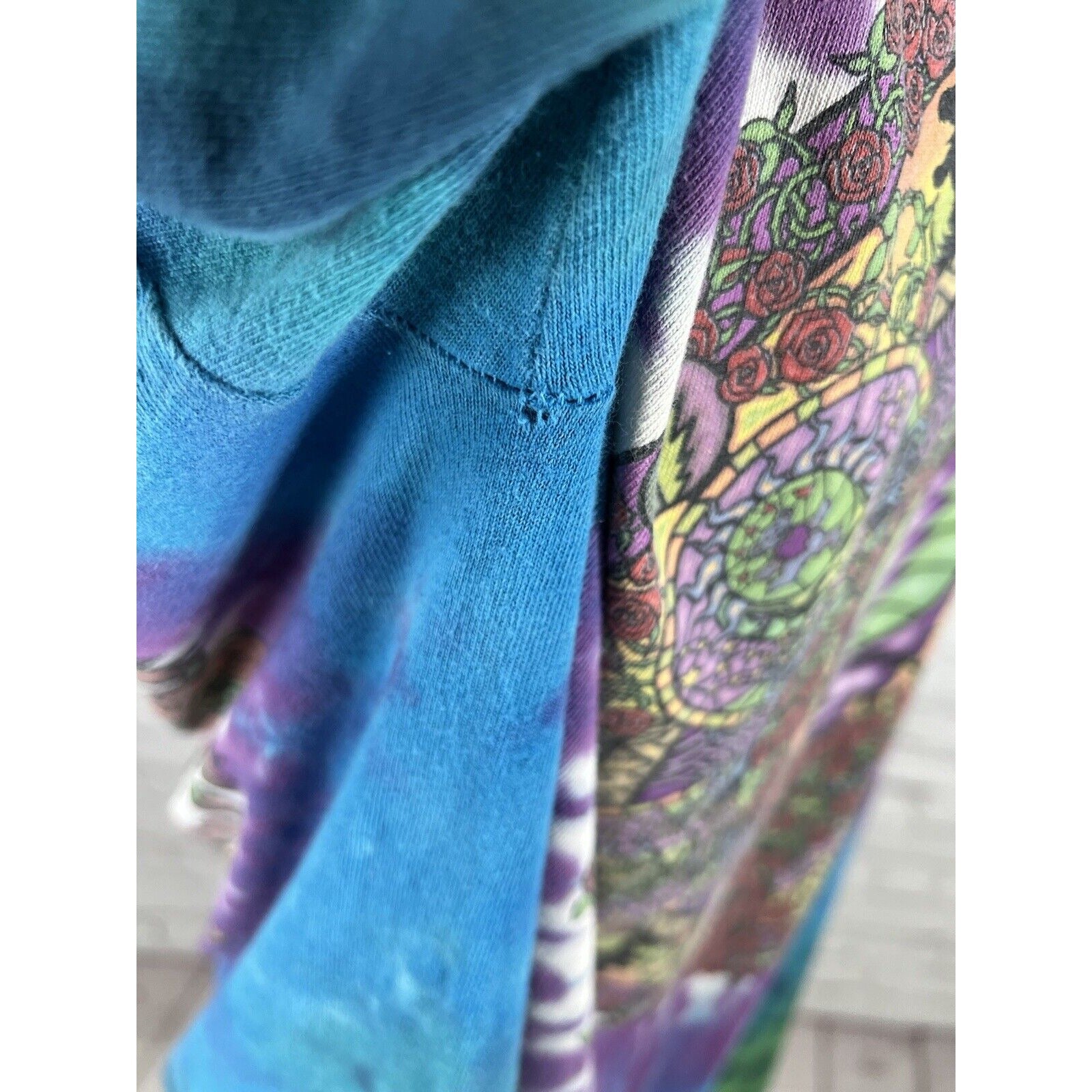 This vintage t-shirt was manufactured in the 1990s in the United States and is a double-sided, preshrunk shirt that can be worn in any season. The shirt's unique tie-dye pattern and crew neckline make it a standout piece of clothing. This shirt is an authentic Grateful Dead product and is perfect for anyone who loves music, bands, and tie-dye apparel.