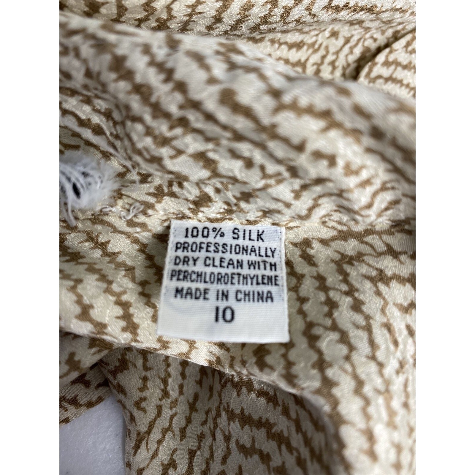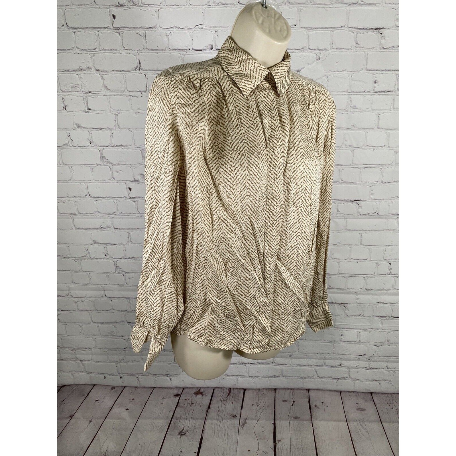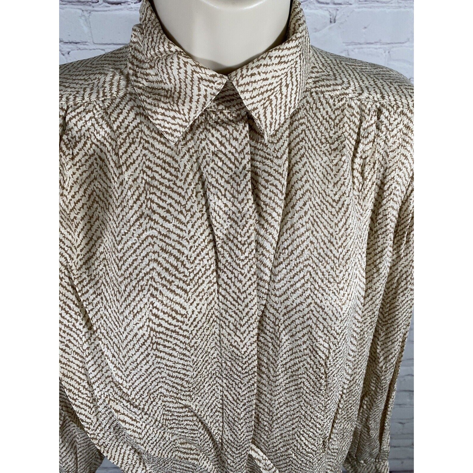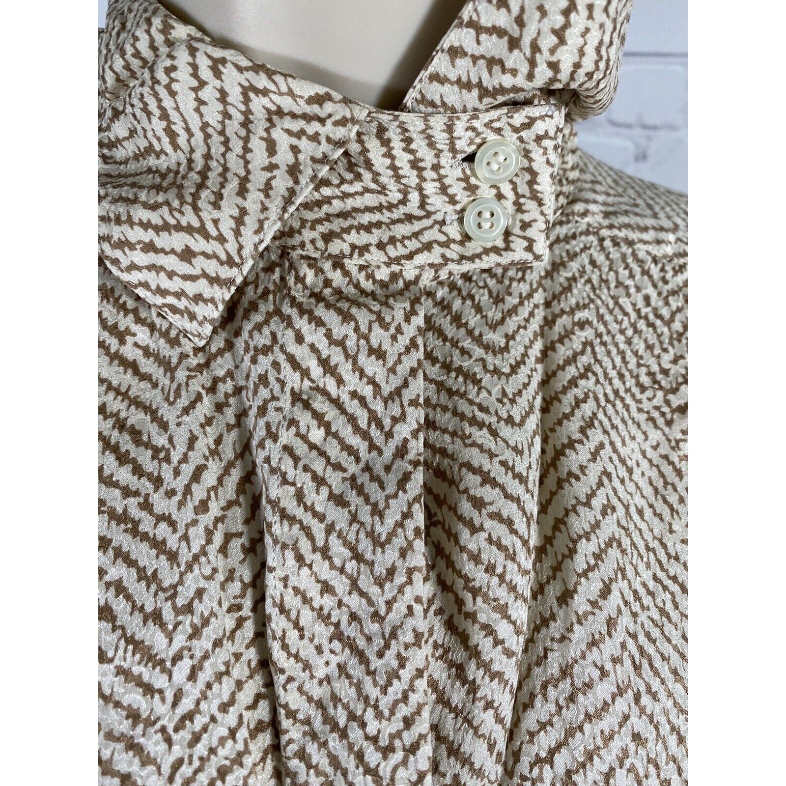 Vintage Oval Room All Silk Brown White Long Sleeve Button Up High Neck Shirt 10
