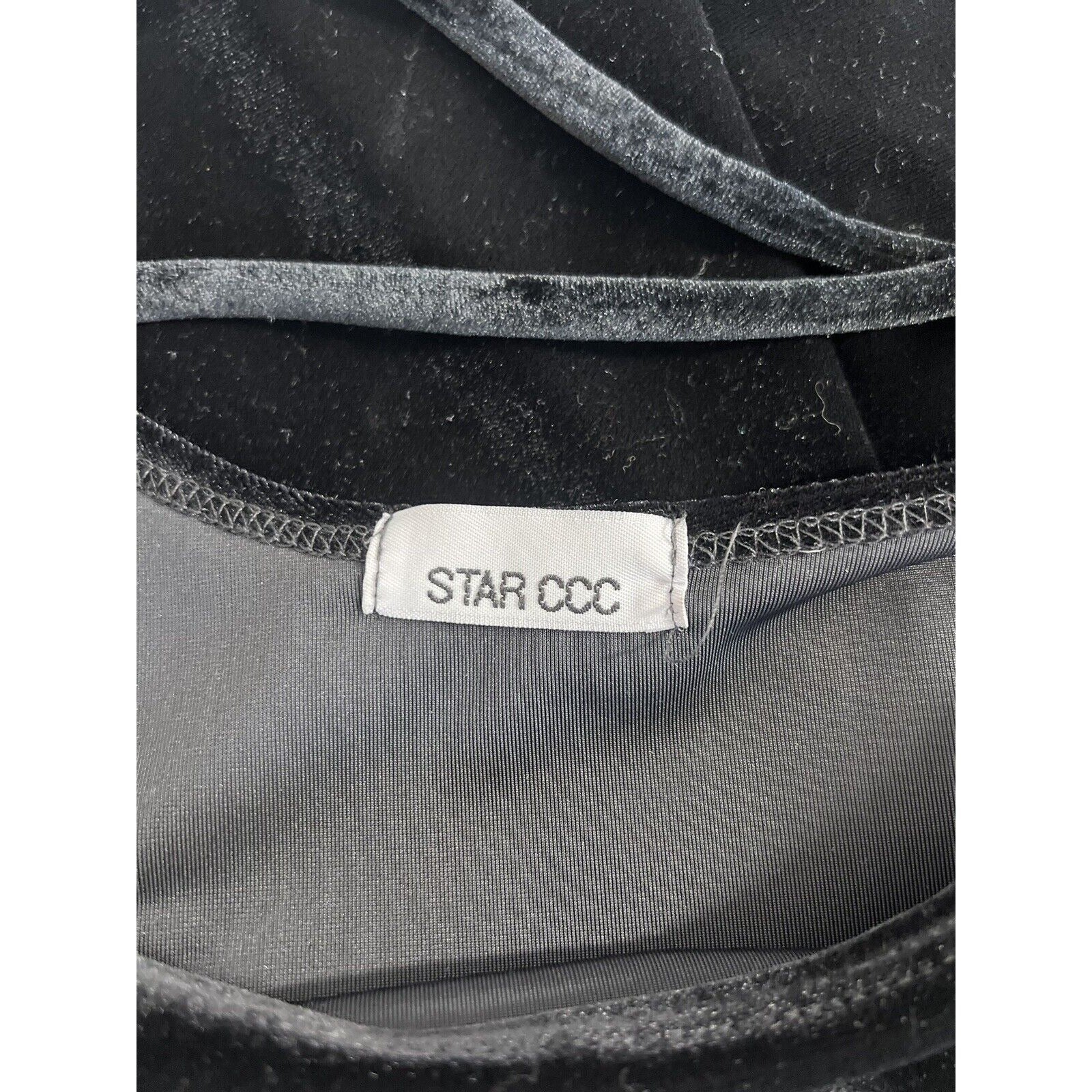This vintage Star CCC blouse is a must-have for any fashion-forward individual. The black velour fabric gives it a touch of glam rock, while the crisscross detail at the back adds a unique twist. Featuring long sleeves and a regular fit, this shirt is perfect for a casual occasion.
