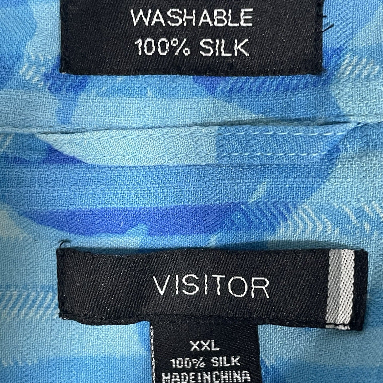 This Visitor Blue Floral Washable Silk Hawaiian Button Up Short Sleeve Shirt in size 2XL features a relaxed fit with a collared neckline and button closure. Made of silk, this lightweight shirt is ideal for travel, parties, casual outings, or workwear. The tropical floral pattern adds a beach-inspired vibe, while the chest pocket provides functionality. Hand wash only, this shirt is easy to care for and perfect for a laid-back yet stylish look.
