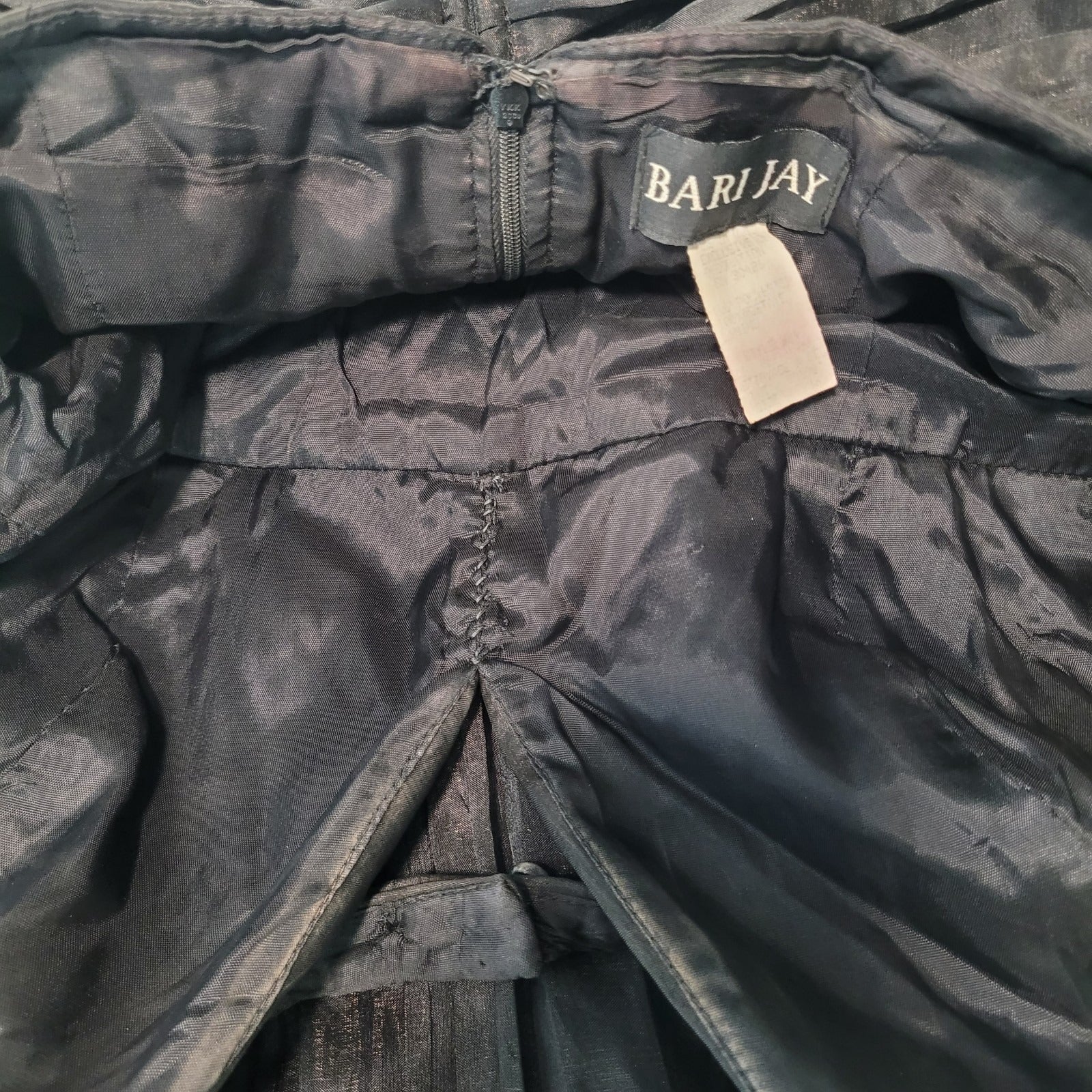 The VTG Bari Jay Black Gold Sheen Chiffon Ruched Fit & Flare Dress is a stylish and elegant piece of women's clothing made in the USA. The black color, ruched detailing, and sheer chiffon fabric give it a unique and luxurious look. Perfect for special occasions or as a statement piece in your wardrobe, this dress exudes class and sophistication while honoring American craftsmanship.