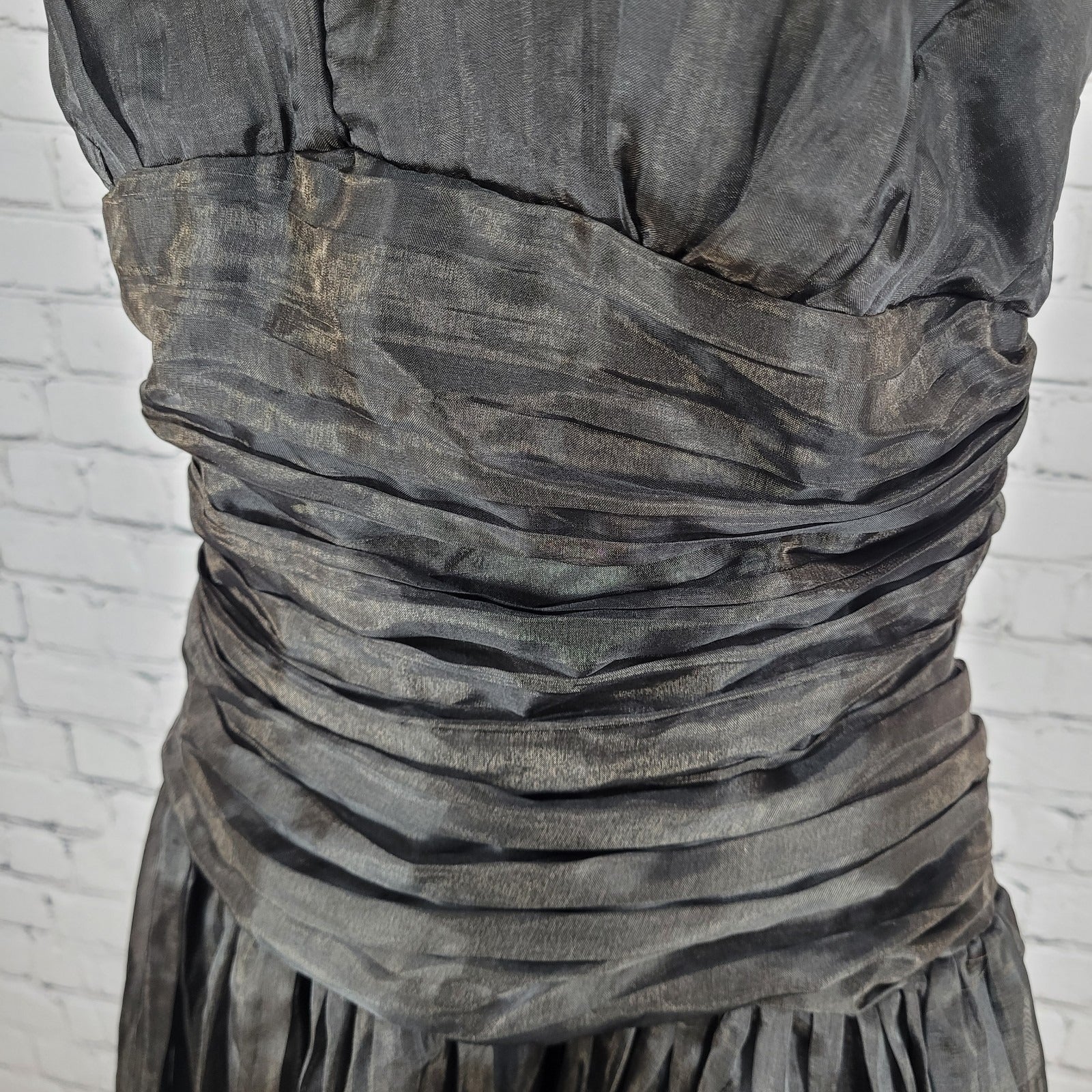 VTG Bari Jay Black Gold Sheen Chiffon Ruched Fit & Flare Dress USA Made Size 16
