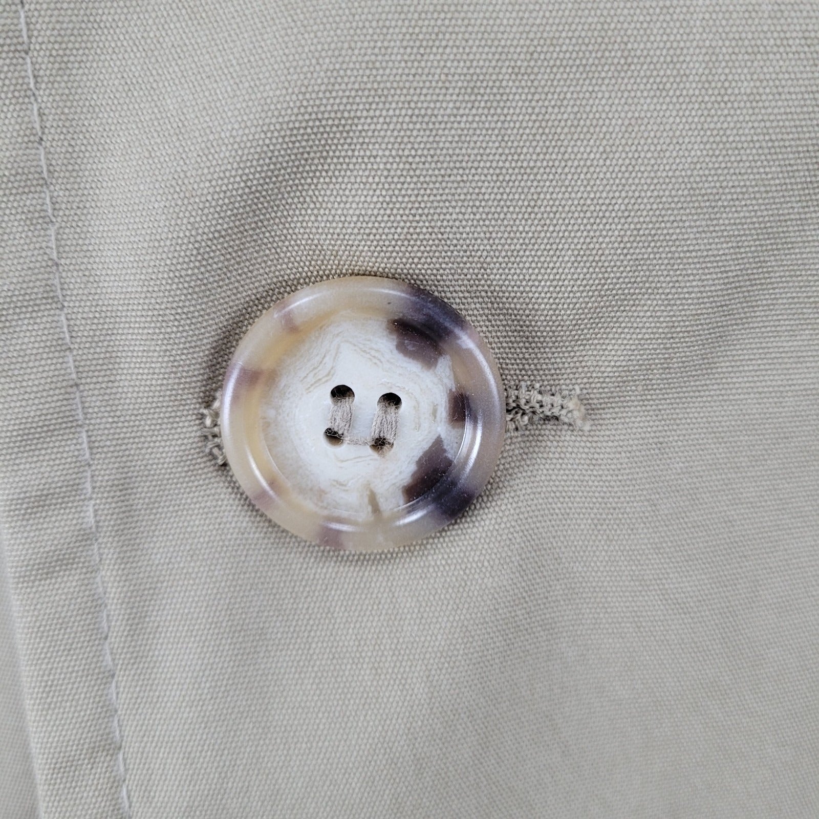 Small stains throughout sleeves including cuffs and pocket, missing belt and top closure button, as pictured. Replacement button included. No materials label.