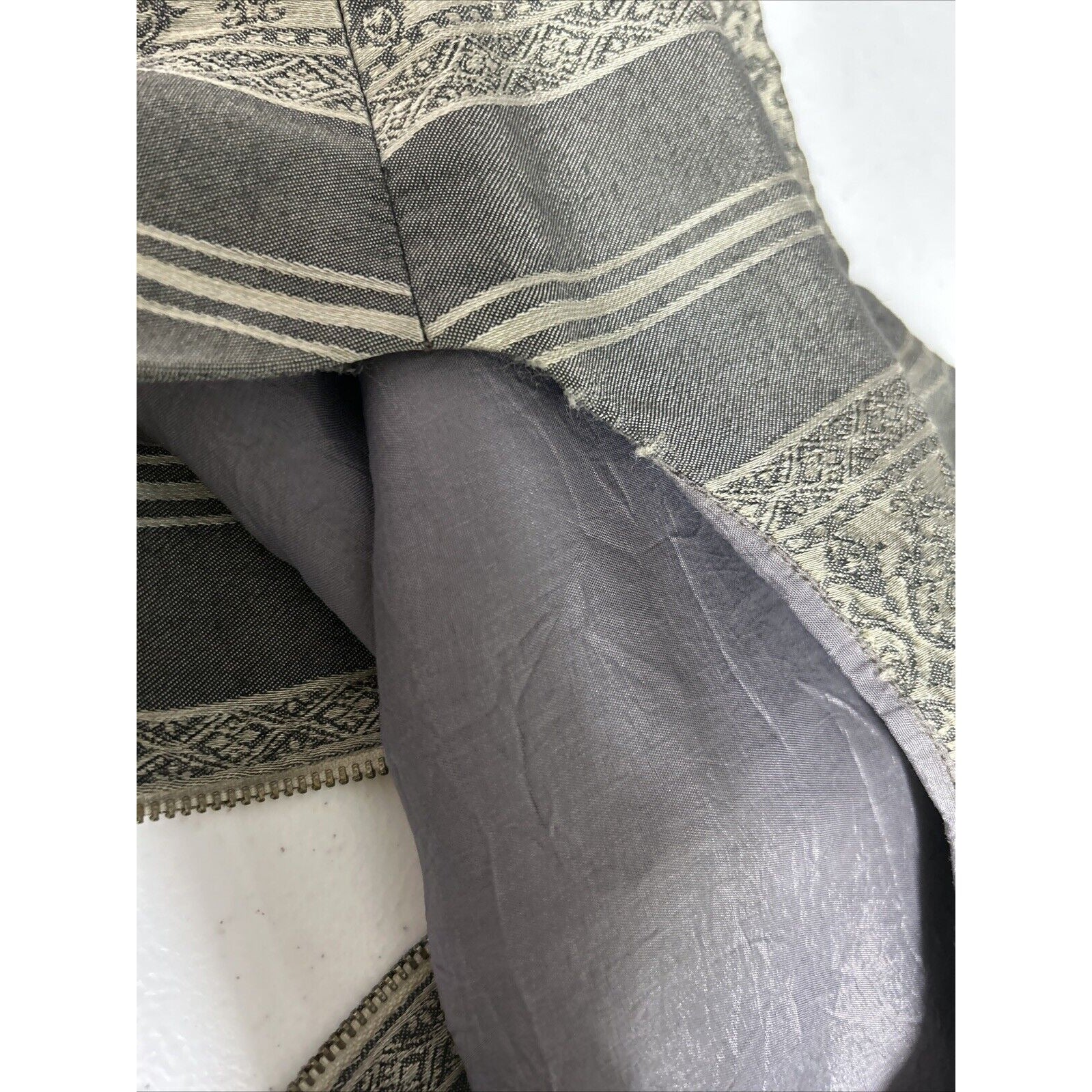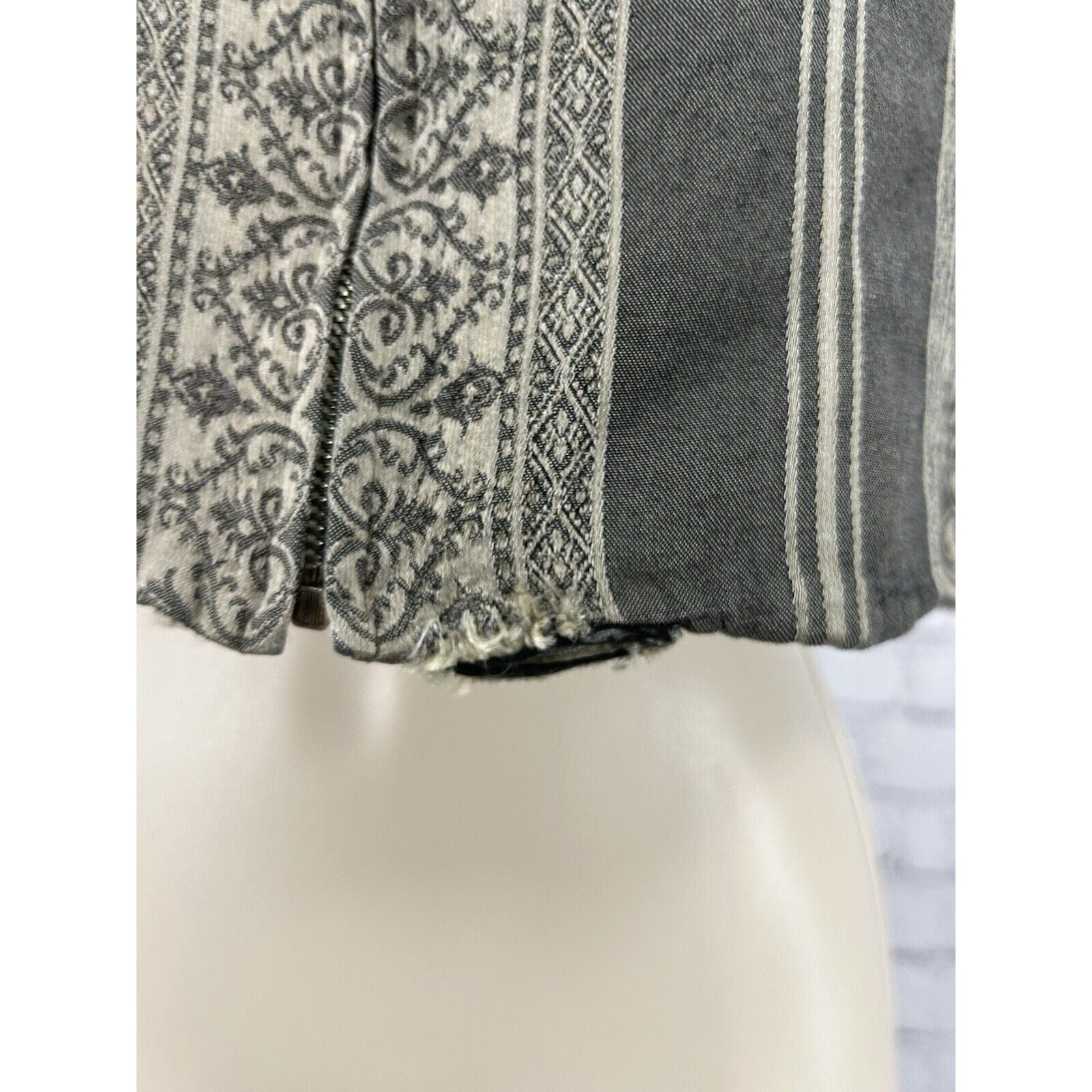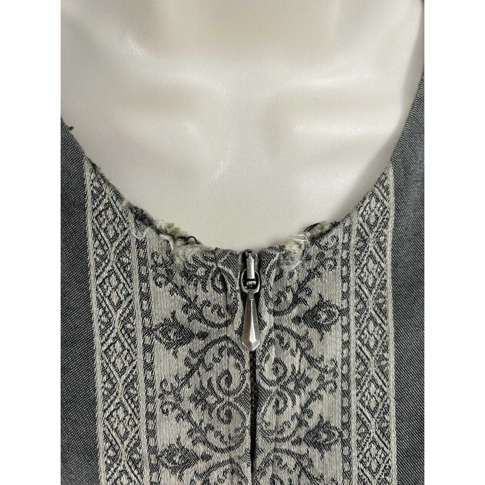 This vintage Emanuel Ungaro petite gray cropped front full zip closure vest is a classic addition to any wardrobe. The striped and paisley pattern adds a touch of elegance to this basic vest, making it suitable for both casual and business occasions. The sleeveless design and short length make it perfect for layering over a blouse or dress, while the full zip closure ensures a comfortable and secure fit.
