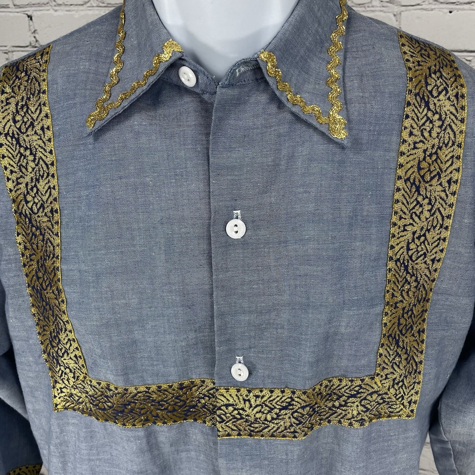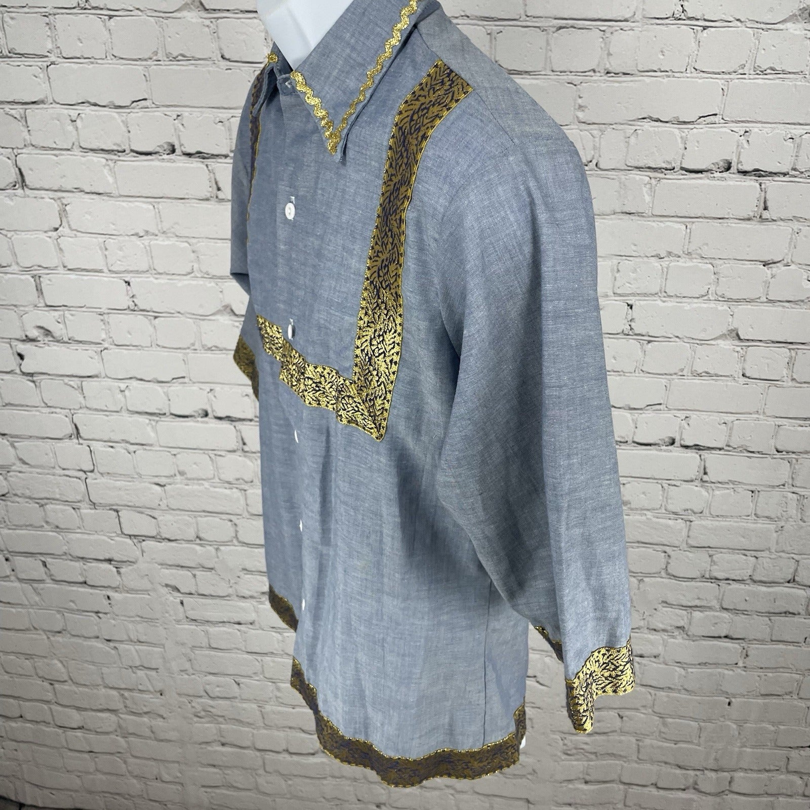 Elevate your retro wardrobe with this vintage JCPenney Big Mac shirt. This classic blue button-up short sleeve shirt features glitter and embroidered accents for a touch of glamour. The shirt is made of a lightweight and breathable polyester-cotton blend, making it perfect for summer, fall, and spring. The shirt has a chest size of 40 inches and fits true to size.
