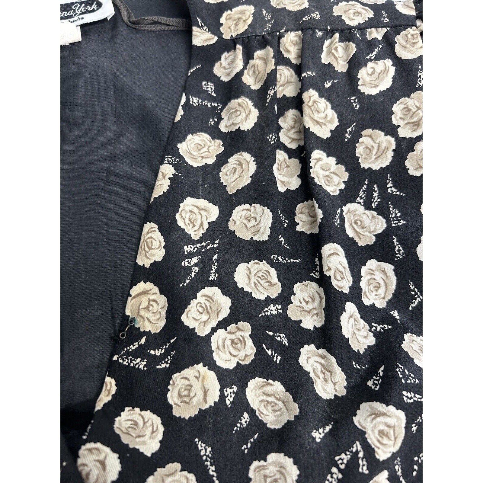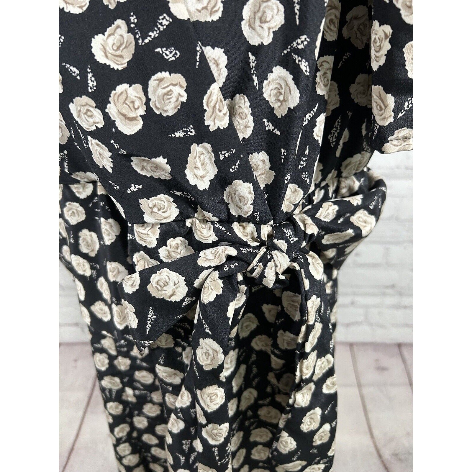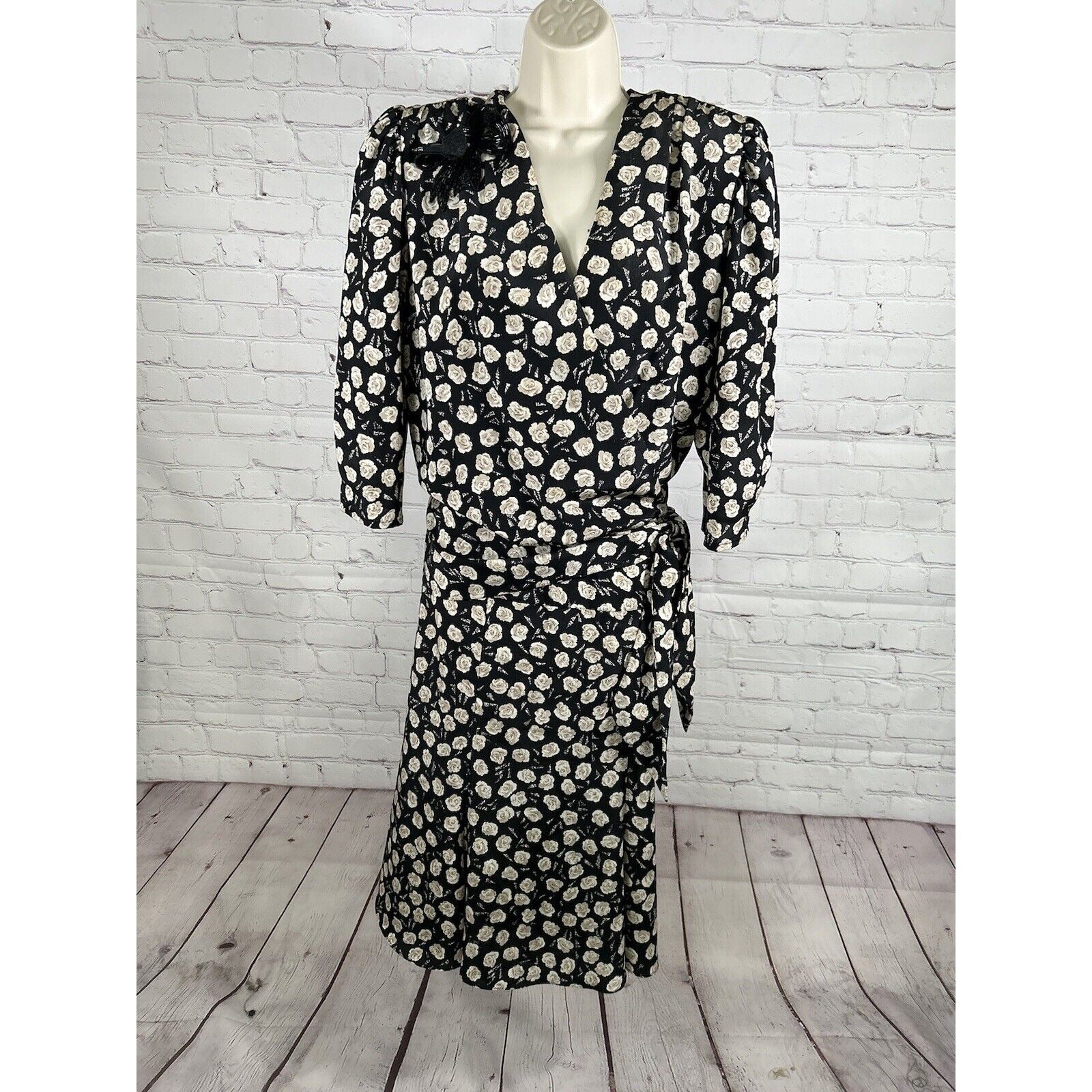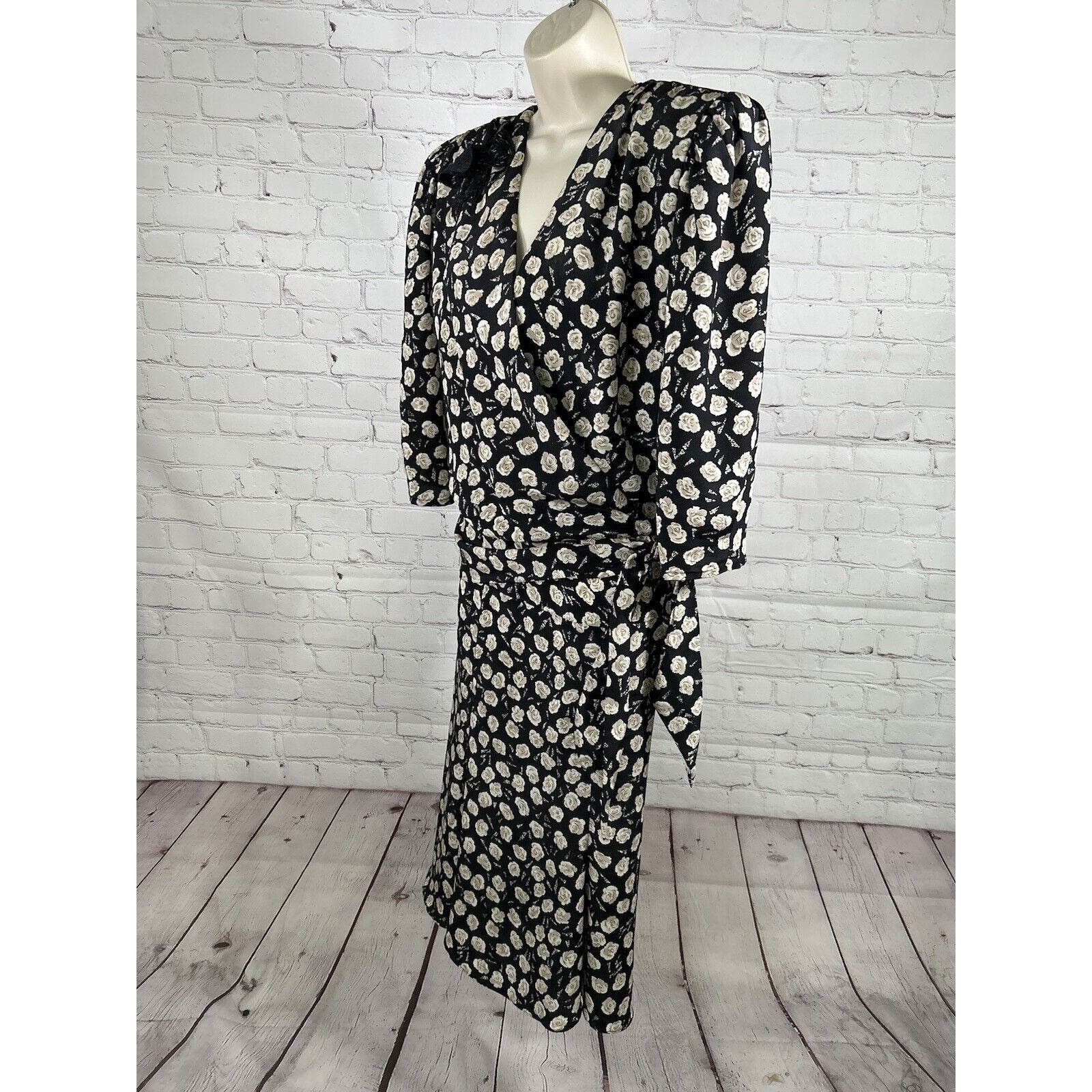 VTG Jo Hanna York Joan Davis Black Floral V Neck Shoulder Pad Faux Wrap Dress XL