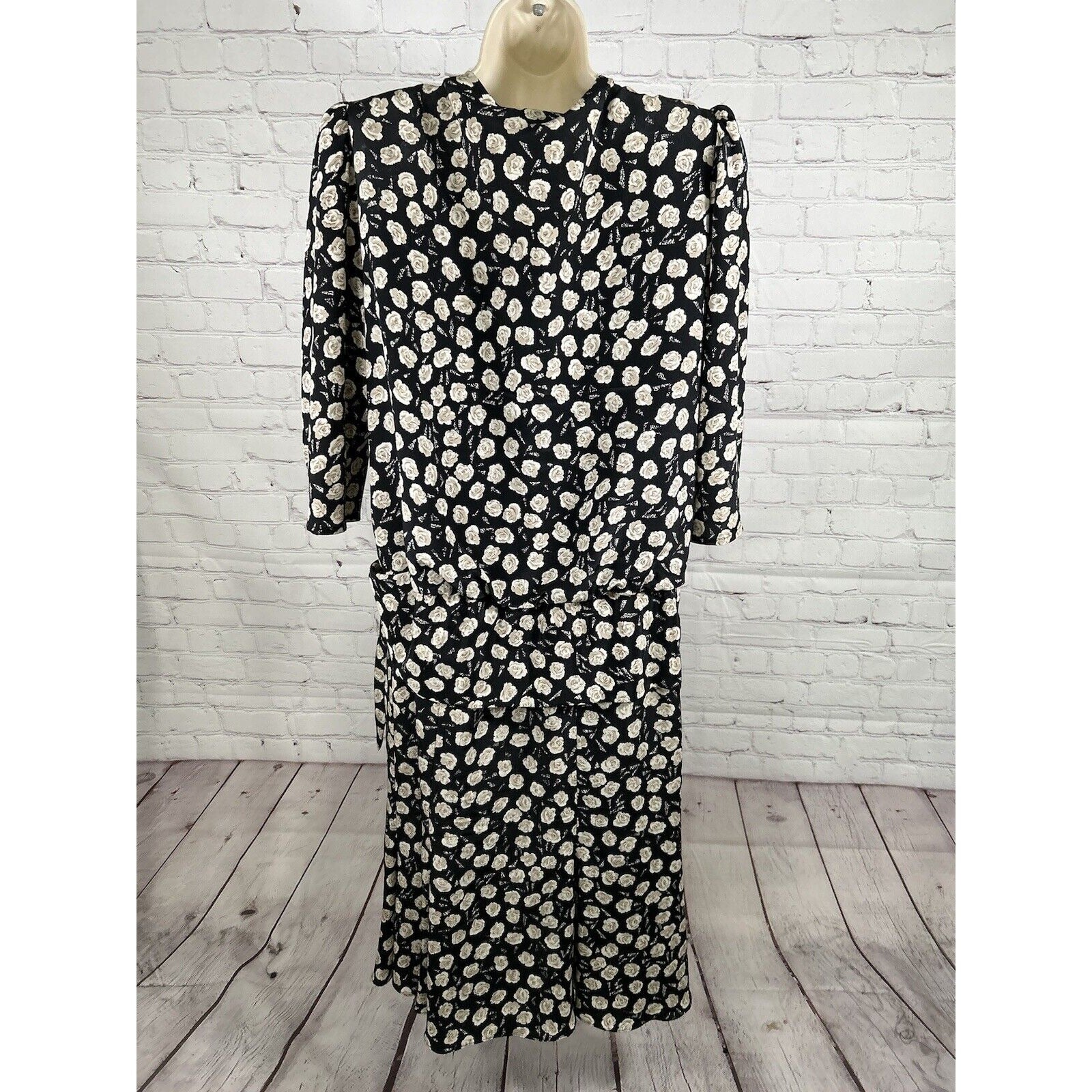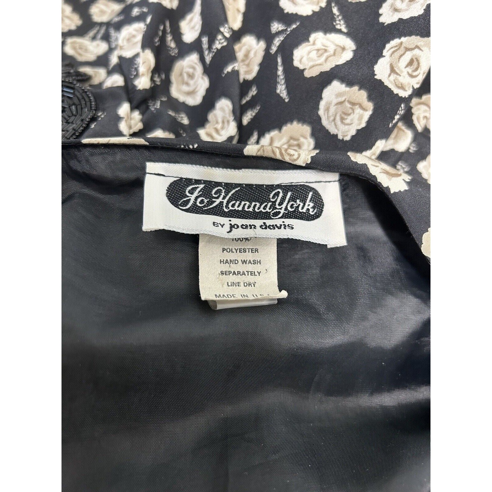 This vintage dress by Jo Hanna York features a flattering faux-wrap design with a V-neckline and shoulder pads. The black floral print adds a touch of elegance, making it perfect for business or formal occasions. The dress is made of high-quality polyester and measures 46 inches from shoulder to hem. It is a size XL and was proudly made in the United States during the 1980s.