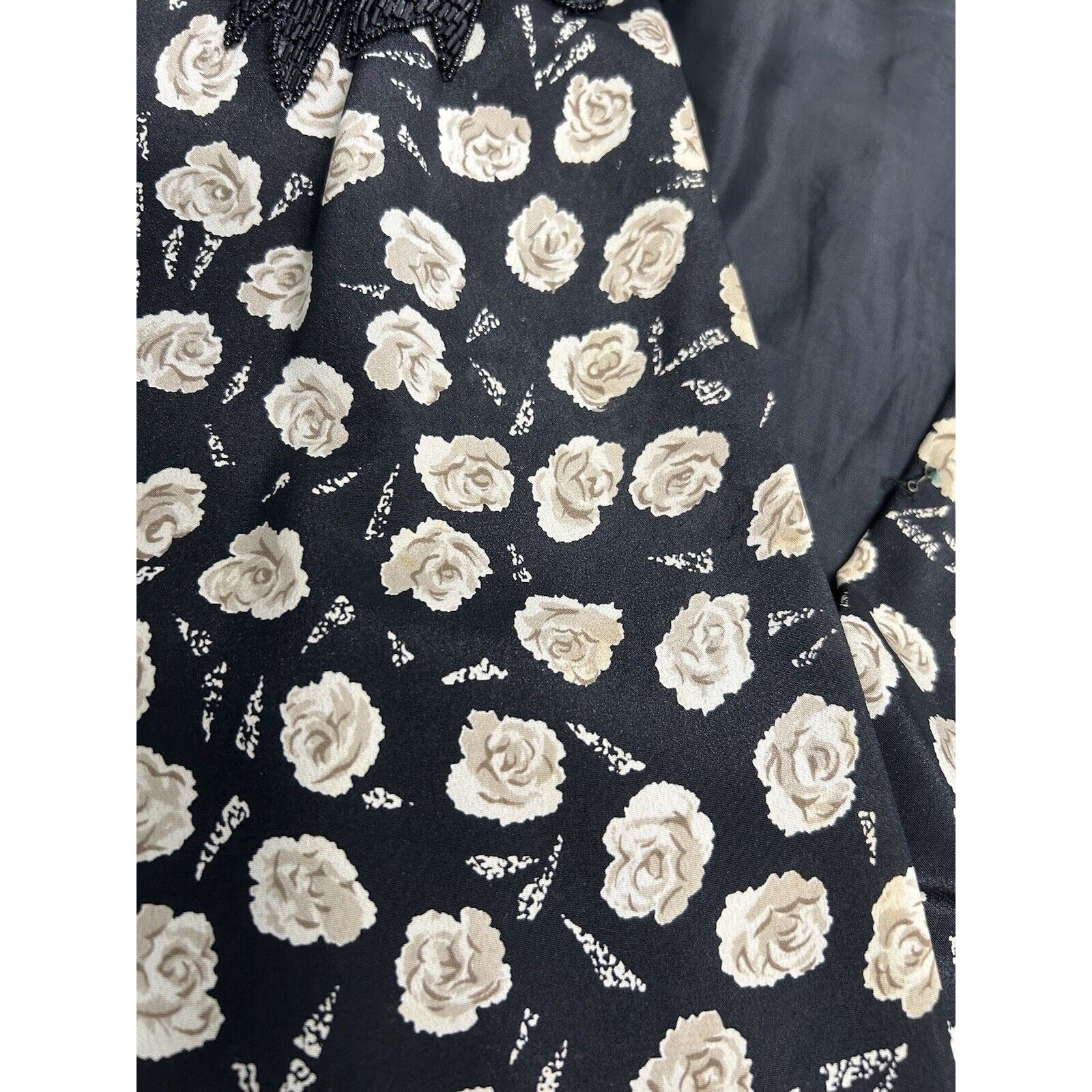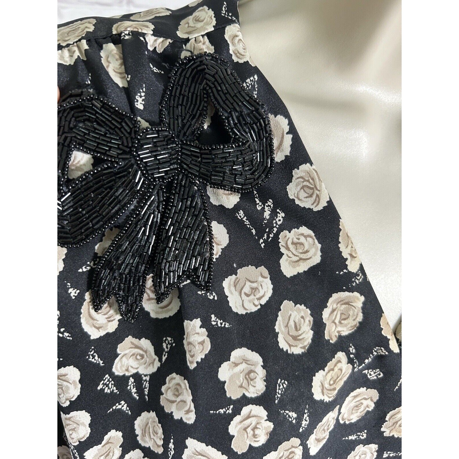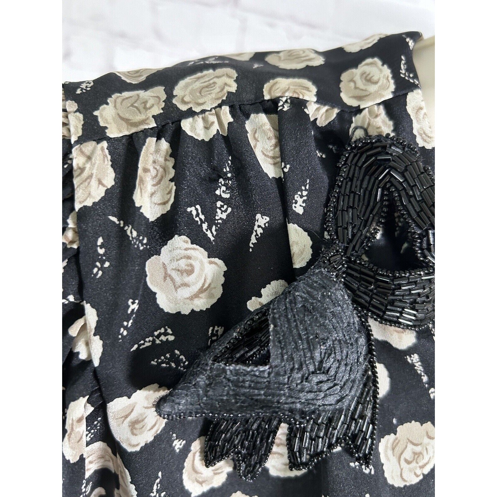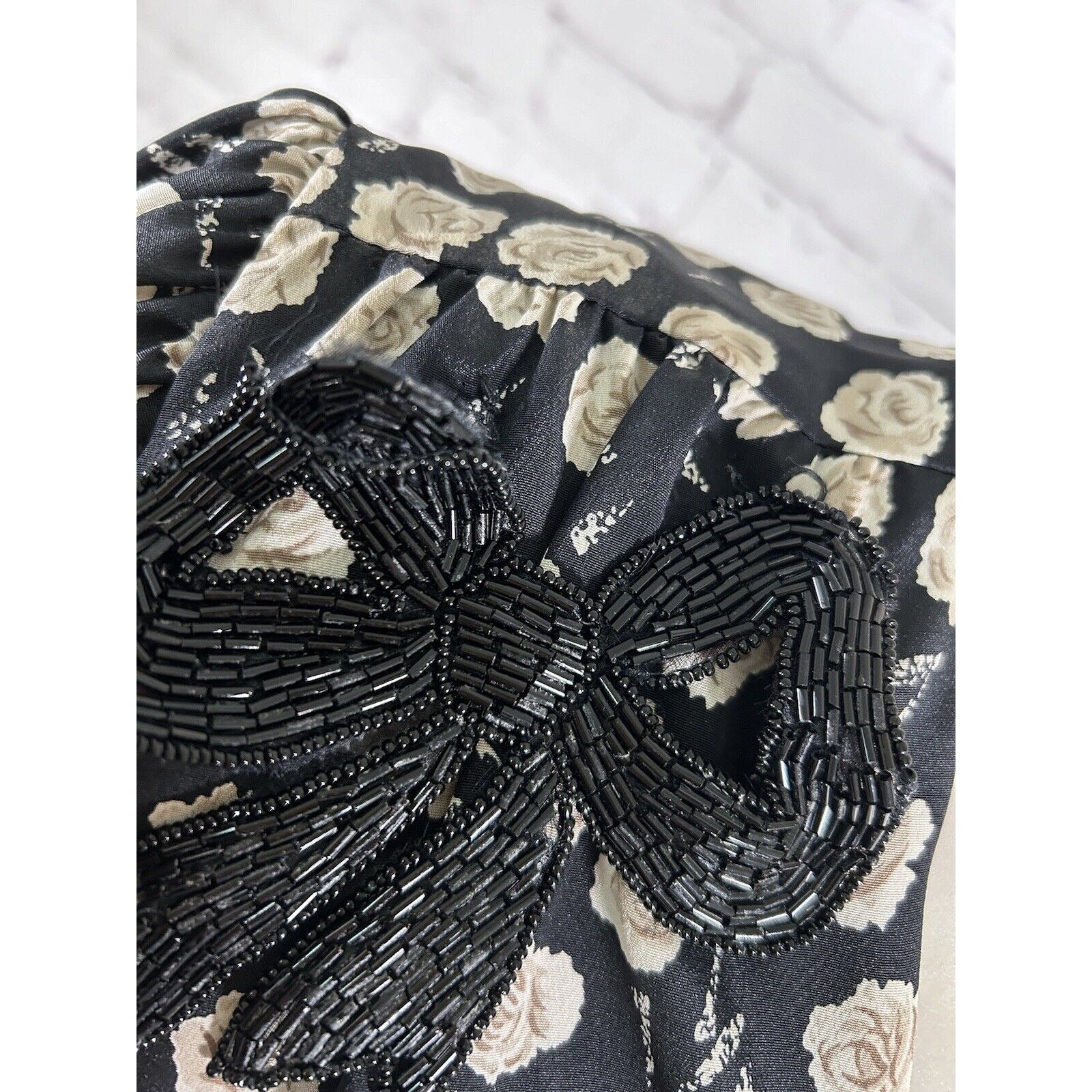 Beaded bow on right shoulder is missing a stitch that attaches it to the dress. Bow is damaged in several spots. Both shoulders, underarms, and chest have some light discoloration. No size marked. See measurements below for sizing. See photos for reference.