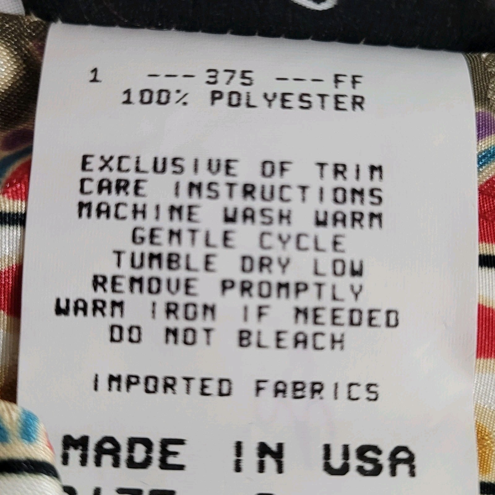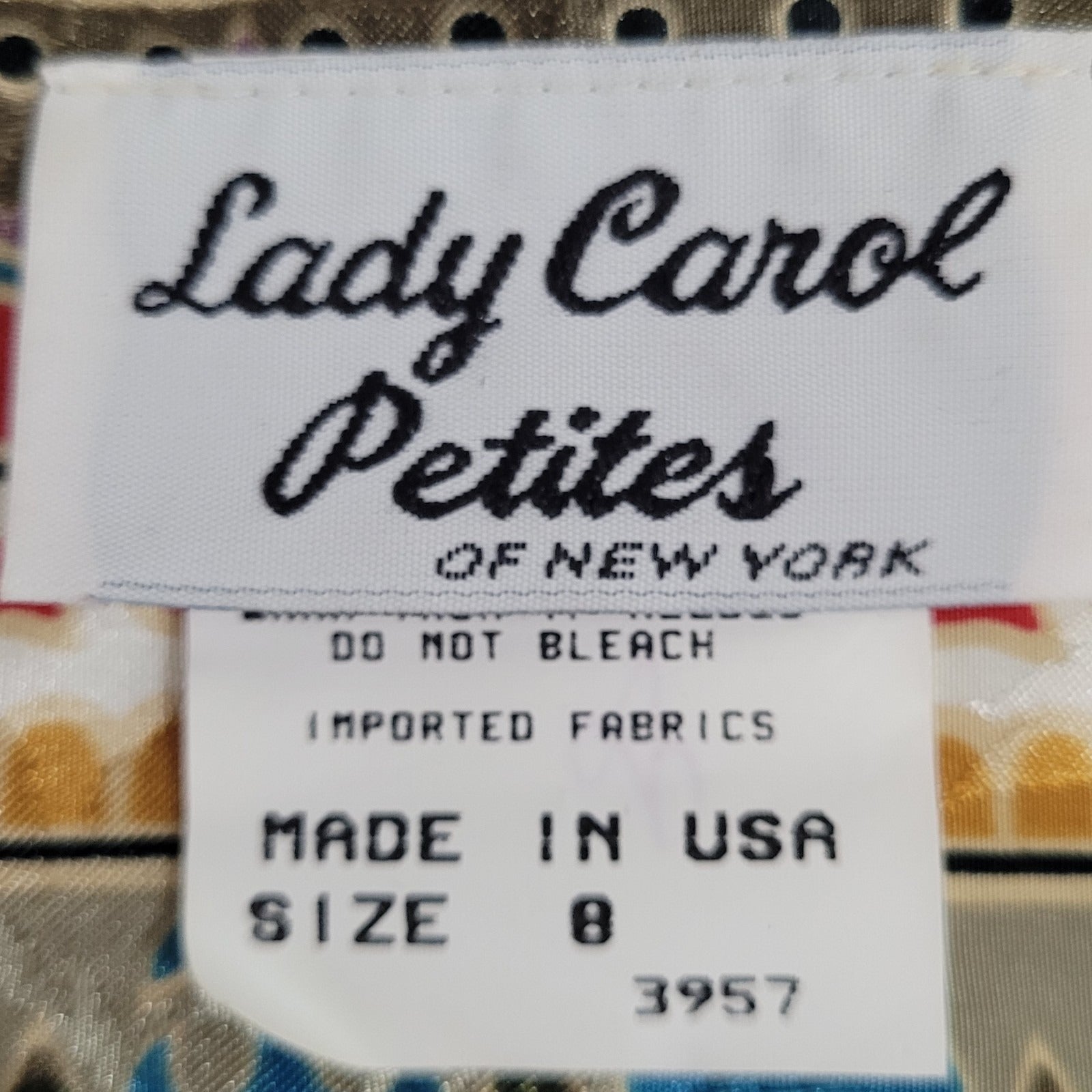 The VTG Lady Carol Satin Multicolor Ornate Gold Button Top Blouse is a vintage piece perfect for travel, parties, or cocktails. Made in the USA with polyester satin fabric, this blouse features a round neck, short sleeves with casual sleeve type, and a button closure. The geometric pattern, kimono style, and multicolor design make it a classic and easy-to-care-for option for summer, fall, and spring seasons. With a size 8P and shoulder pads, this blouse offers a touch of sophistication and elegance for petite women who appreciate timeless fashion.