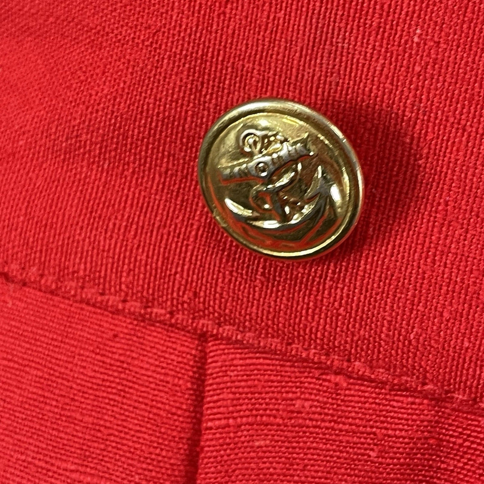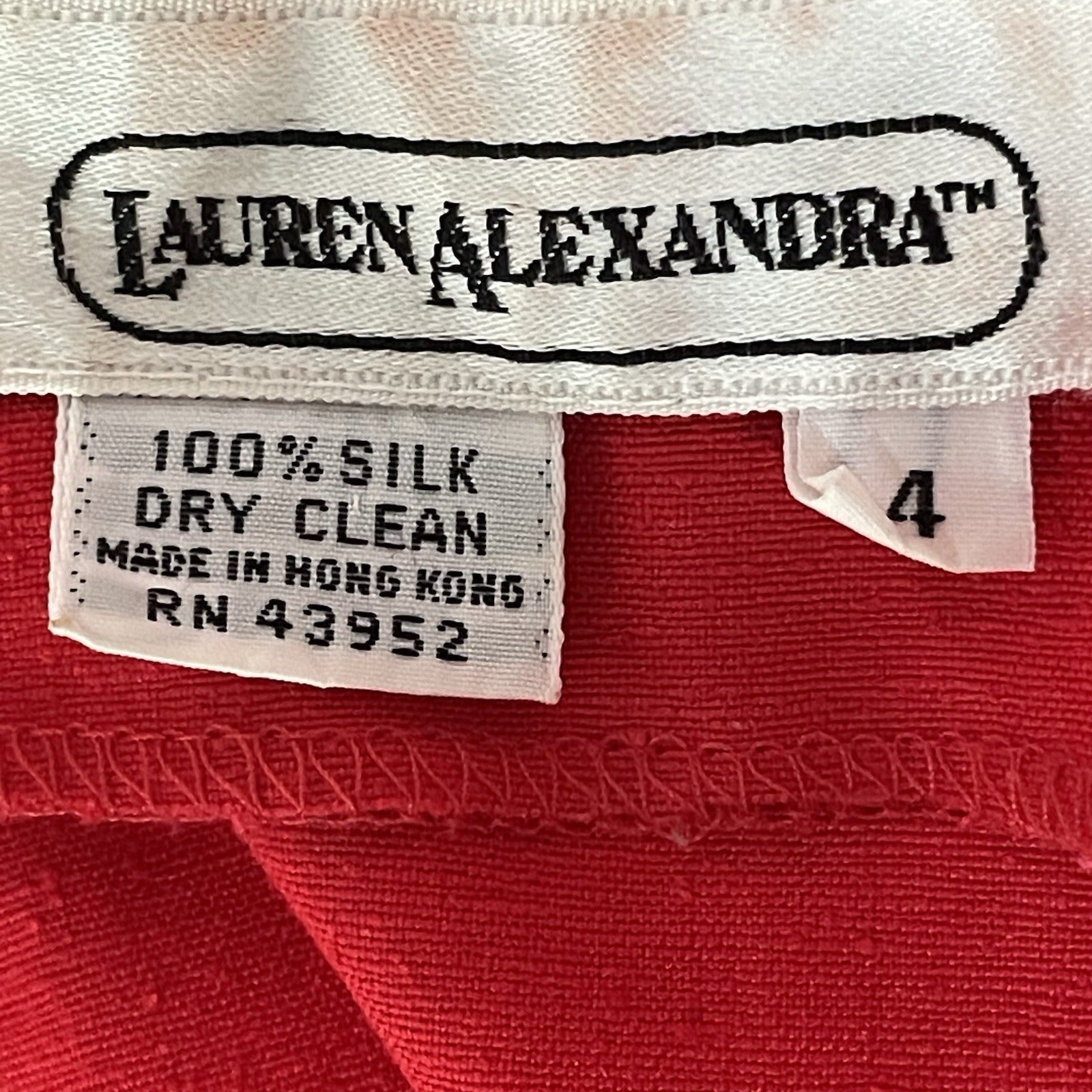 This vintage Lauren Alexandra red silk chiffon shirt dress features a retro design with gold button accents on the collar and pleated details. The dress has a collared neckline, short sleeves, and a button closure, adding a touch of sophistication. With a midi length and a size 4, this lightweight chiffon dress is perfect for various occasions such as travel, weddings, parties, casual outings, or workwear. The dress also includes pockets for added convenience and is recommended to be dry cleaned only.