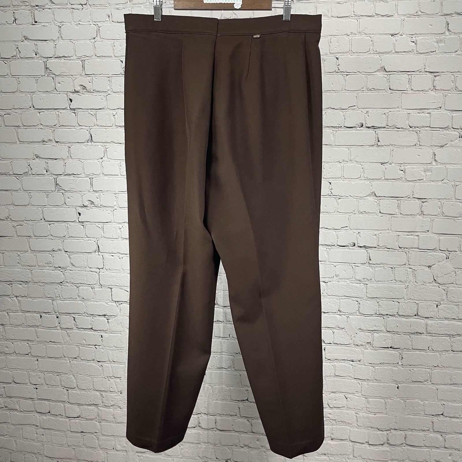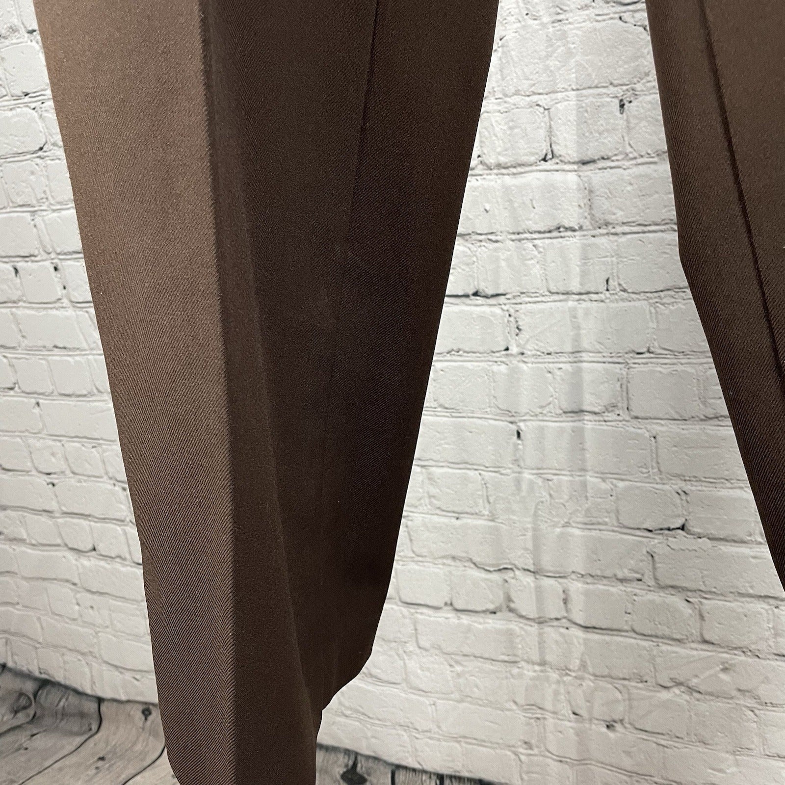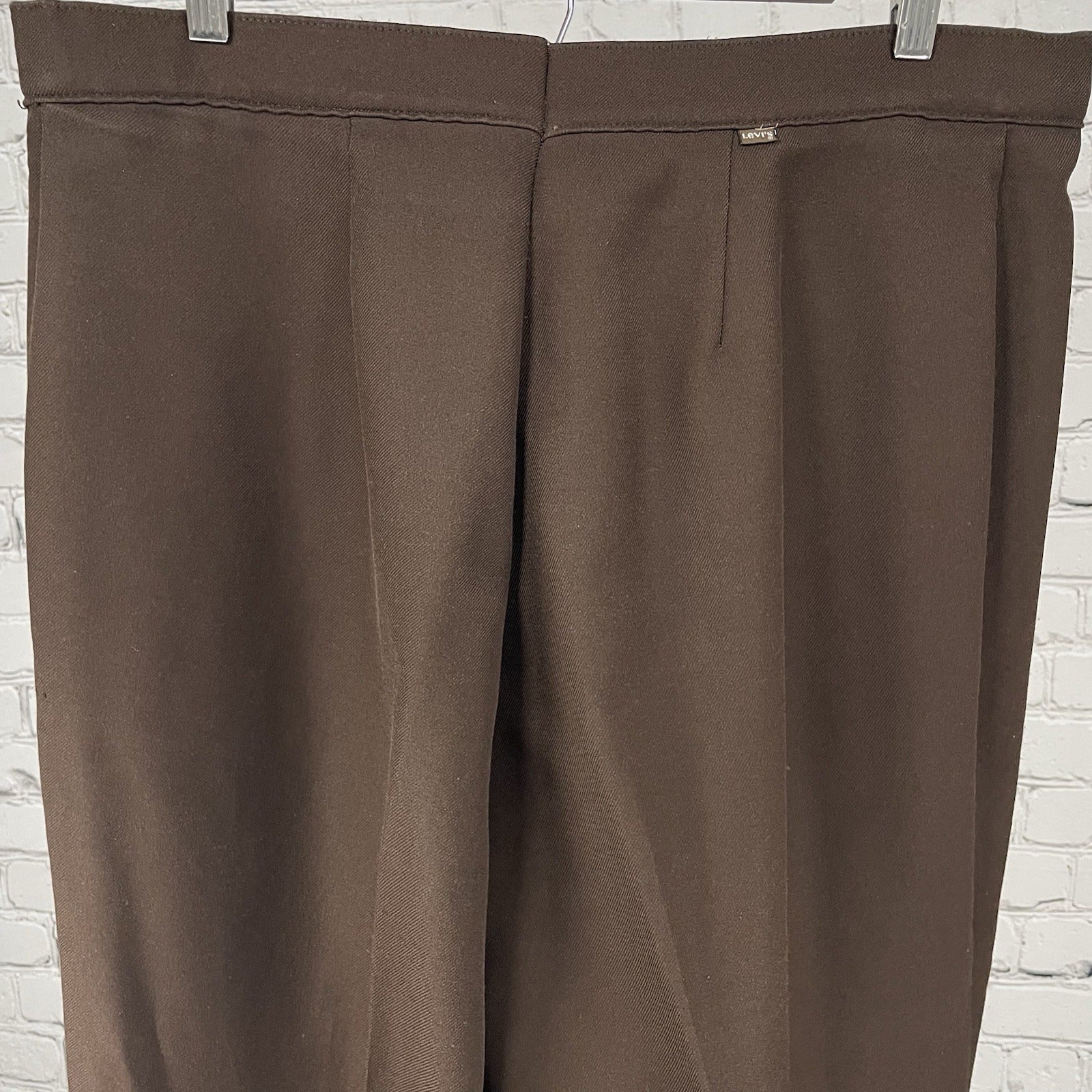 These vintage Levi's dress pants are in a classic brown color, featuring a solid pattern with a straight leg and flat front design. They have a high rise waist size of 36 inches and an inseam of 31 inches, making them suitable for workwear and business occasions. The pants have a zip and button closure, embodying a 90s theme and a timeless fit for a size 36 regular. Perfect for a casual or business look, these Levi Strauss pants offer a touch of vintage style to any wardrobe.
