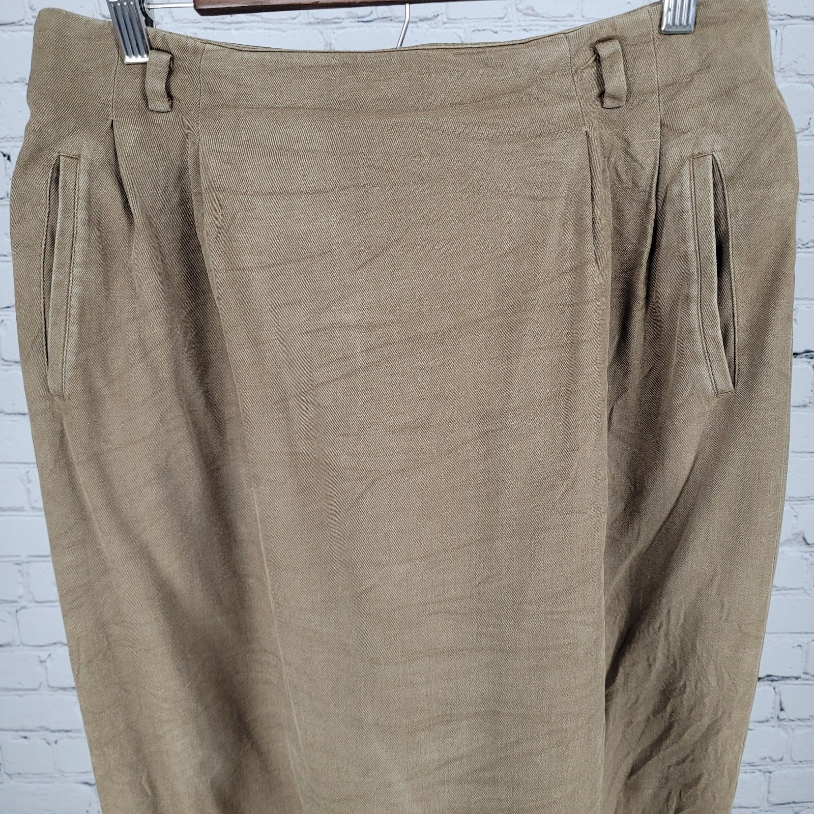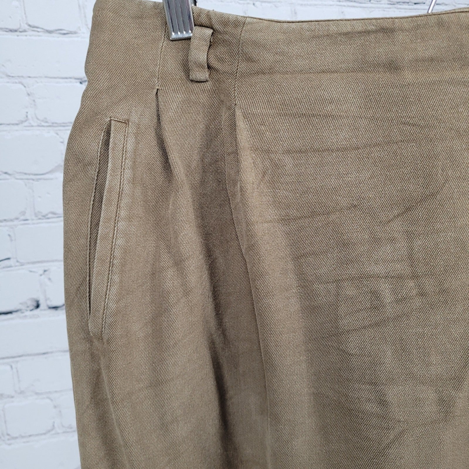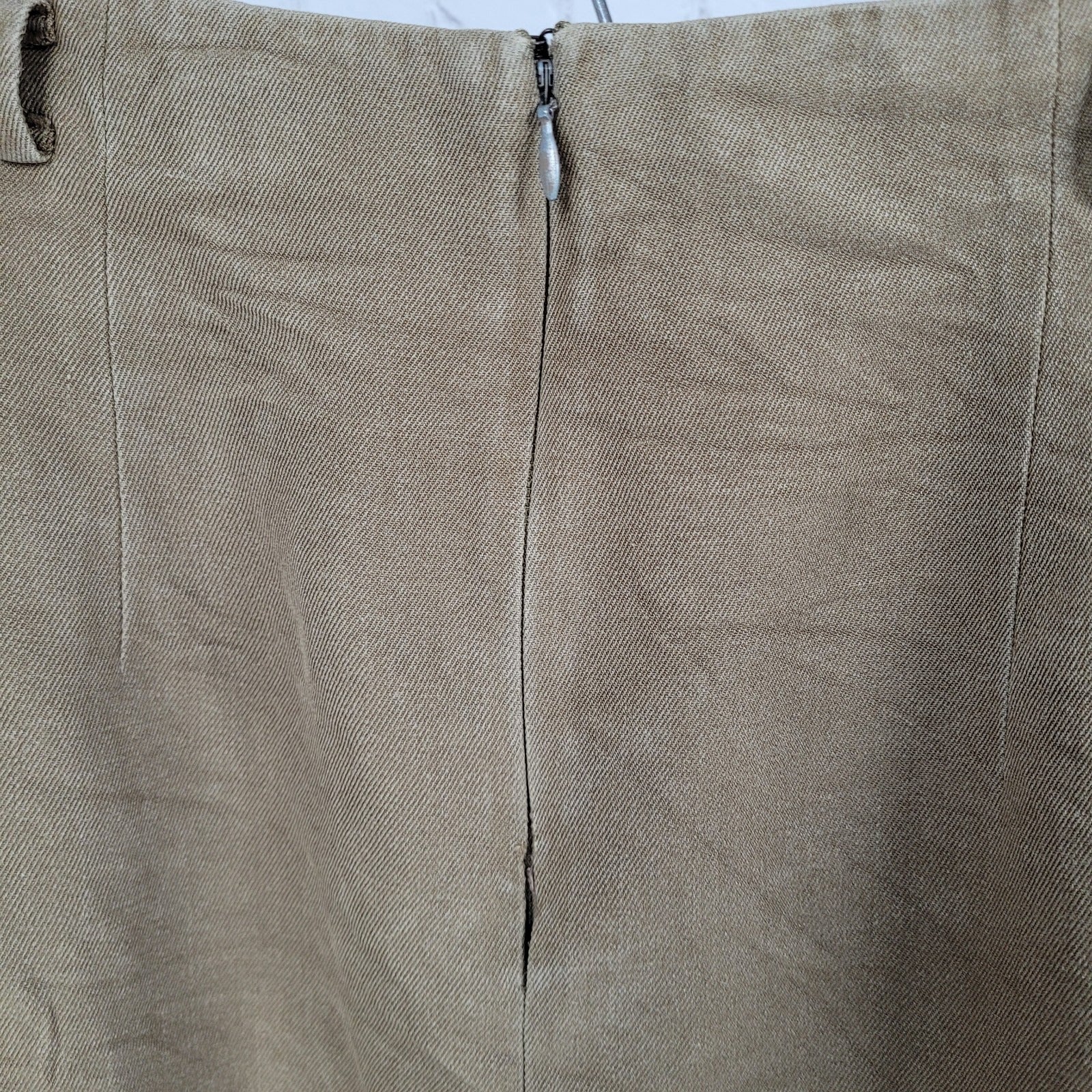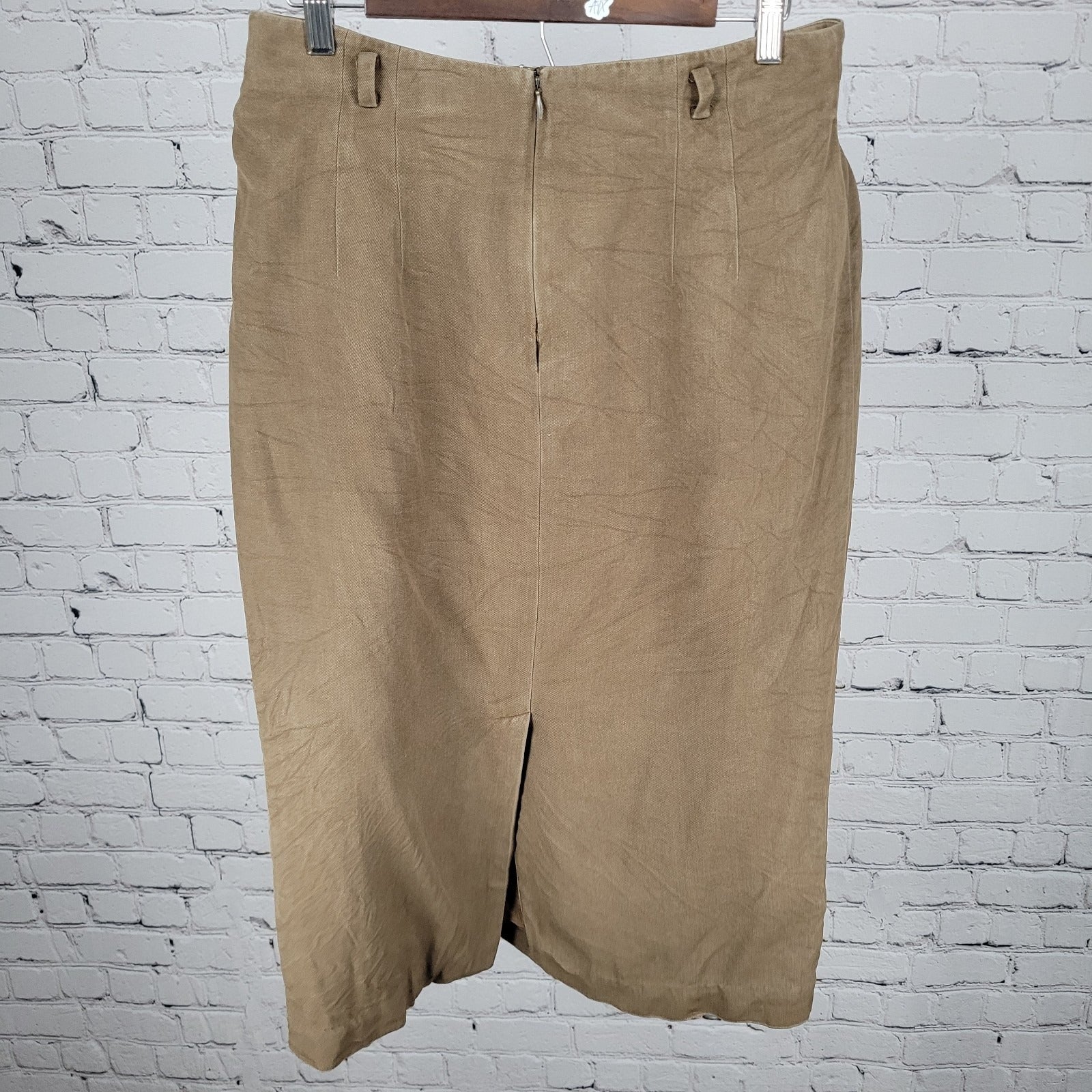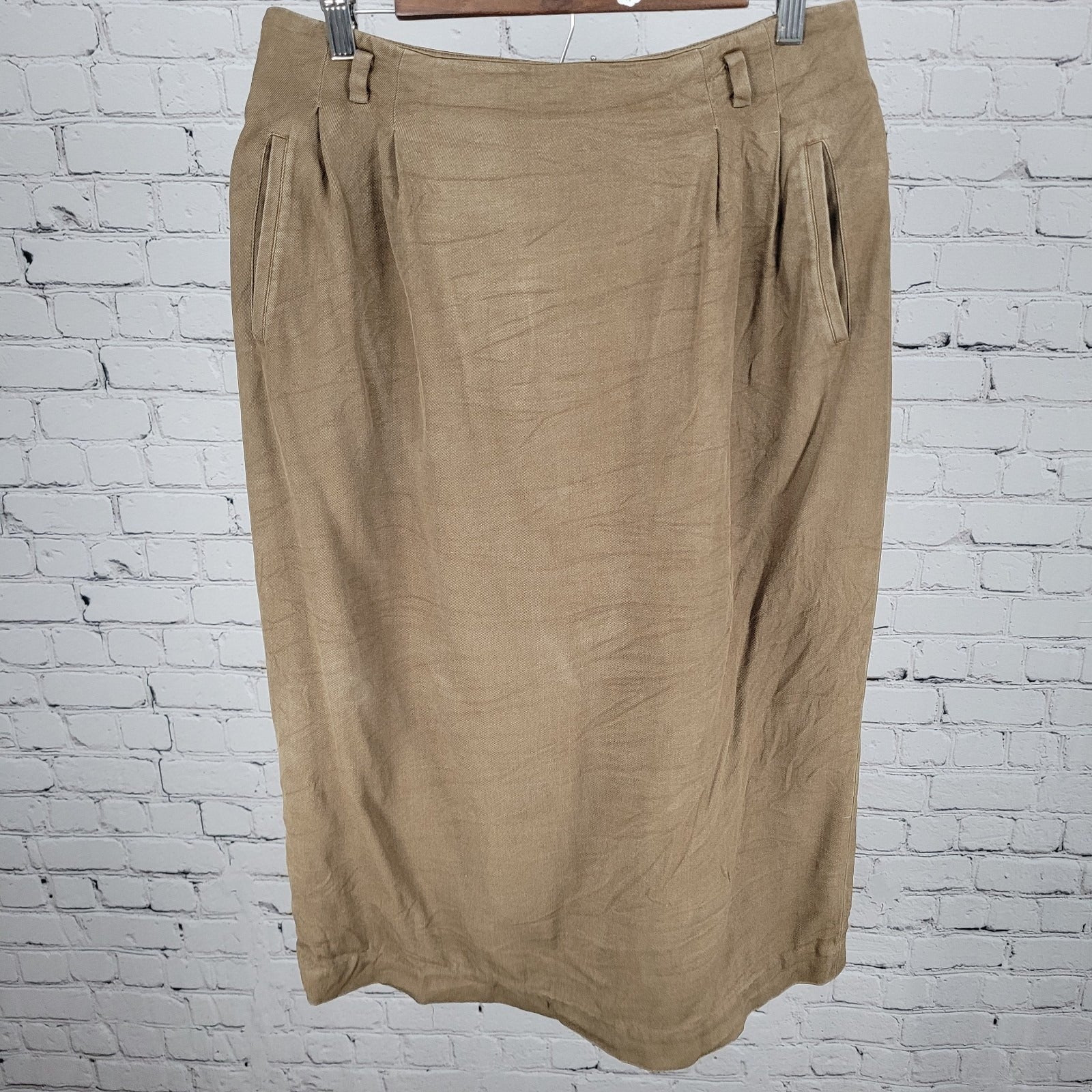 The VTG Linda Allard By Ellen Tracy Brown 100% Silk Pencil Skirt in size 14 is a classic and stylish piece that can be worn for various occasions. Made of luxurious silk, this skirt features a solid brown color with pleated accents, giving it a vintage and sophisticated look. The skirt has a midi length, straight and pencil style, and is lined, making it suitable for year-round wear. With a zip closure and pockets, this skirt is perfect for travel, parties, casual outings, work, or business meetings. Made in Hong Kong, this skirt exudes a city chic vibe, ideal for the fashion-forward woman.