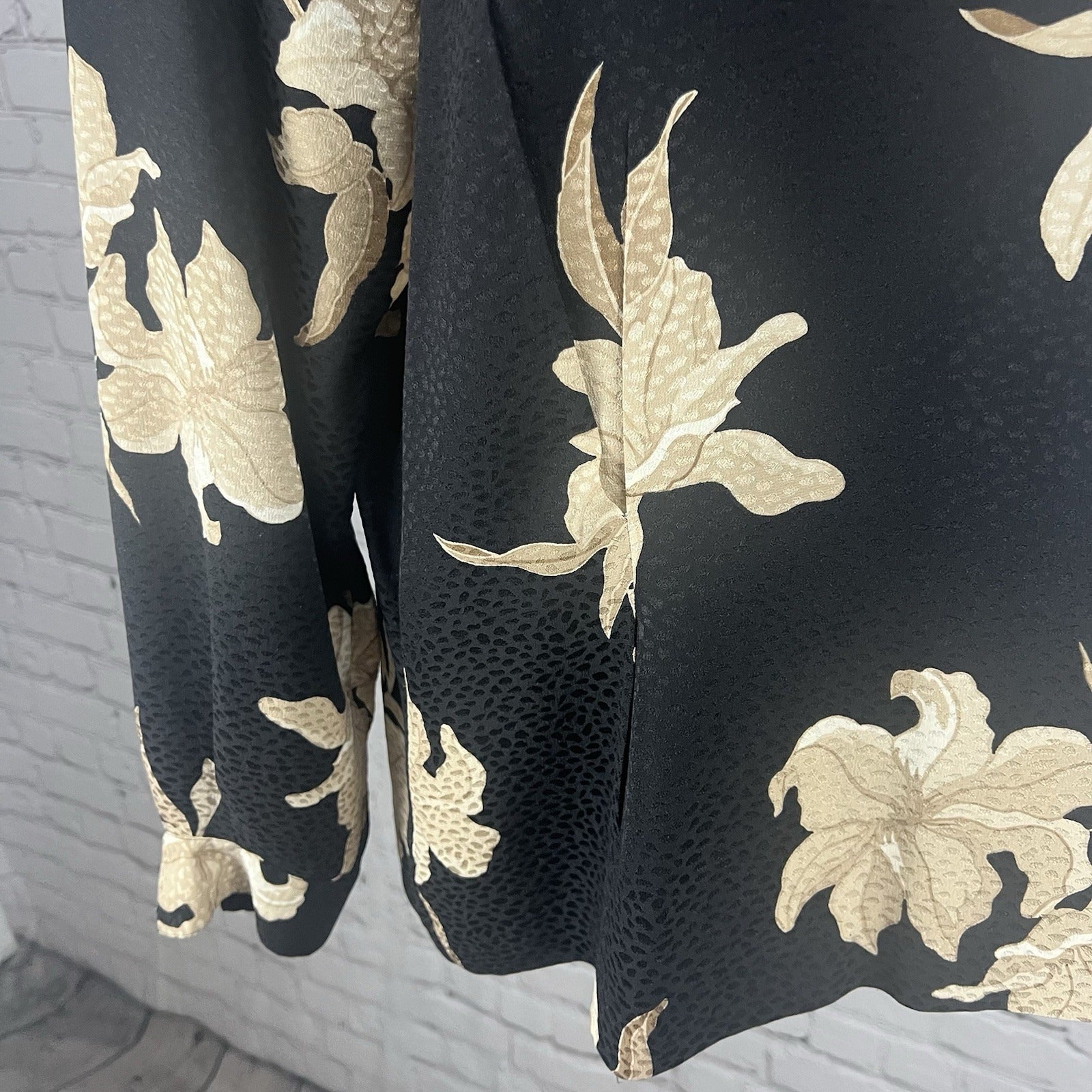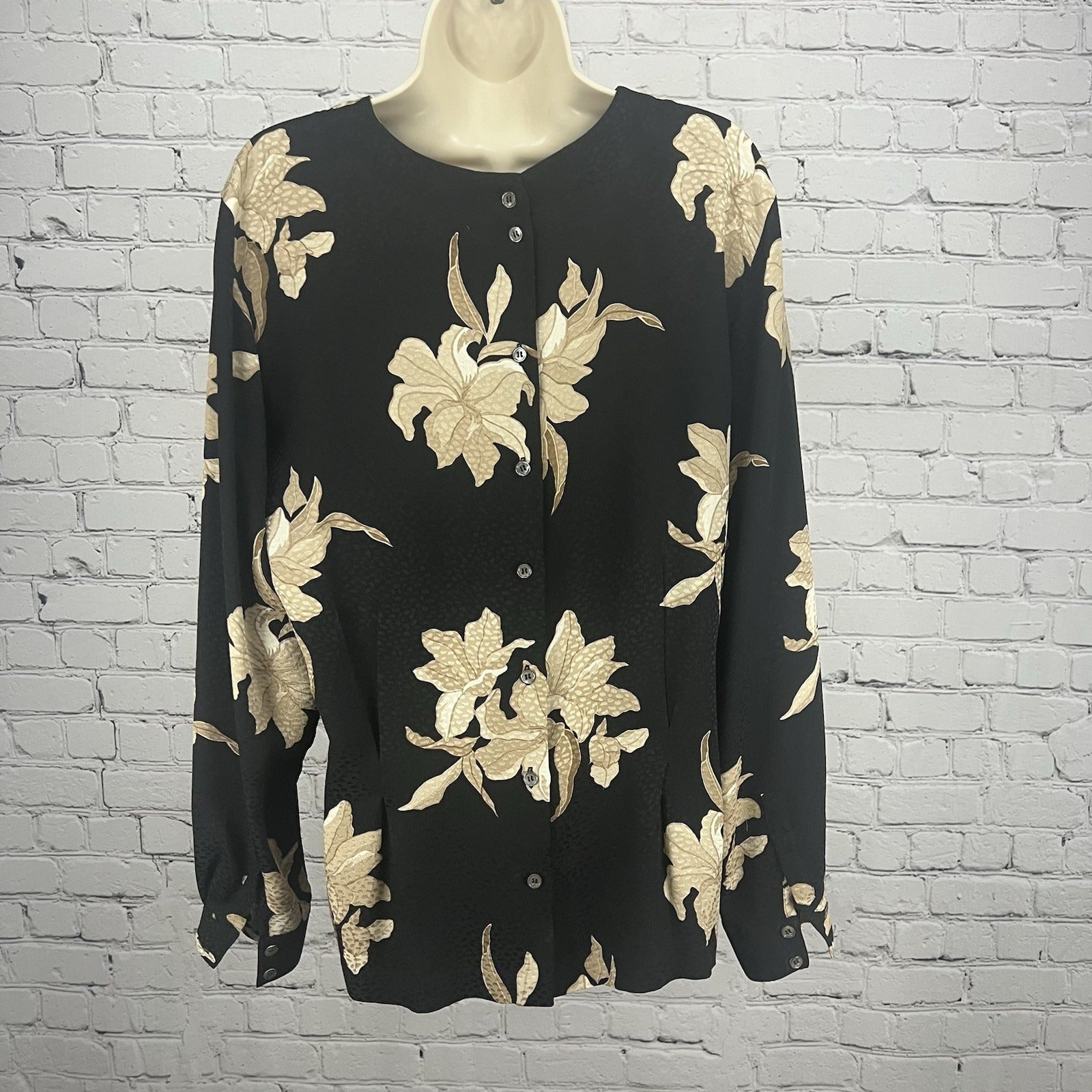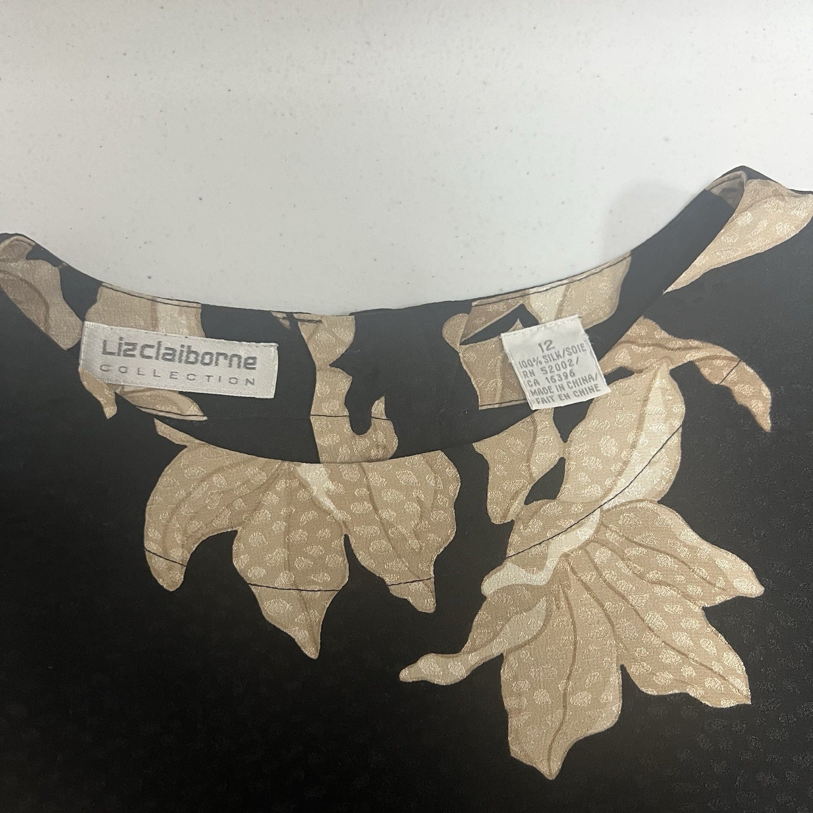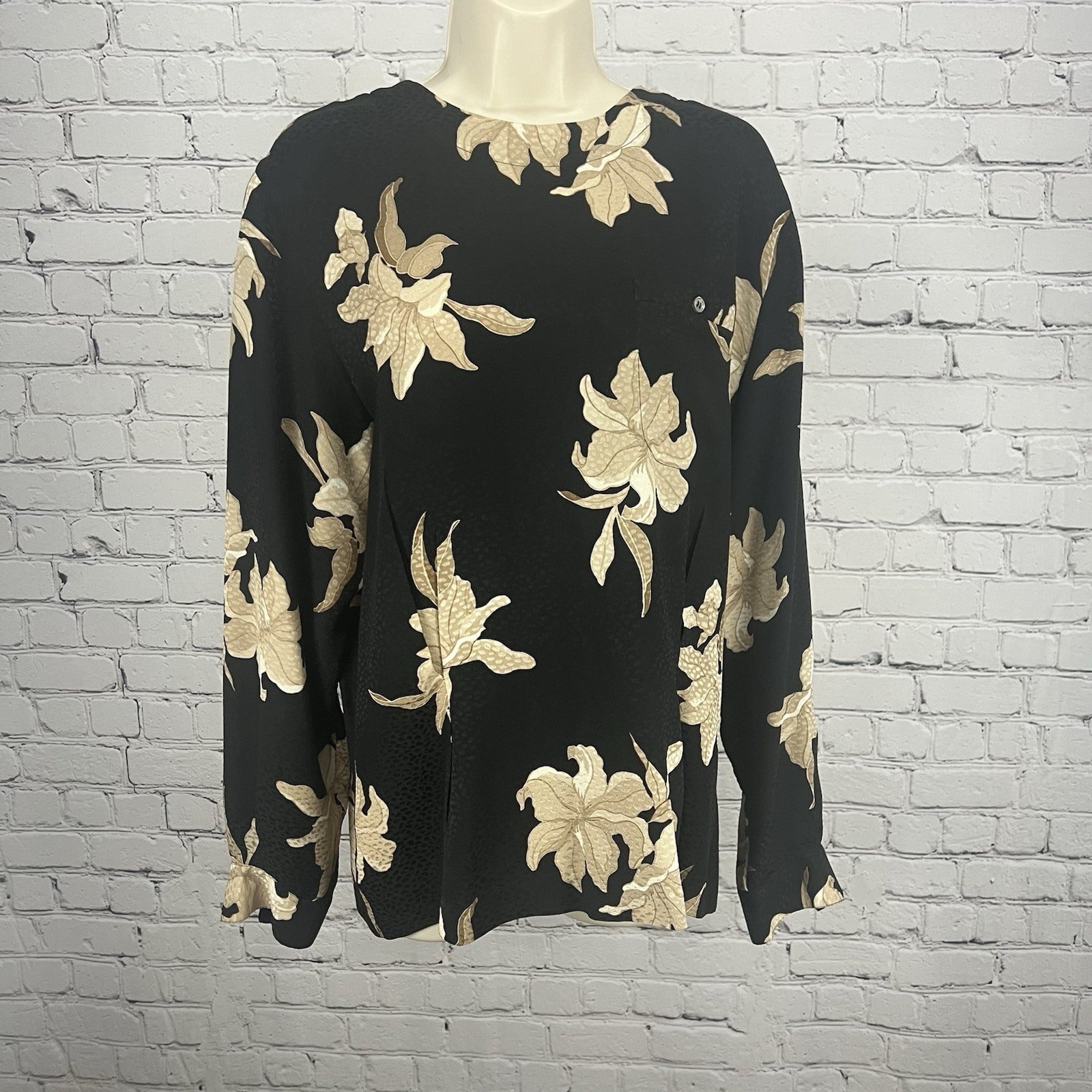 VTG Liz Claiborne Black Tan Floral Silk Back Button Up Long Sleeve Blouse 12