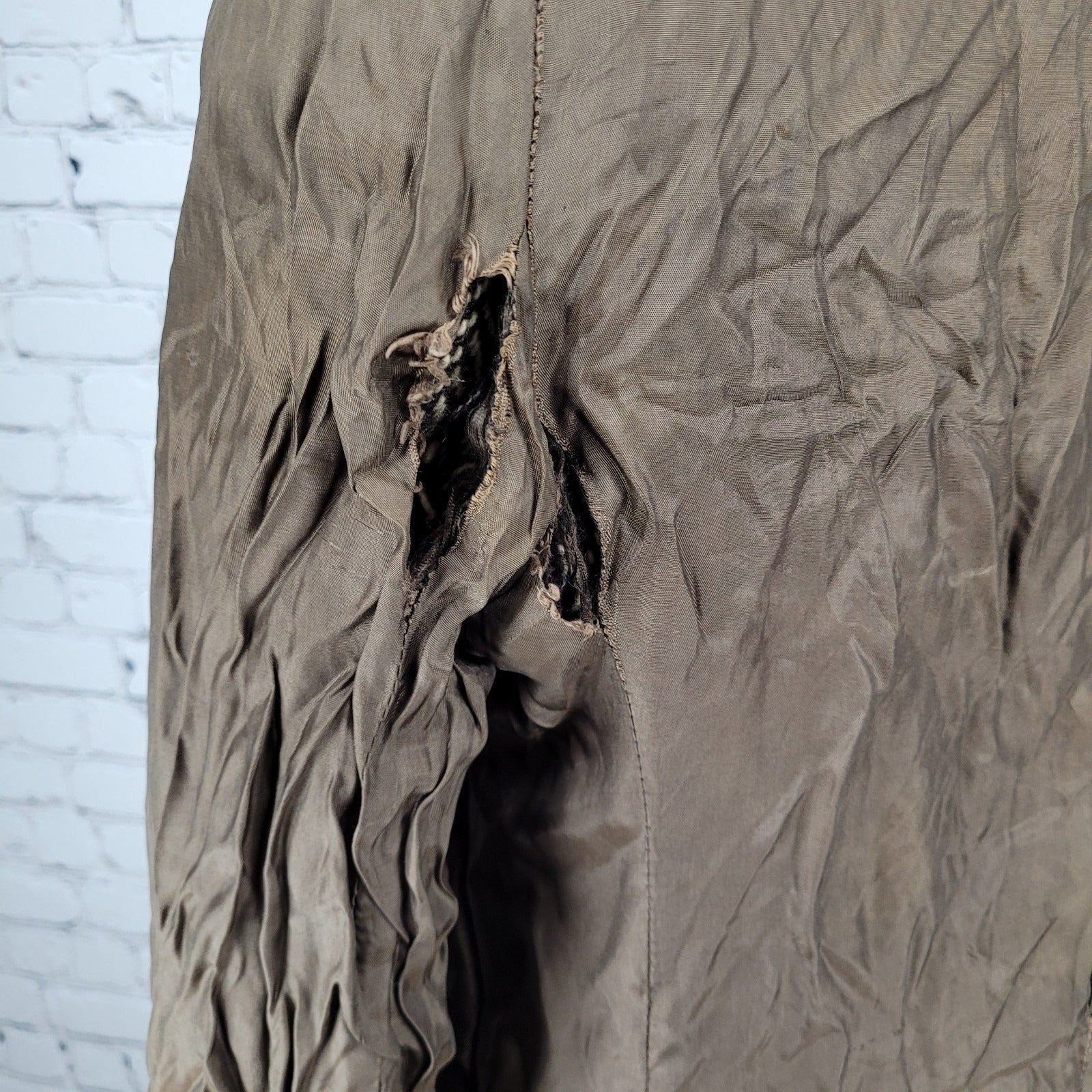 Holes in lining, hole in upper back, snag on sleeve, staining throughout front and faded materials label, as pictured.