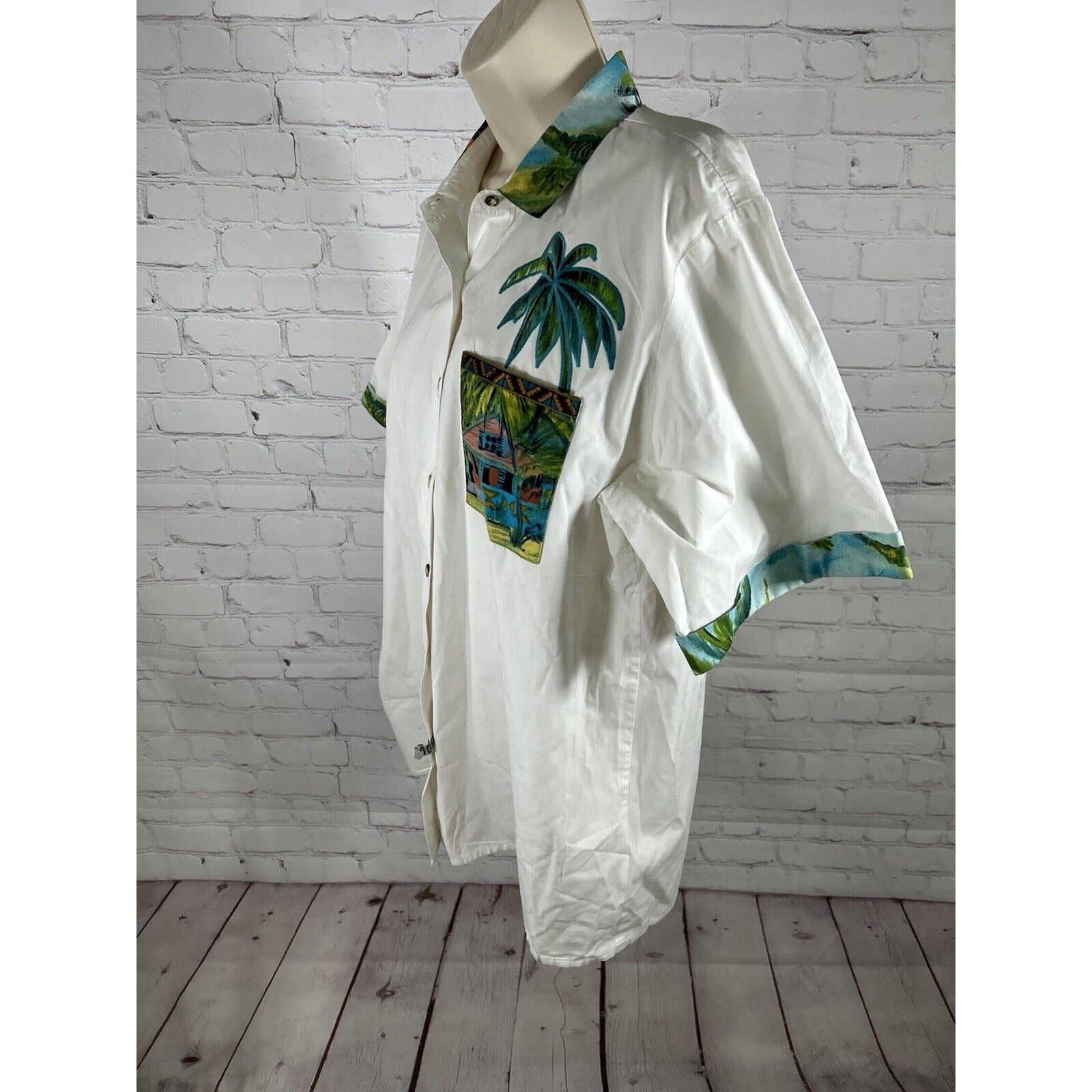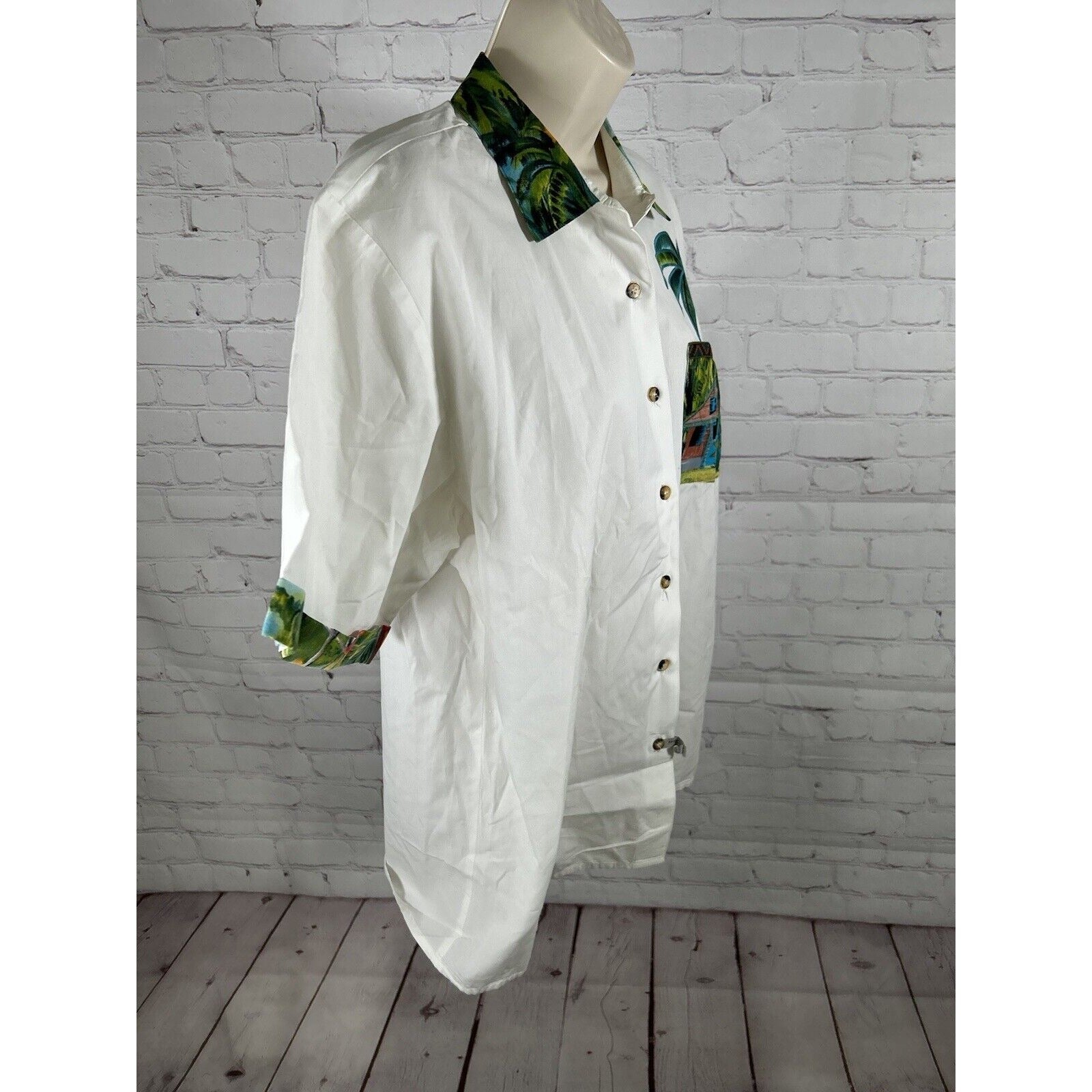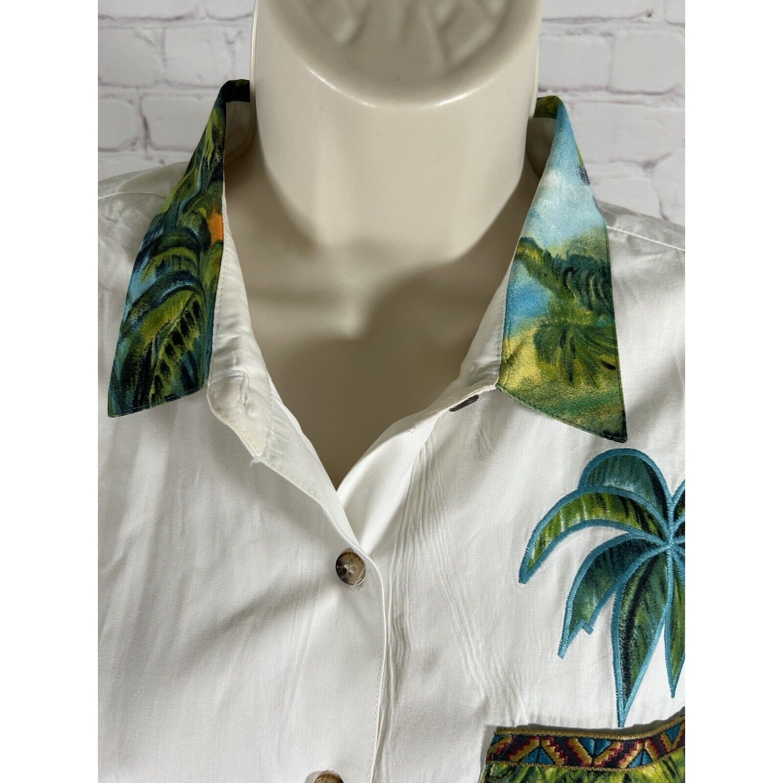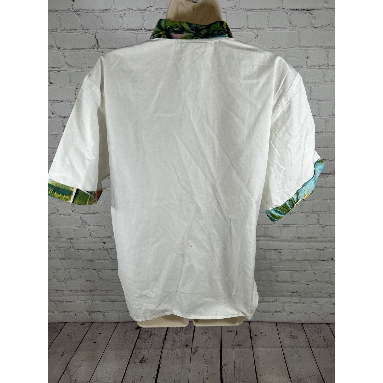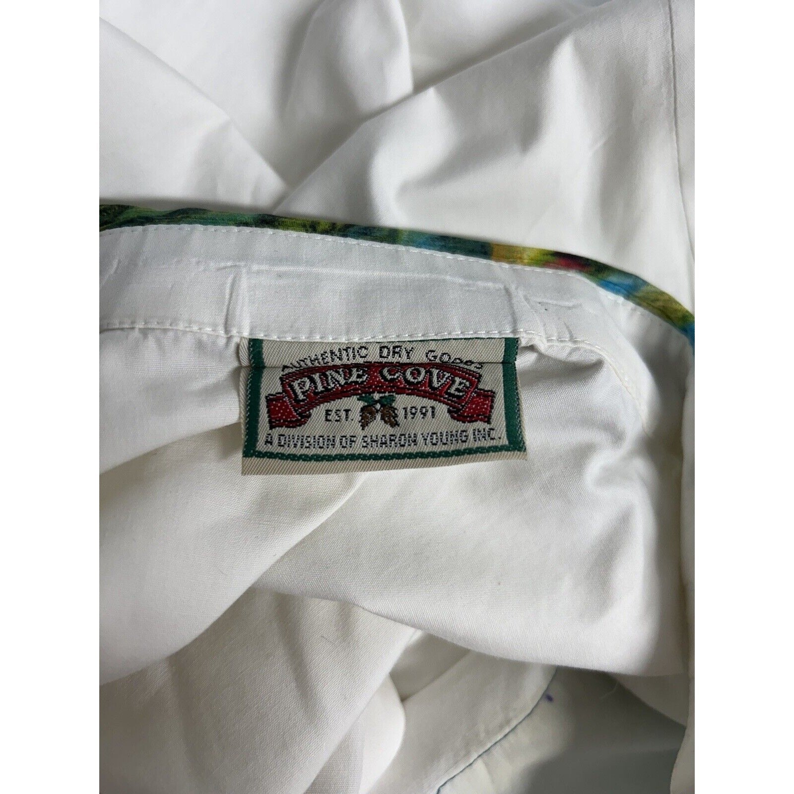 This vintage Pine Cove Authentic Dry Goods button-up shirt is the perfect addition to any summer, fall, or spring wardrobe. The shirt features short sleeves, a collared neckline, and a casual sleeve type. It comes in a beautiful white color with a tropical and Hawaiian theme, making it ideal for beach vacations or casual outings.
