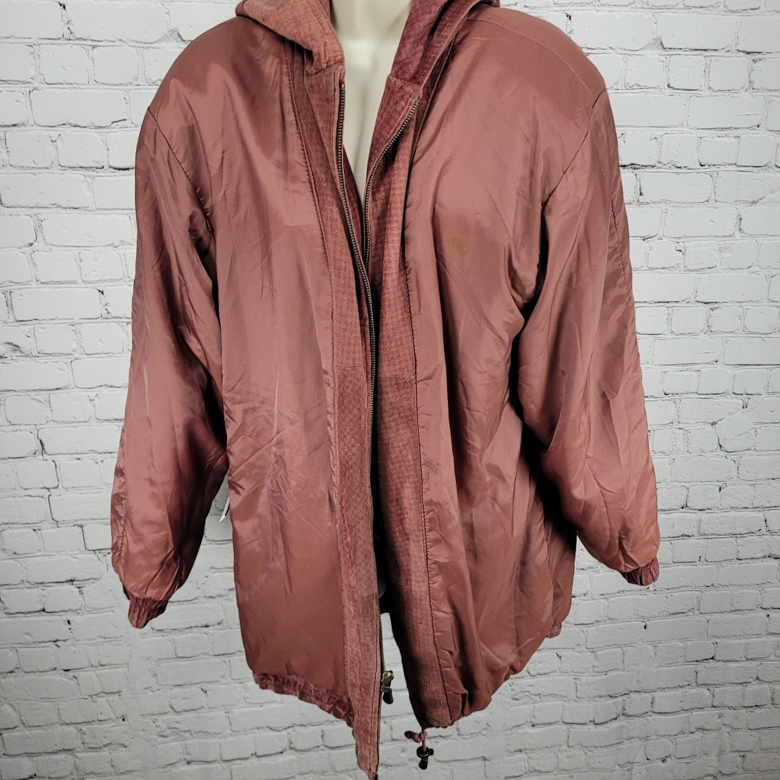 The VTG Preston & York Red Genuine Suede Houndstooth Hooded Zip Jacket in size Large is a vintage piece perfect for casual, workwear, or travel occasions. Made with genuine suede outer shell material and lined with a warm nylon lining, this mid-length jacket features long sleeves, a relaxed fit, and a full zip closure with a hood for added protection. With a classic houndstooth pattern in a muted red color, this jacket also includes shoulder pads, pockets, and is insulated for the winter and fall seasons. Perfect for adding a touch of retro style to your wardrobe.