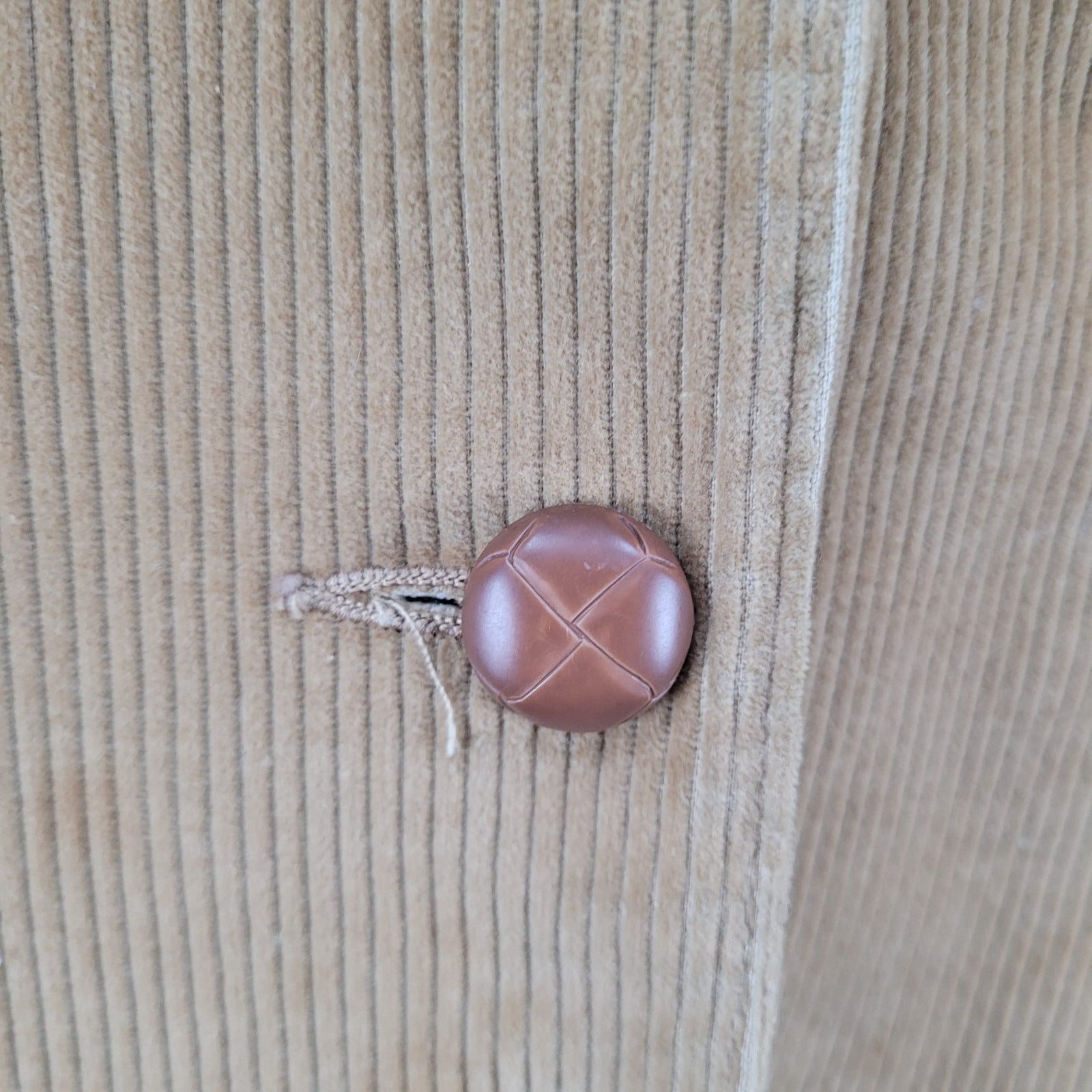 The product is a vintage Sears brown corduroy buttoned unlined notch blazer jacket in size medium for women. This blazer features a classic design with a corduroy fabric, making it a stylish and versatile addition to any woman's wardrobe. The unlined feature adds a touch of sophistication and the buttoned notch detail adds a timeless flair to the overall look. Perfect for both casual and more dressed-up occasions, this blazer is sure to become a go-to piece.