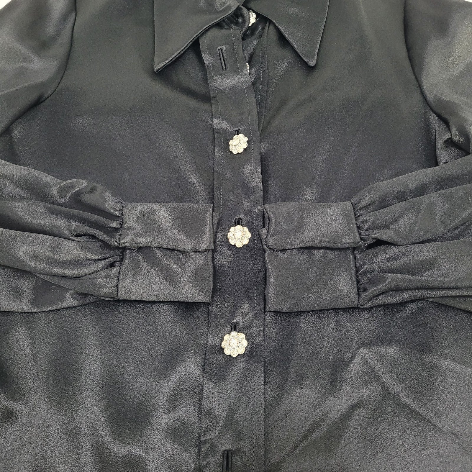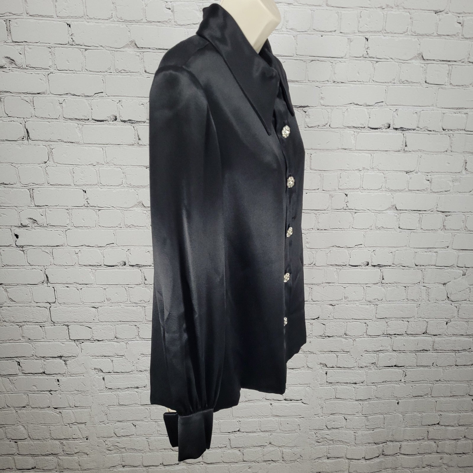 This VTG unbranded black satin button-up blouse, made in the USA, exudes a classic yet stylish look perfect for women size 14. The long sleeves and rhinestone accents add a touch of glamour, making it versatile for various occasions. The black color theme gives it a sleek and timeless appeal, perfect for showcasing your unique style in a sophisticated manner. Perfect for adding a pop of sparkle to your wardrobe while staying on-trend with a classic design.