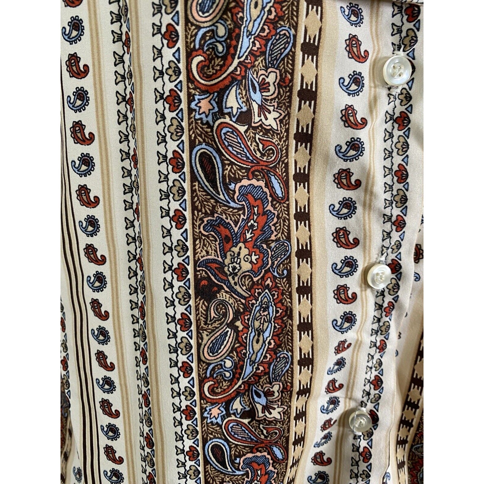 Add a pop of color and classic style to your wardrobe with this beautiful multicolored blouse. Featuring a paisley pattern and a stylish neck tie, this blouse is perfect for any occasion, whether it's for travel, workwear, or casual events. The long sleeves and collared neckline give it a timeless, retro look that's perfect for any season.