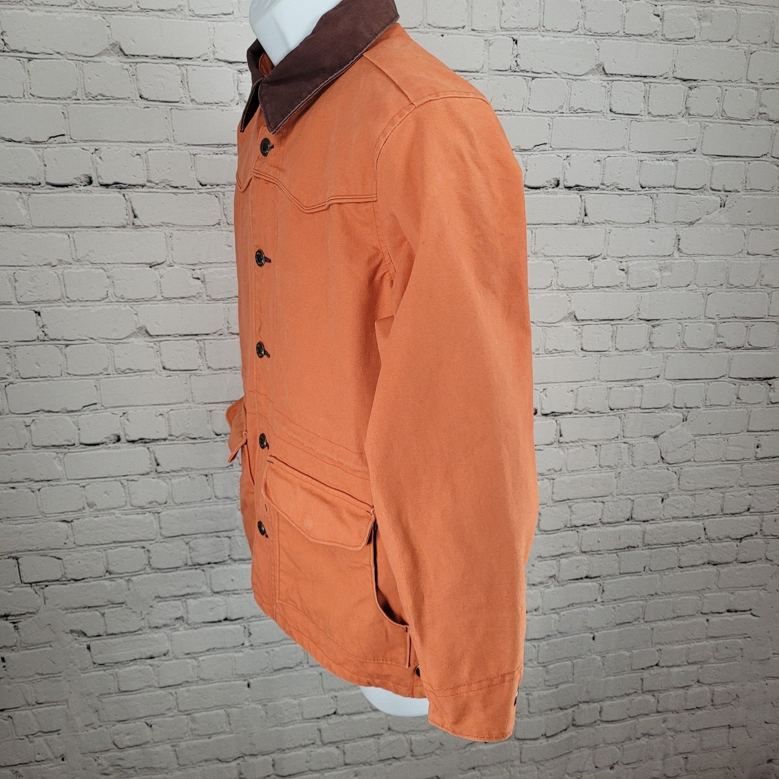 The Walls Orange Authentic Ranchwear Zip & Snap Jacket in boys size medium (10-12) is a stylish and versatile outerwear piece perfect for casual or activewear occasions. Made from 100% cotton with a solid orange color, this mid-length jacket features a zip closure, long sleeves, and a collared neckline. The jacket is lined with 100% cotton and includes a back embroidered logo accent, adding a touch of Western flair to the classic design. With easy care instructions and convenient pockets, this jacket is a practical and fashionable choice for boys during the winter, fall, and spring seasons.