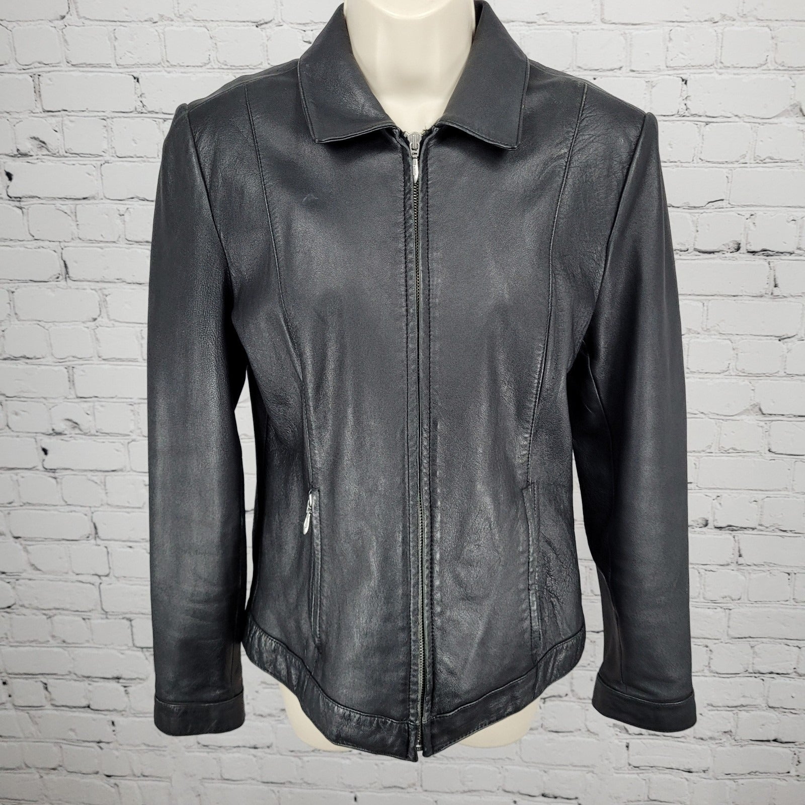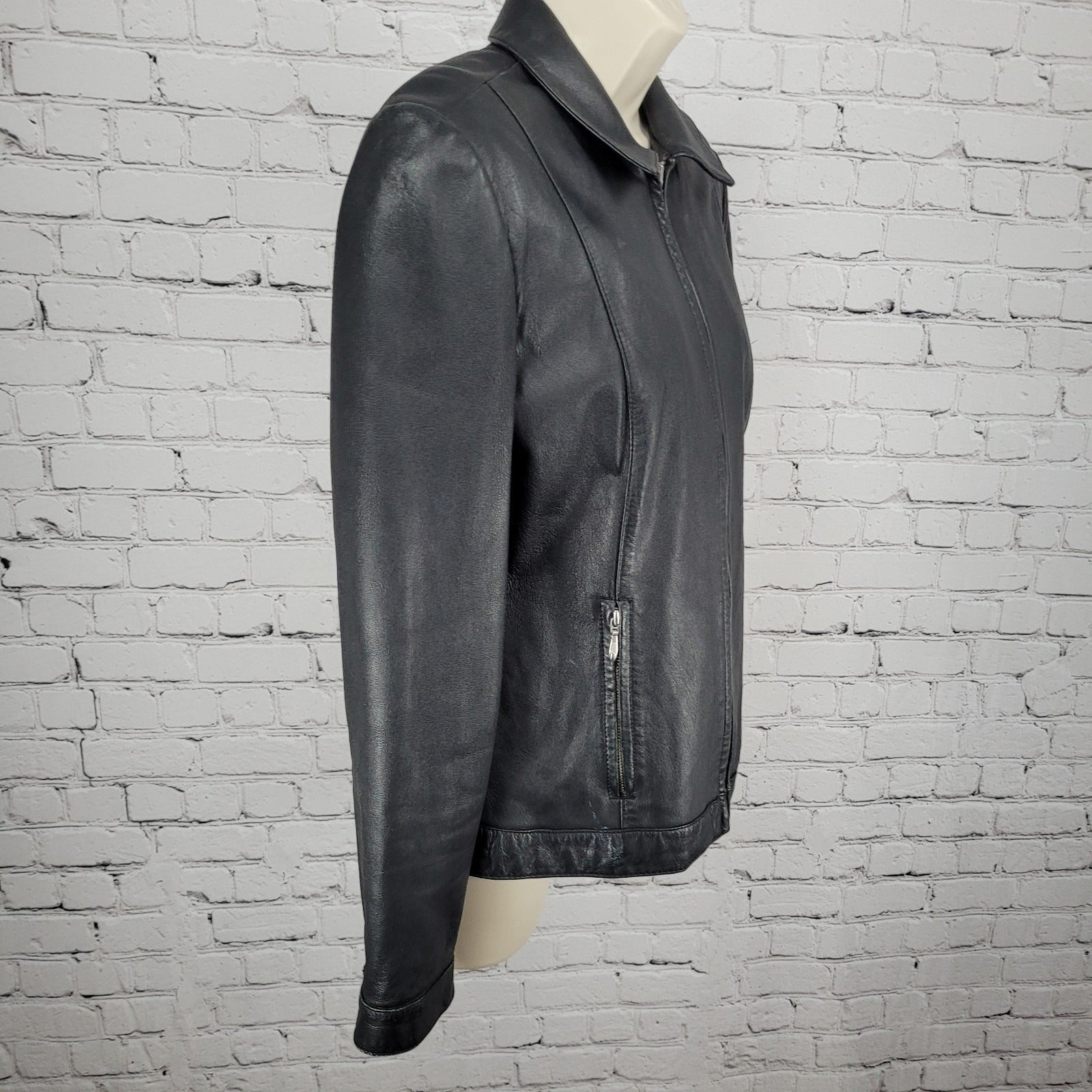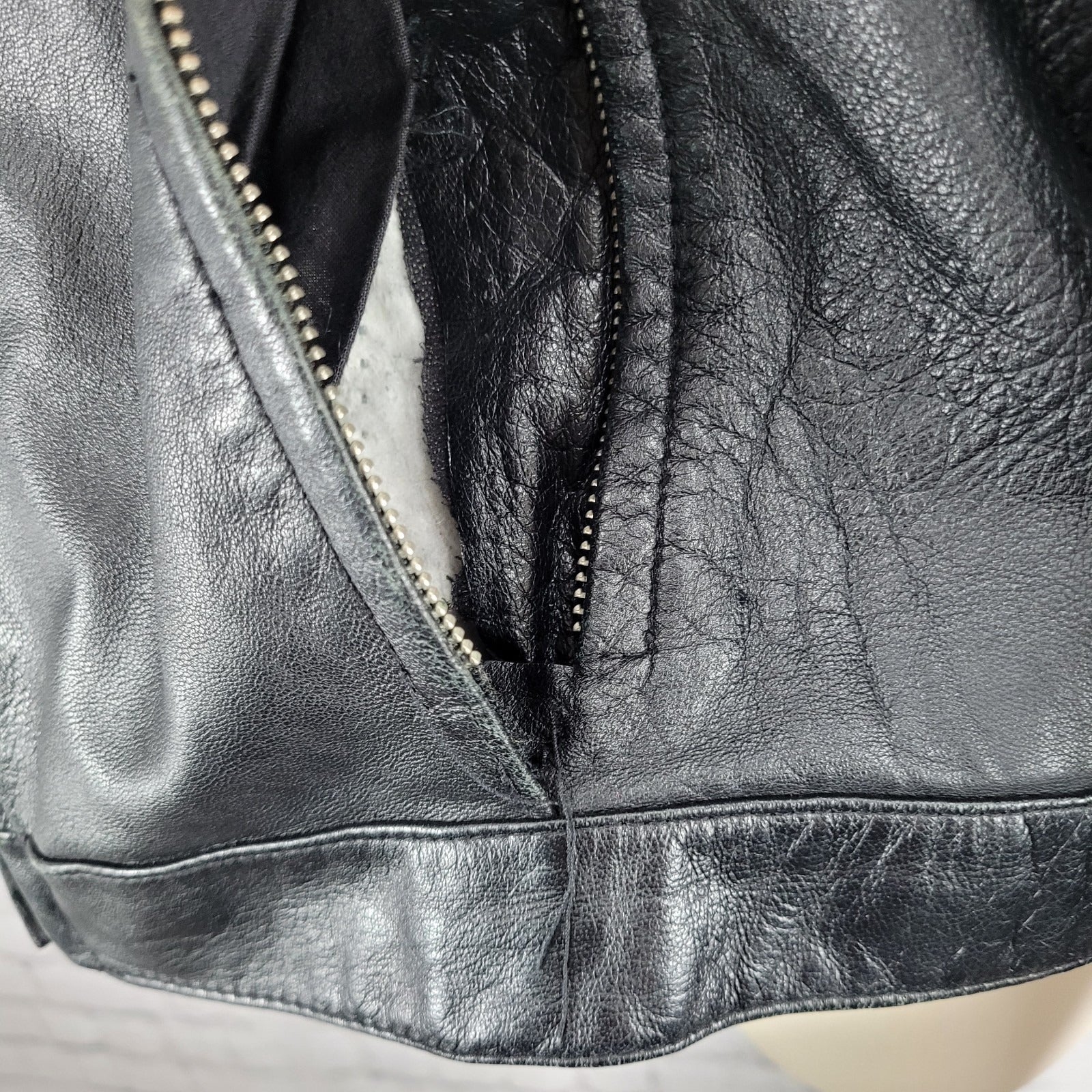 The VTG Wilsons Genuine Leather Maxima Black Full Zip Thinsulate Jacket in Medium size is a stylish and versatile outerwear option for women. Made with high-quality leather and featuring a classic solid black color, this short jacket with long sleeves and a full zip closure is perfect for various occasions such as travel, casual outings, or workwear. The jacket is lined with polyester for added warmth and comfort, and includes convenient pockets and a collared neckline for added style. With its vintage appeal and biker-inspired theme, this Wilsons Leather jacket is a timeless piece for the winter, fall, and spring seasons.
