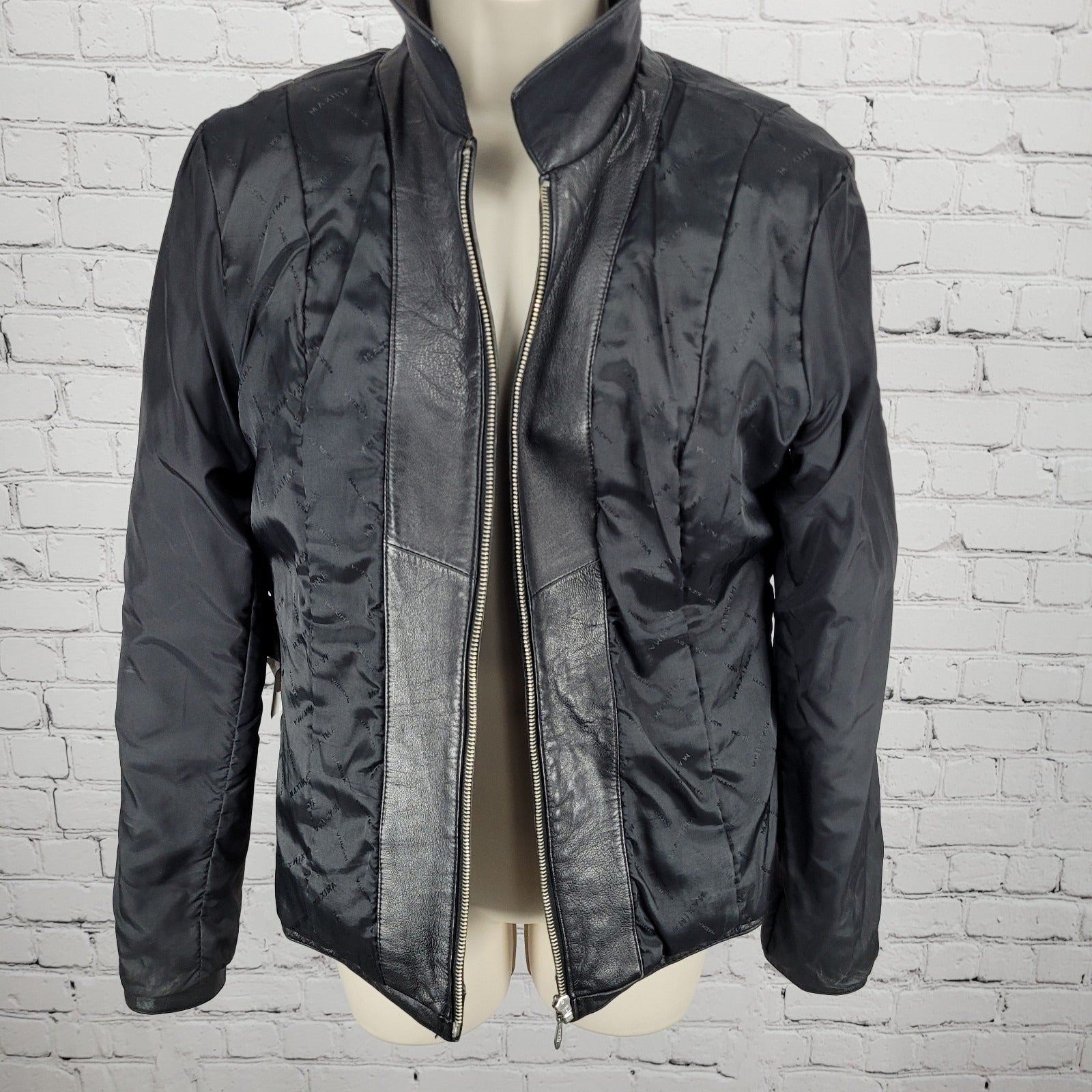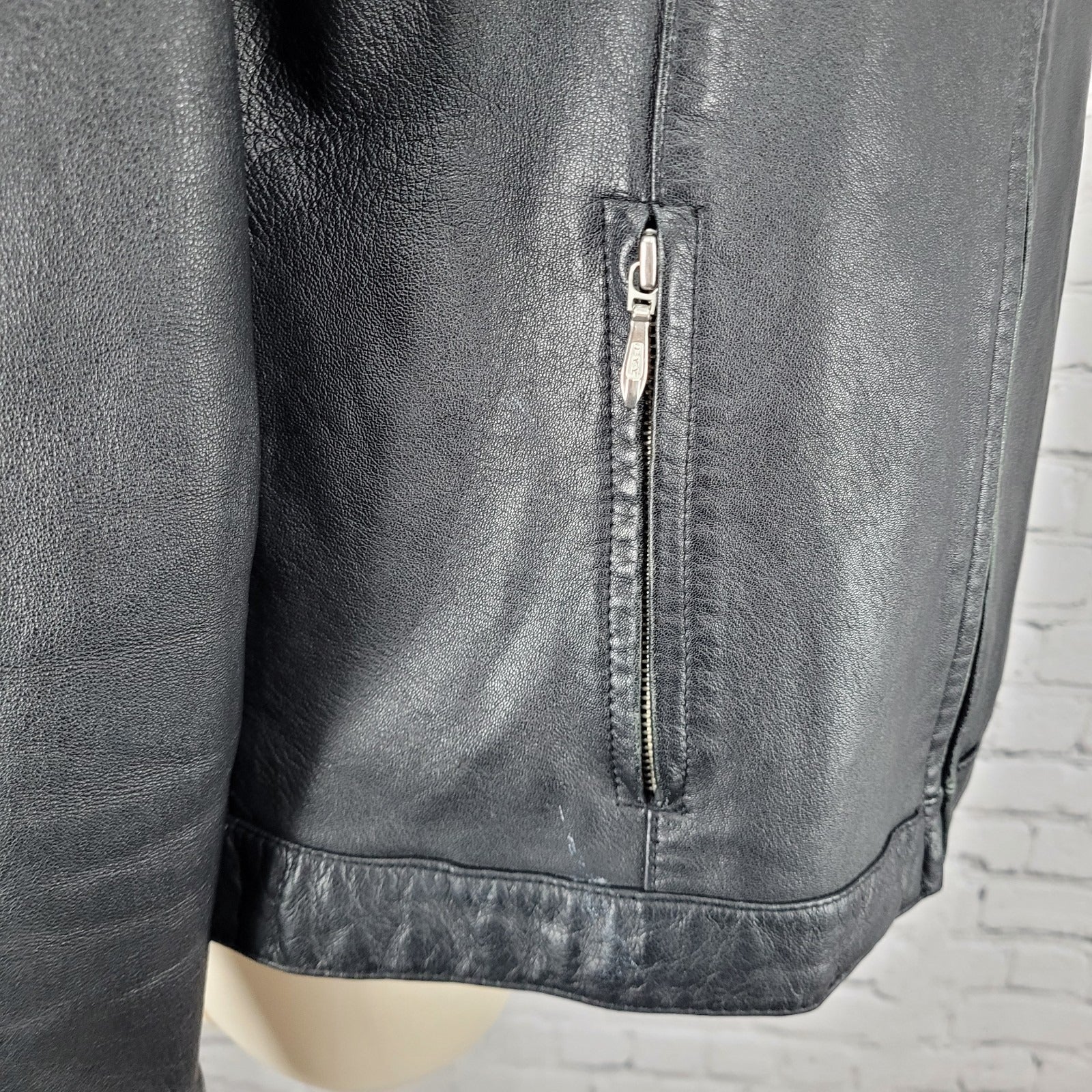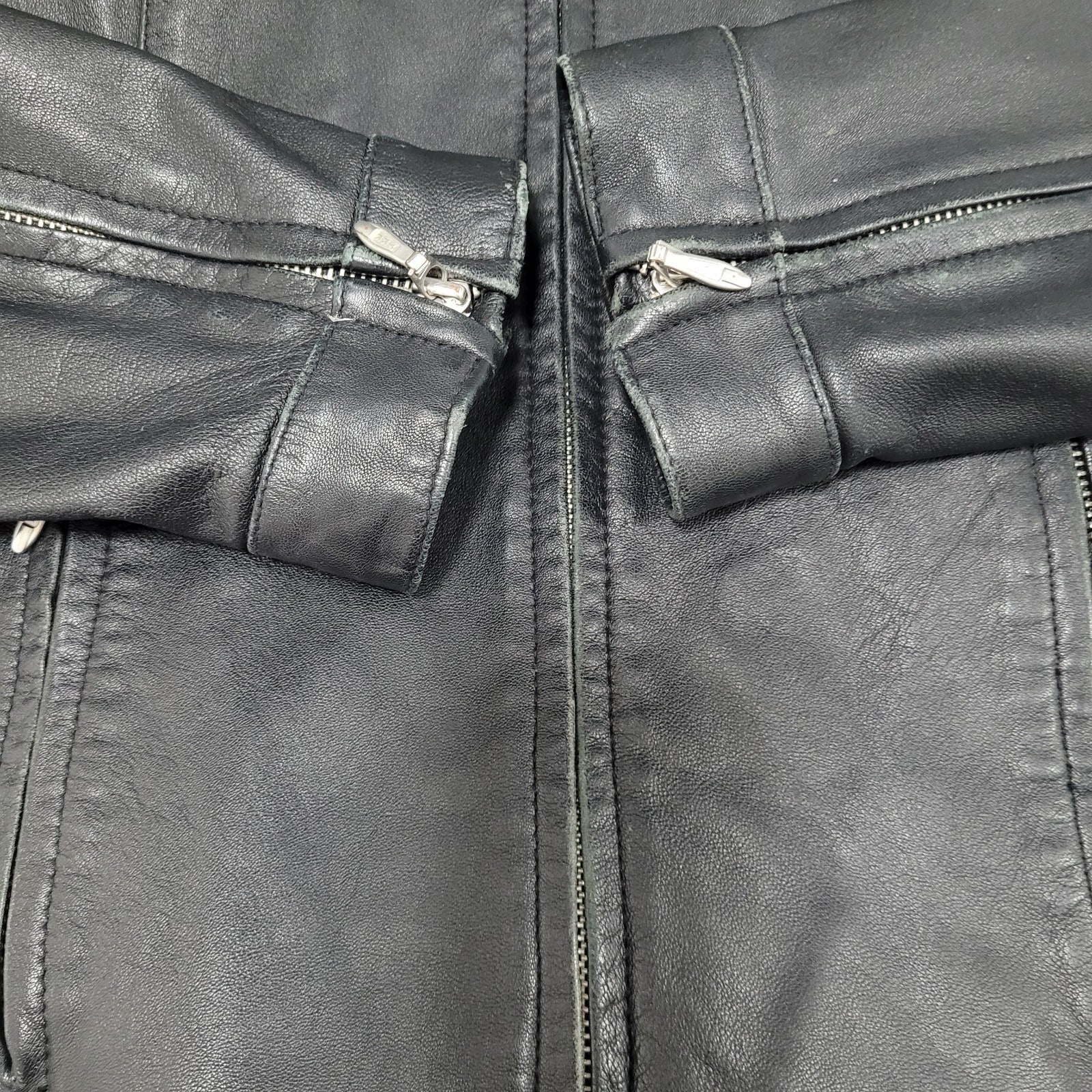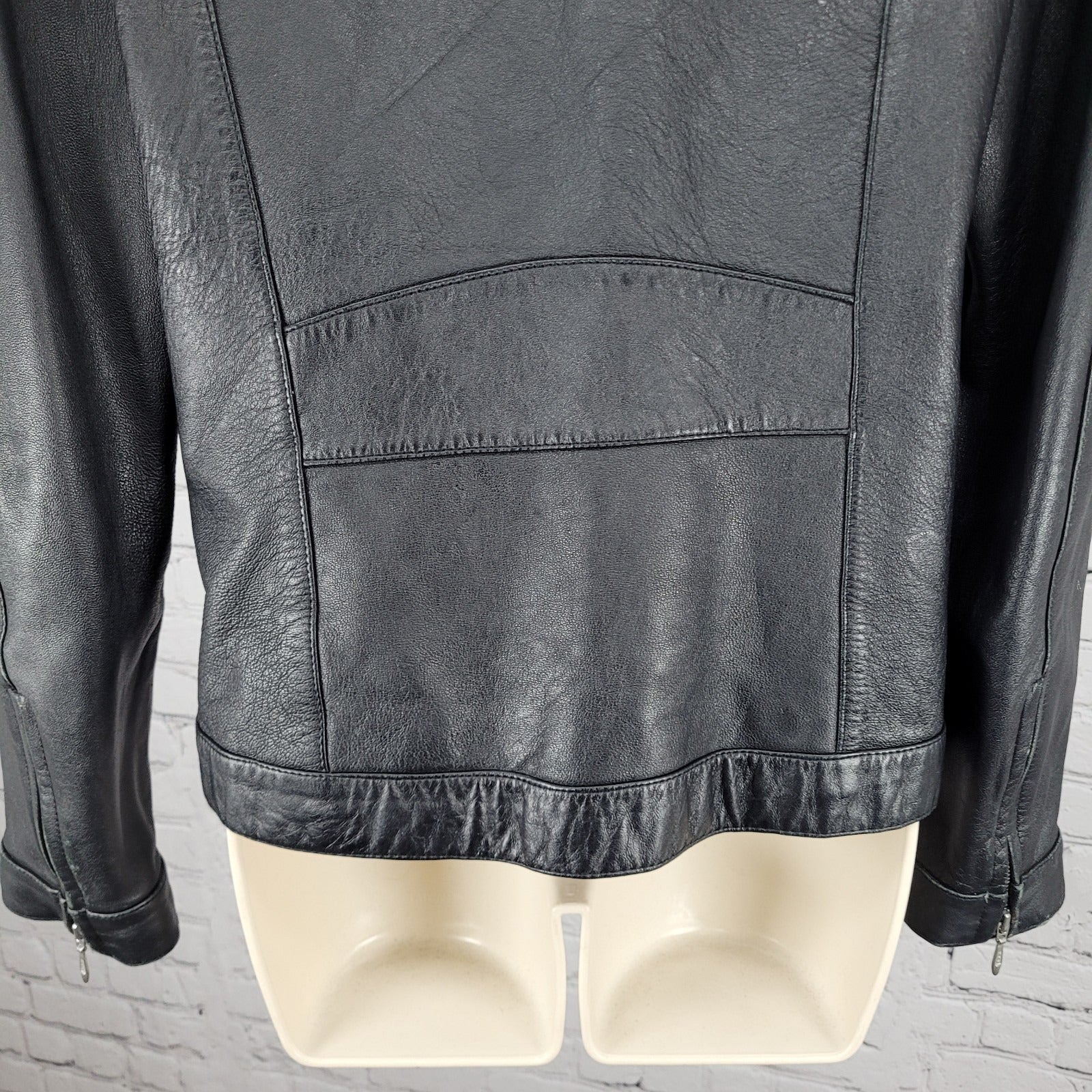 The VTG Wilsons Genuine Leather Maxima Black Full Zip Thinsulate Jacket in Medium size is a stylish and versatile outerwear option for women. Made with high-quality leather and featuring a classic solid black color, this short jacket with long sleeves and a full zip closure is perfect for various occasions such as travel, casual outings, or workwear. The jacket is lined with polyester for added warmth and comfort, and includes convenient pockets and a collared neckline for added style. With its vintage appeal and biker-inspired theme, this Wilsons Leather jacket is a timeless piece for the winter, fall, and spring seasons.