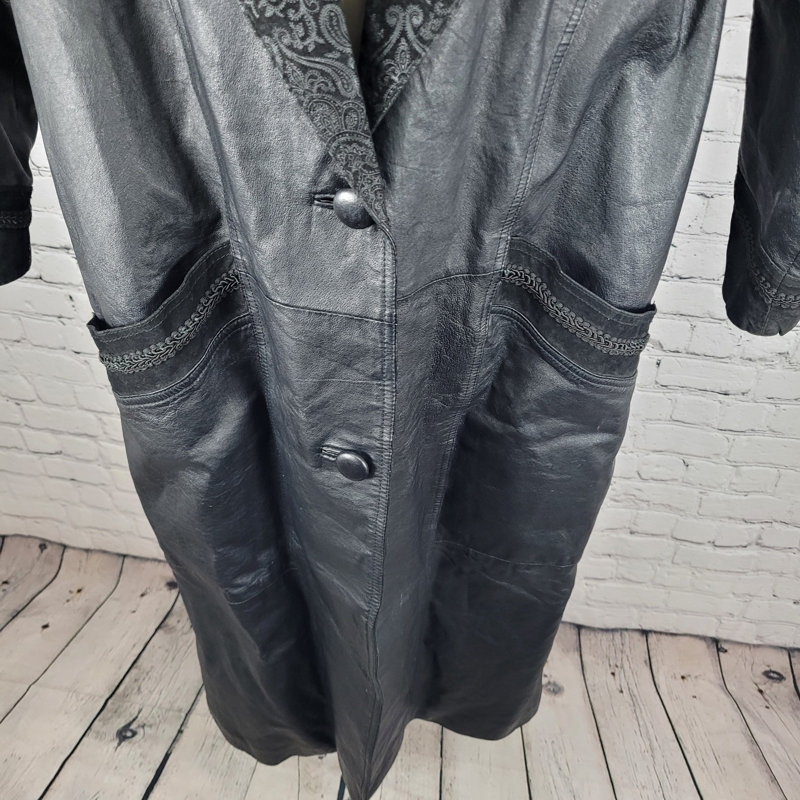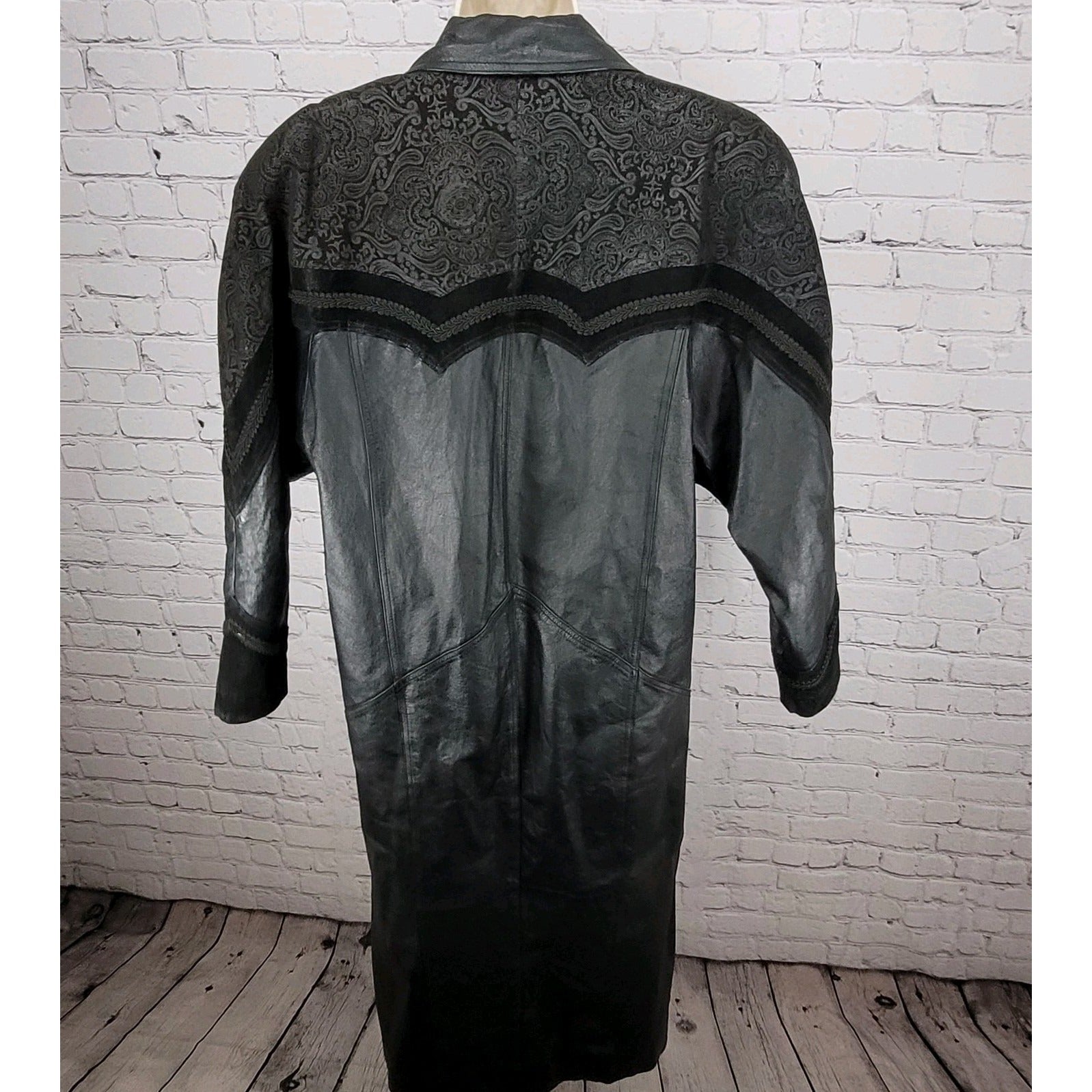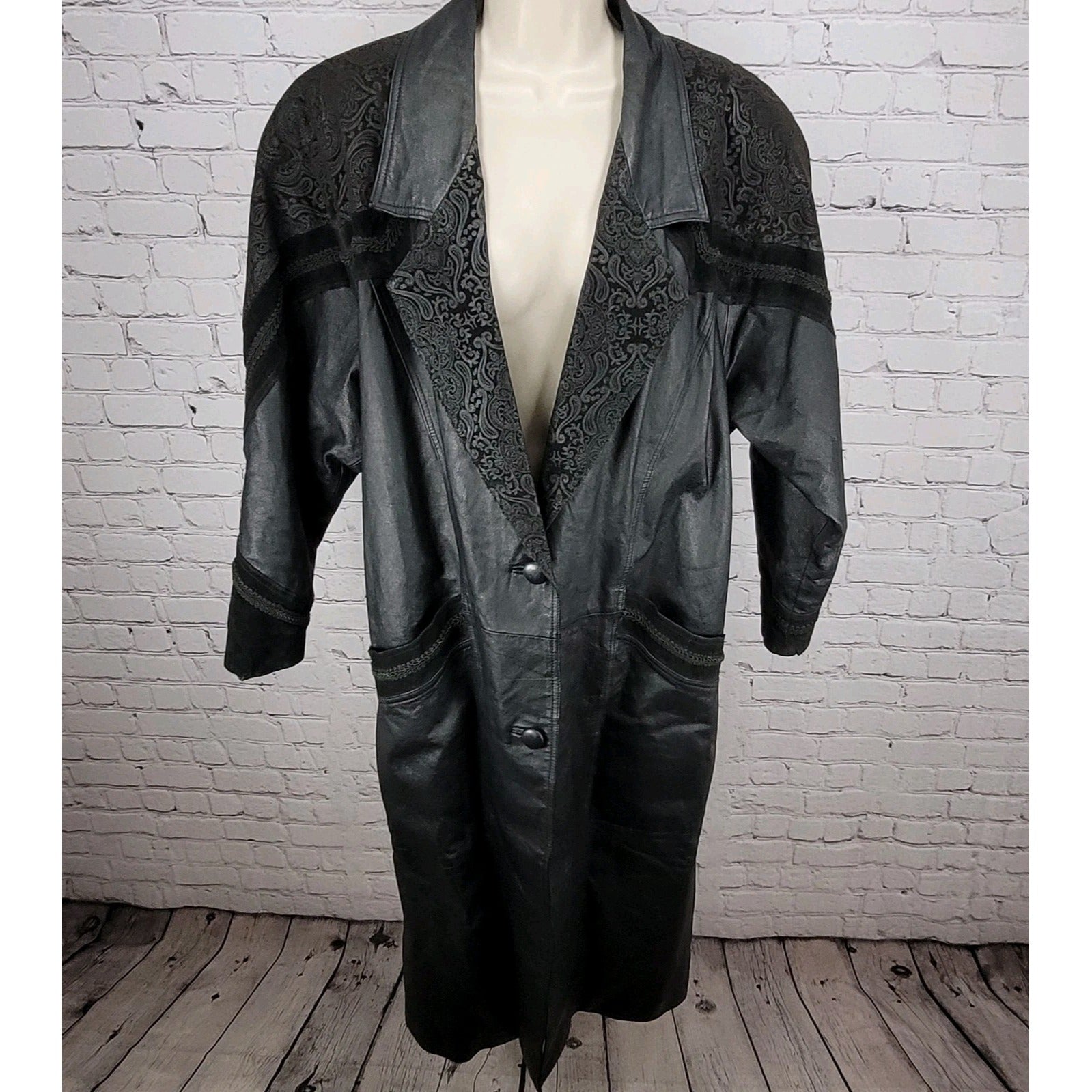 VTG Winlit Black Genuine Leather Suede Paisley Trench Long Jacket Coat L *defect