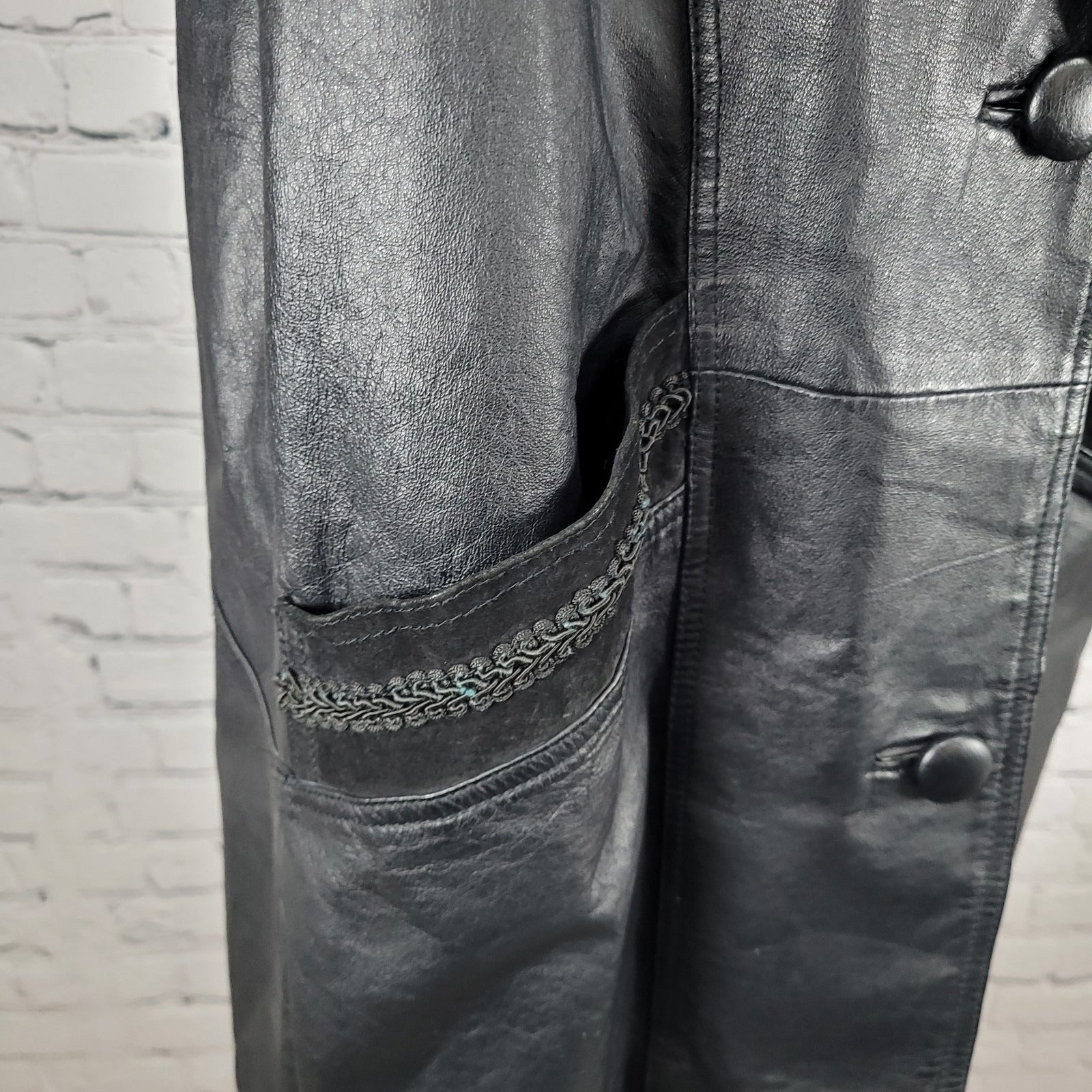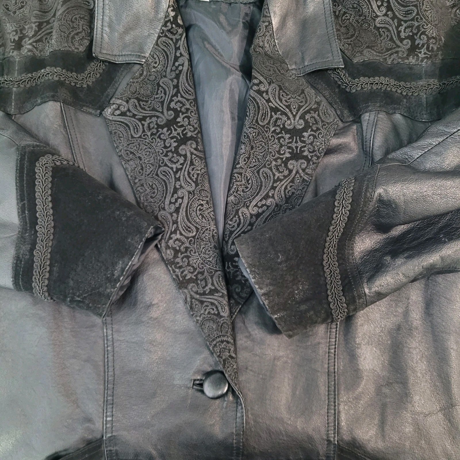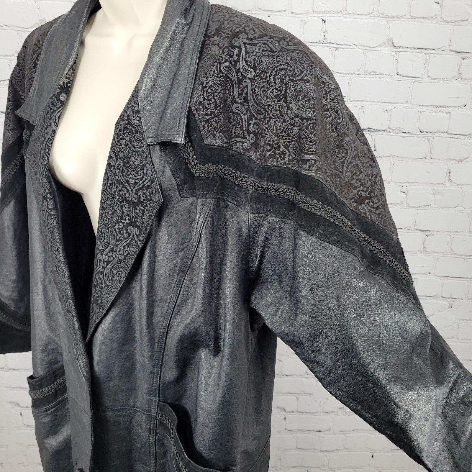 The VTG Winlit Black Genuine Leather Suede & Paisley Embroidered Jacket in size Large is a classic and retro-styled trench coat perfect for various occasions such as travel, parties, casual outings, and business events. Made with genuine leather and featuring paisley and embroidery accents, this long sleeve jacket has a button closure, nylon lining, and polyester insulation for added warmth during the winter, fall, and spring seasons. With a vintage vibe and timeless design, this jacket from the brand Winlit is a stylish addition to any woman's wardrobe, offering a classic fit with shoulder pads and pockets for added functionality.