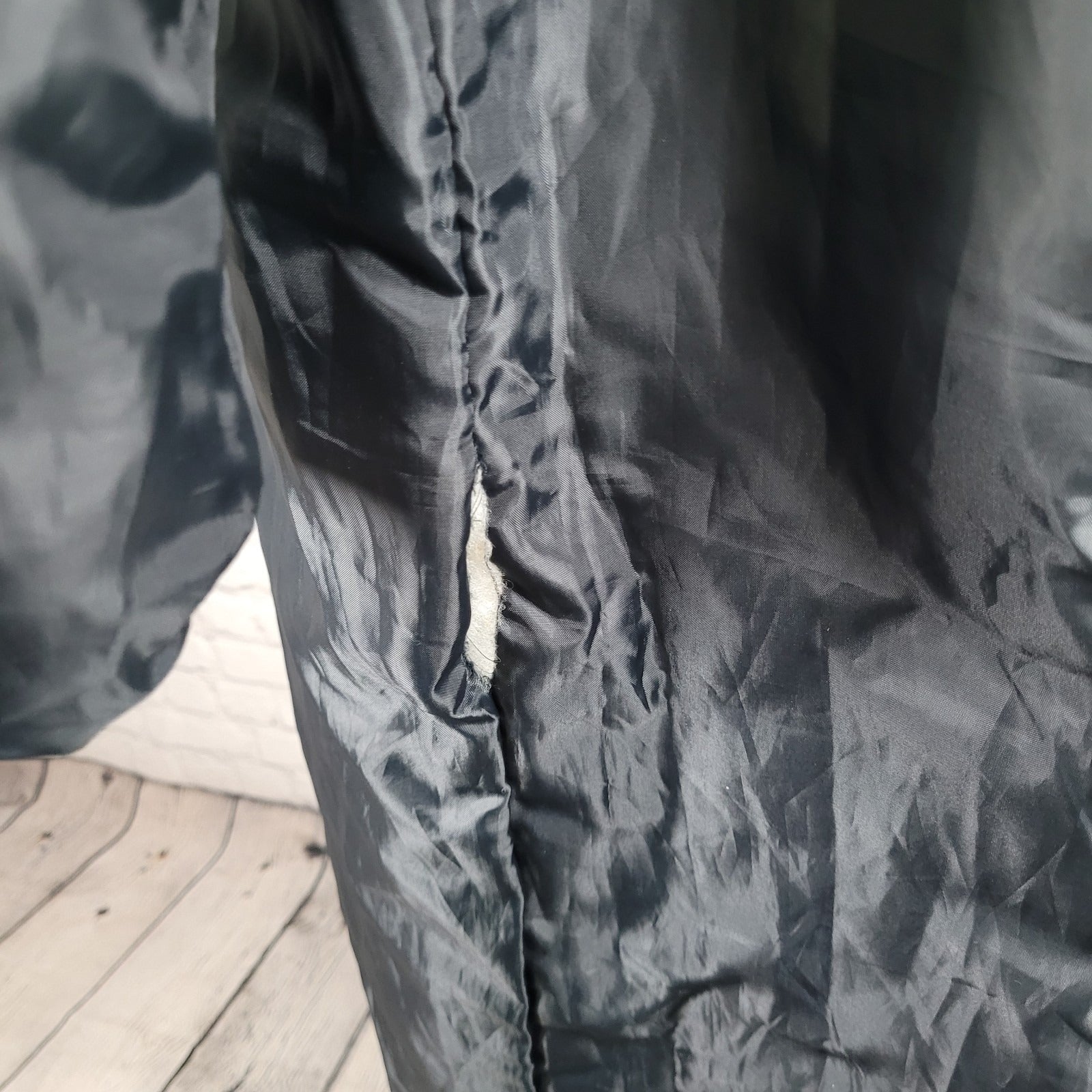 Tear to side lining stitching, small hole on back between shoulders, loose bottom closure button & light wear to cuffs, as pictured.