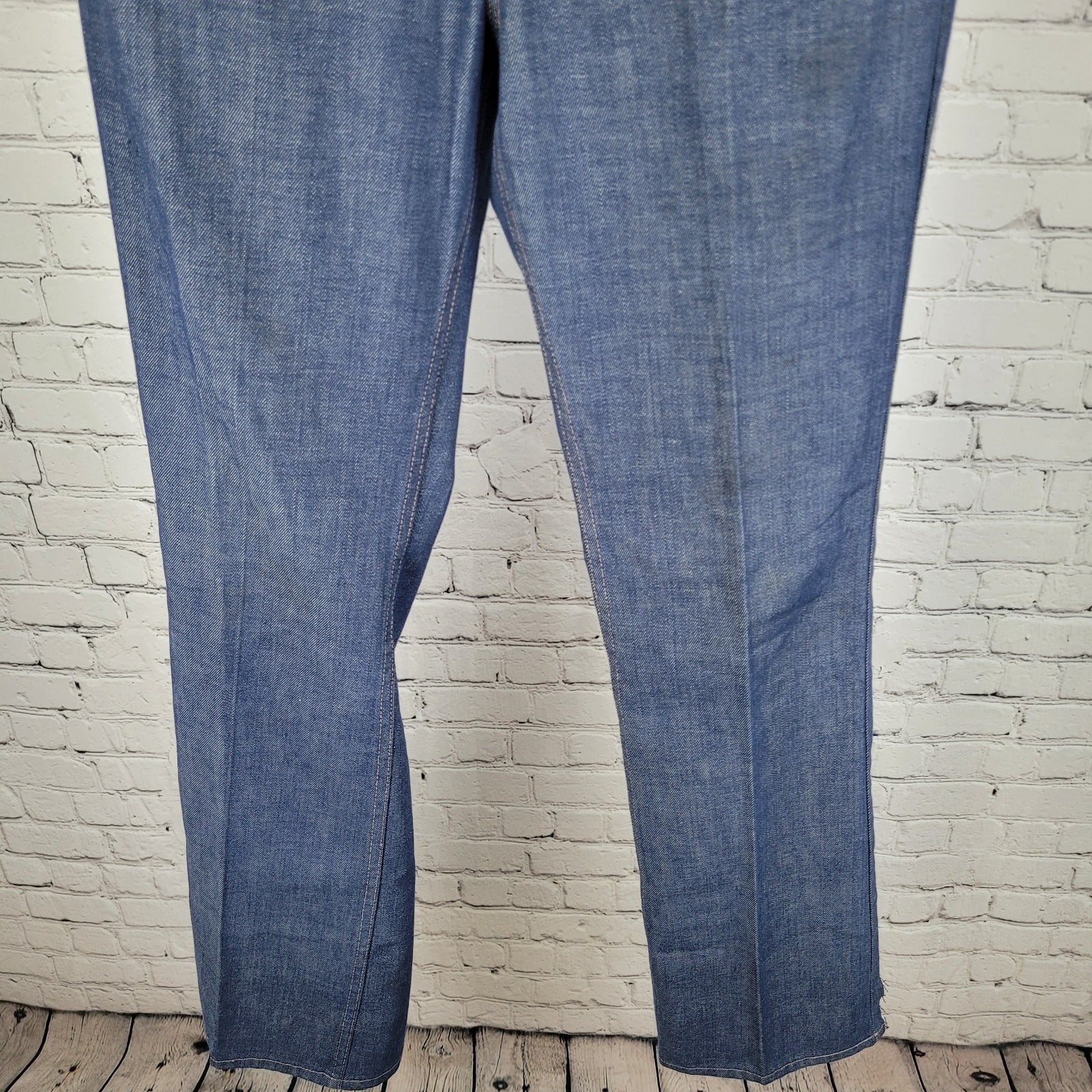 Faded size & materials label, back bottom hem cut and torn, hole in back thigh, and some pocket detail stitching missing, as pictured.